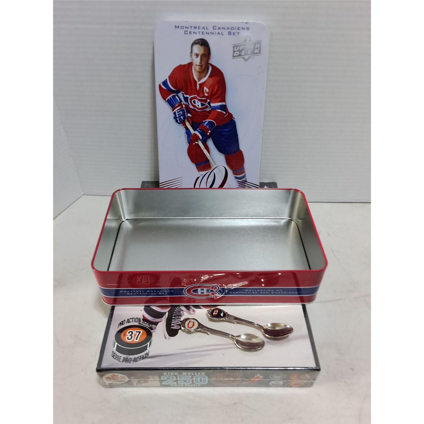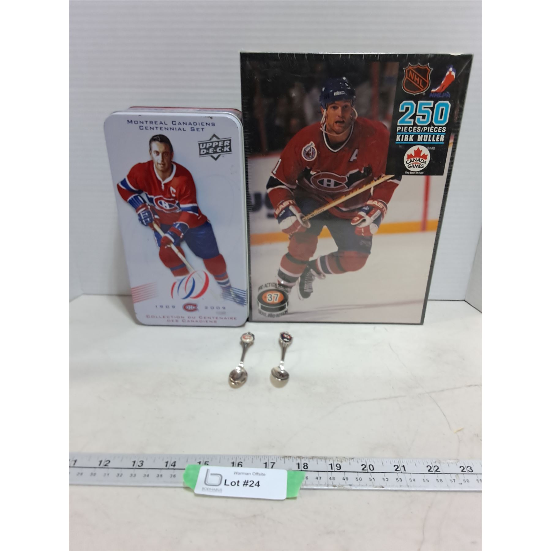 Lot 24 Montreal Canadiens Memorabilia (Upper Deck Tin, Sealed Kirk Muller Jigsaw, Souvenier Spoons)