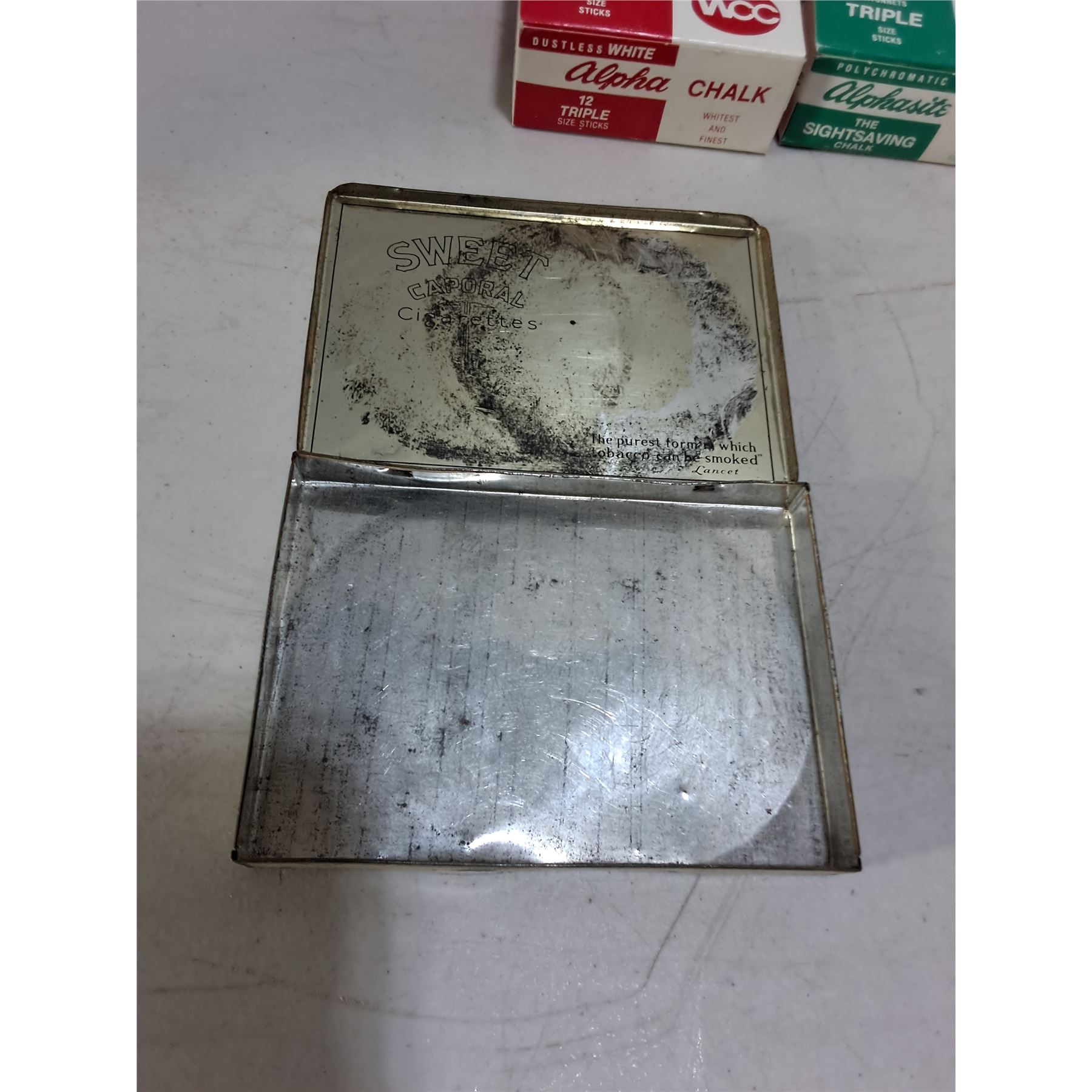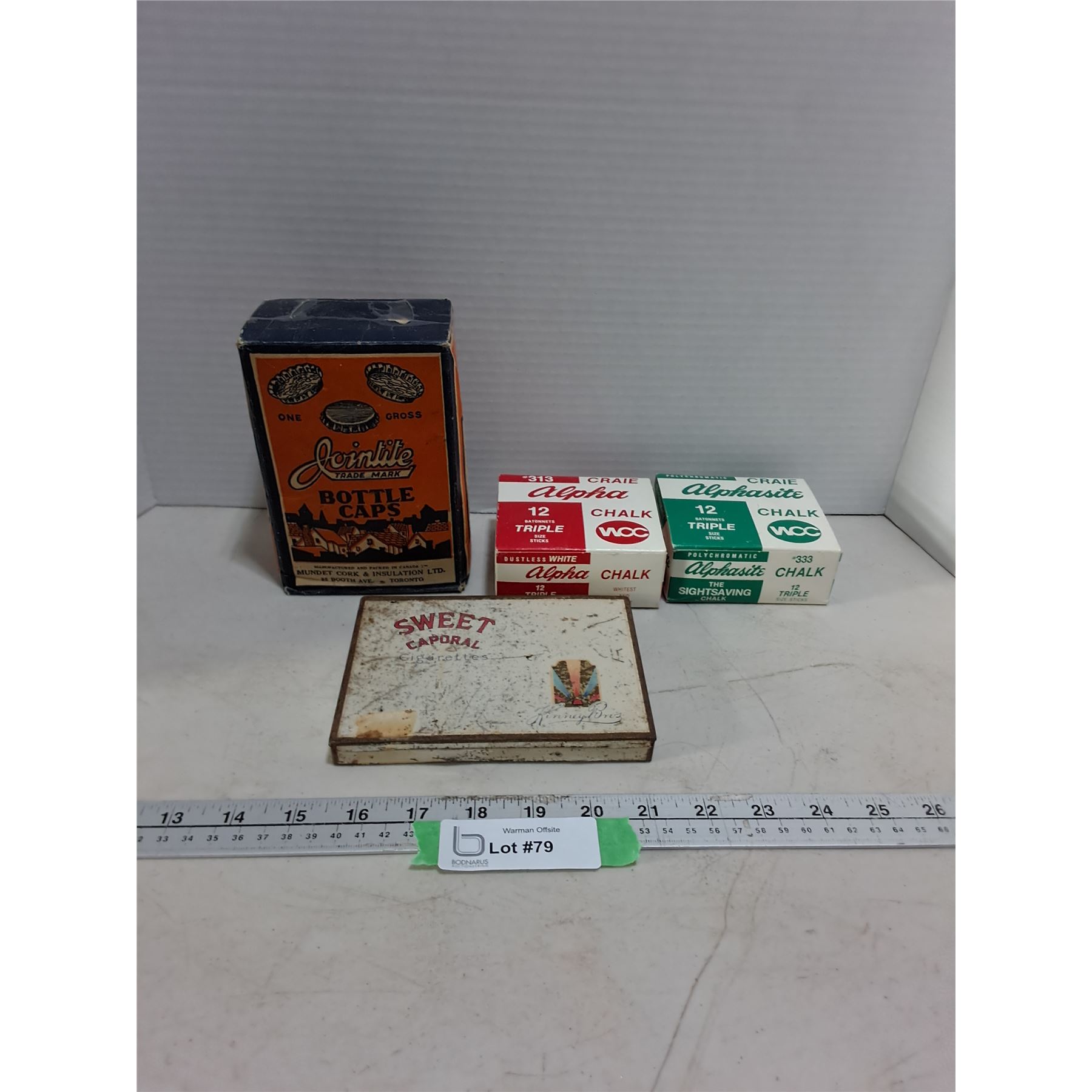 Lot 79 NOS Jointite Bottle Caps, Sweet Caporal Cigarette Tin, (2) Boxes of Alpha Chalk
