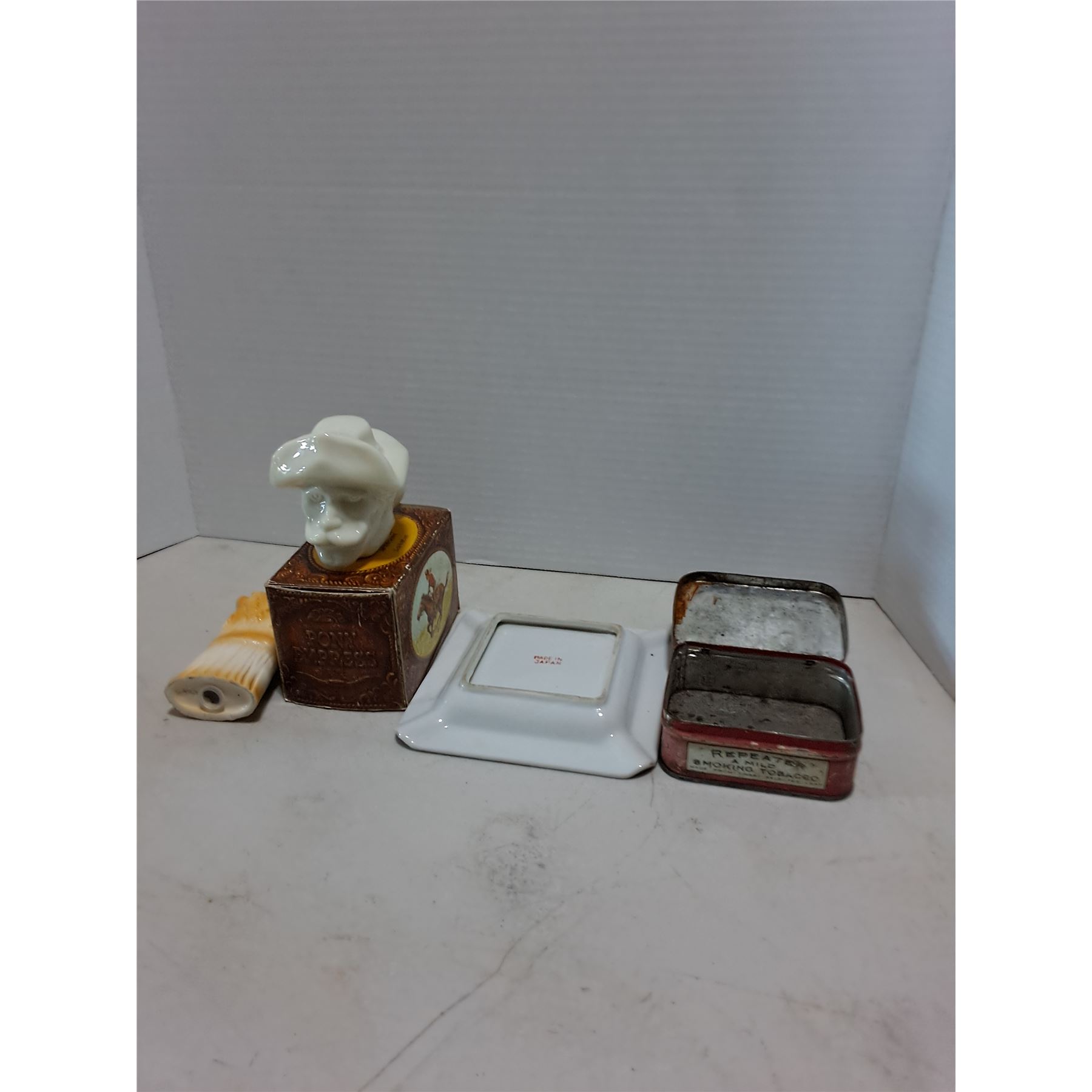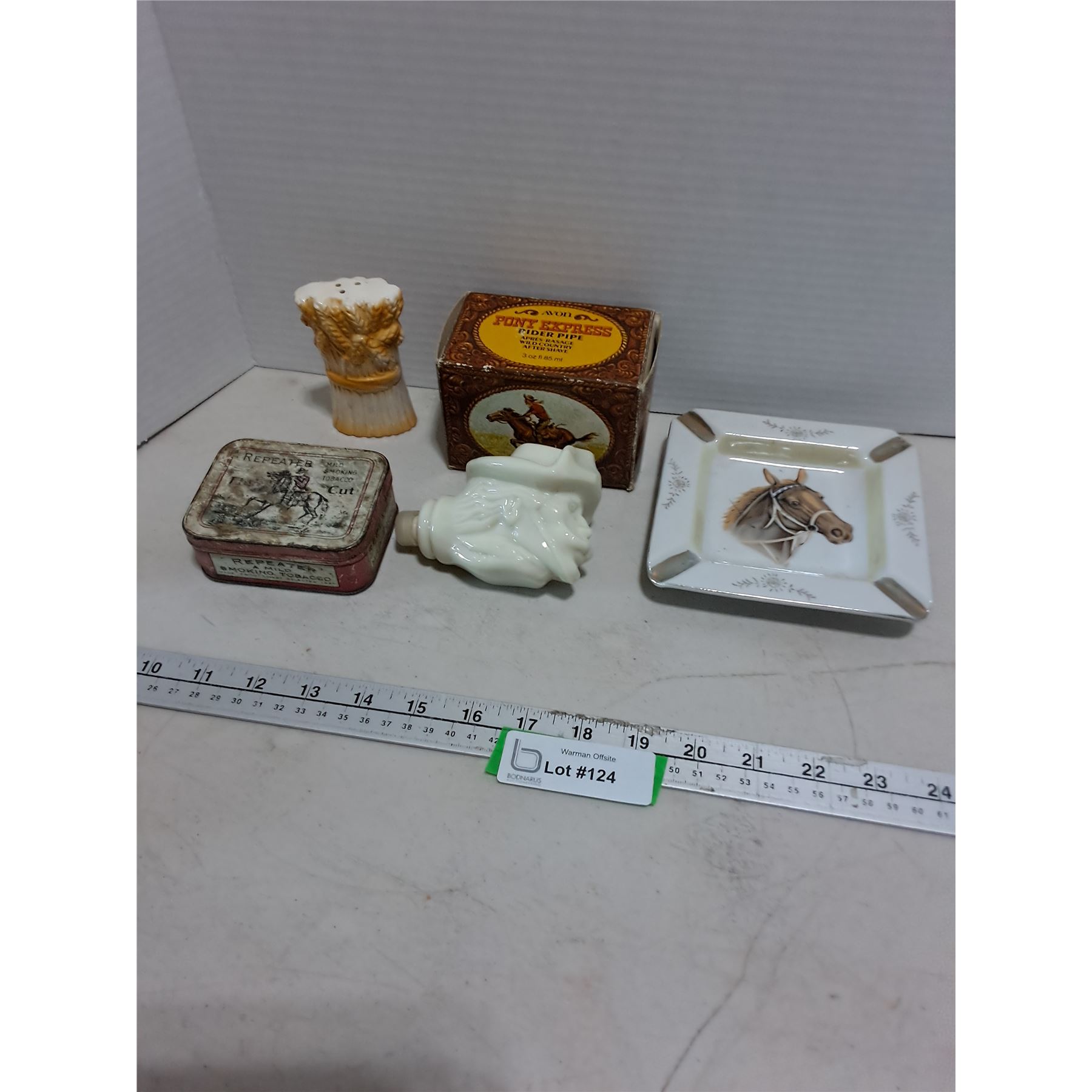 Lot 124 Old West Inspired Ornaments (Avon Bottle, Ash Tray, Tobacco Tin, Wheat Shaker)