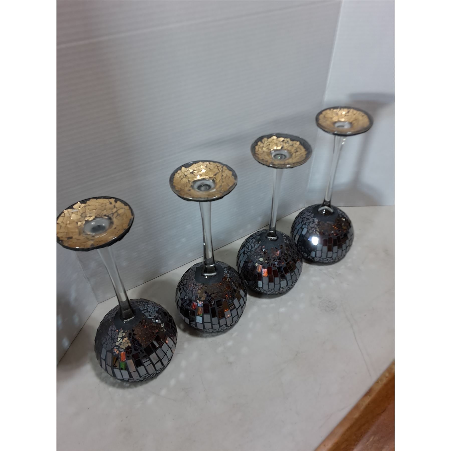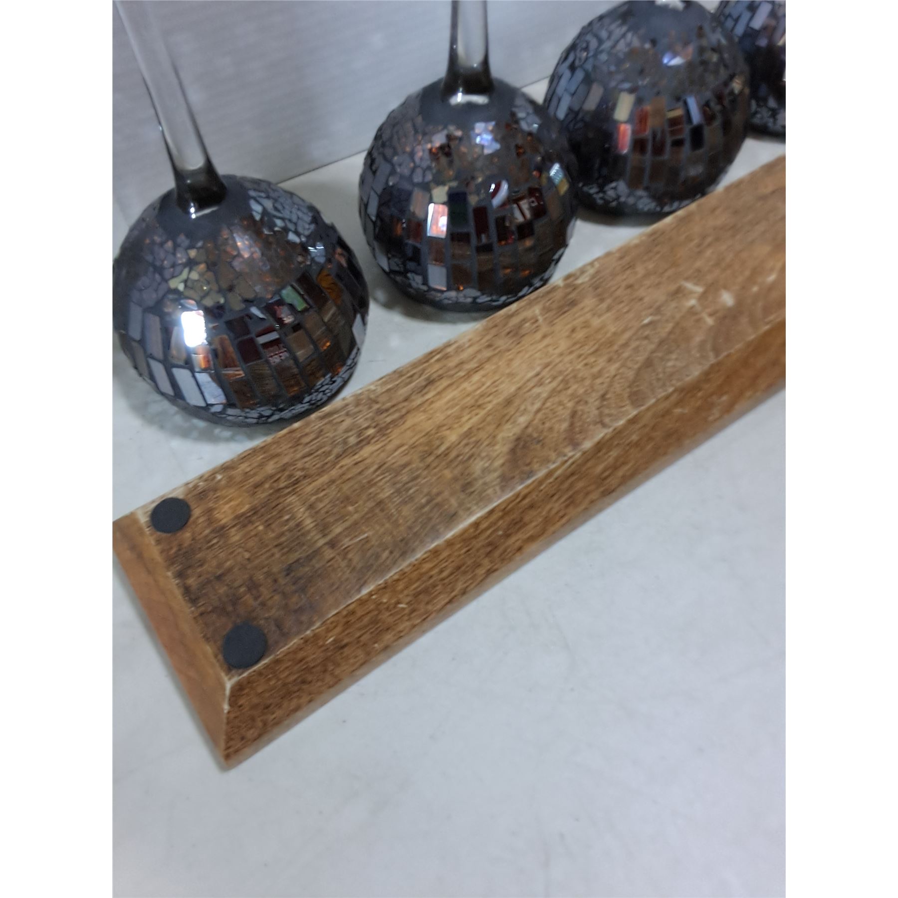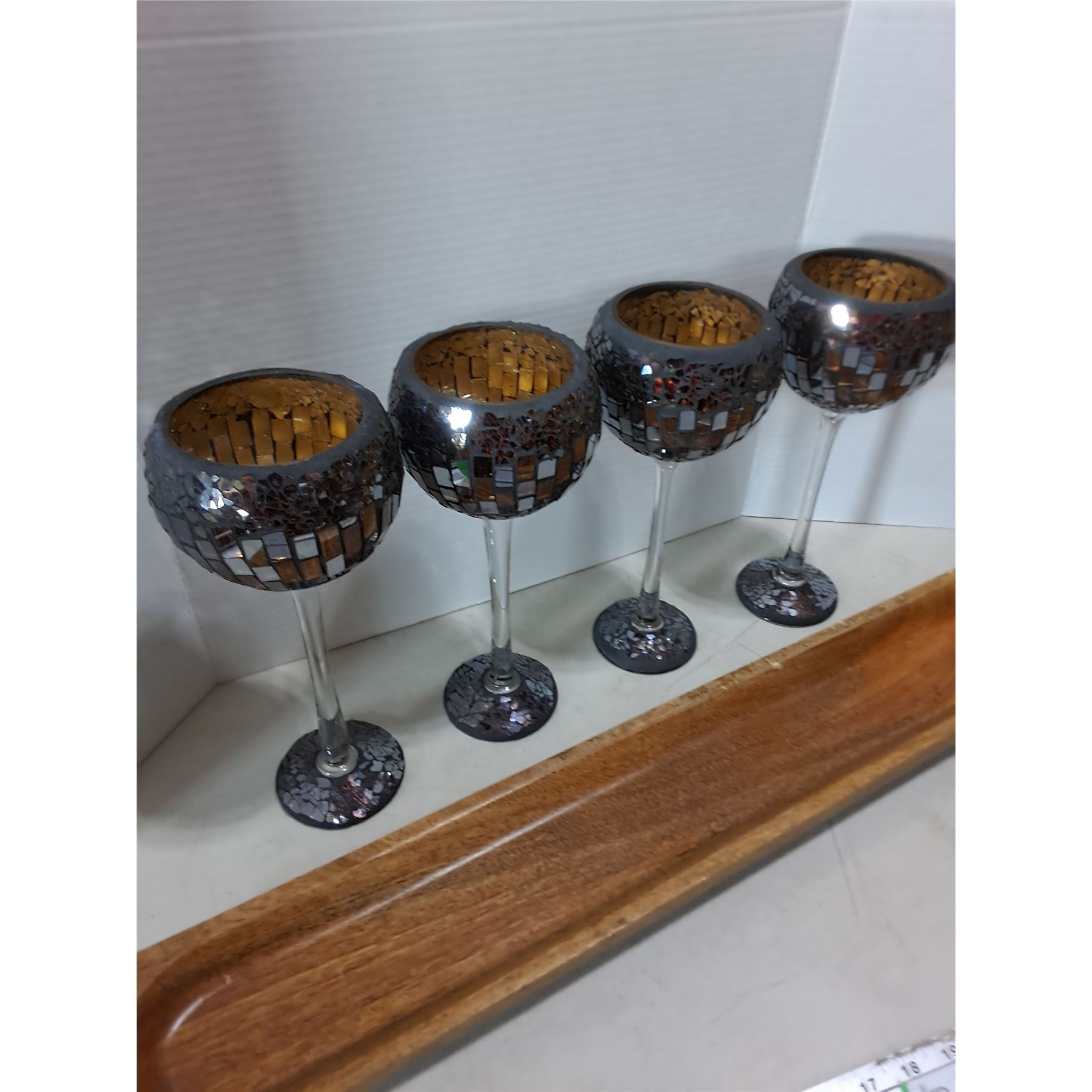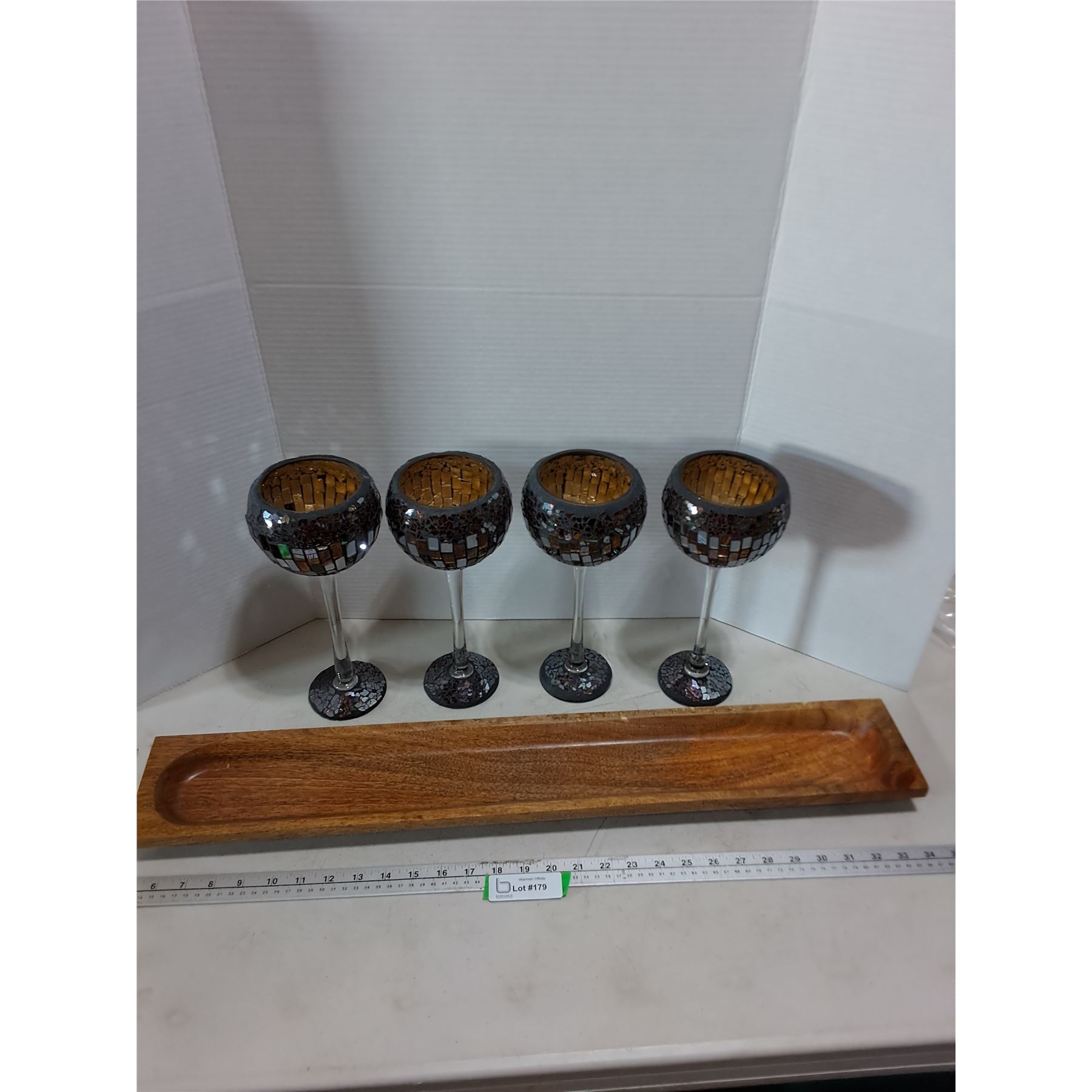 Lot 179 Set of 4 Cracked Glass Candle Holders, 29.5" Mango Wood Platter