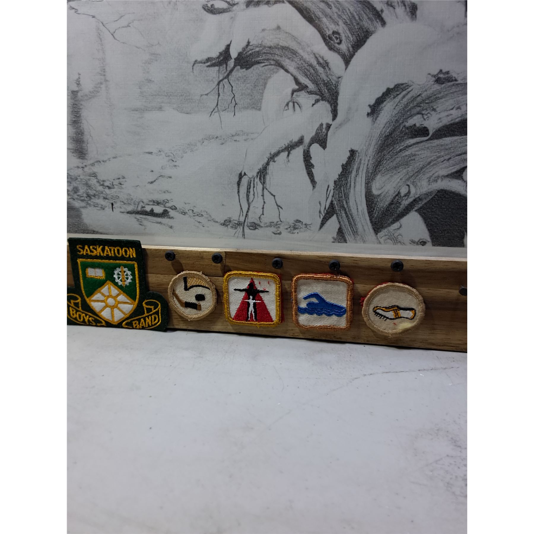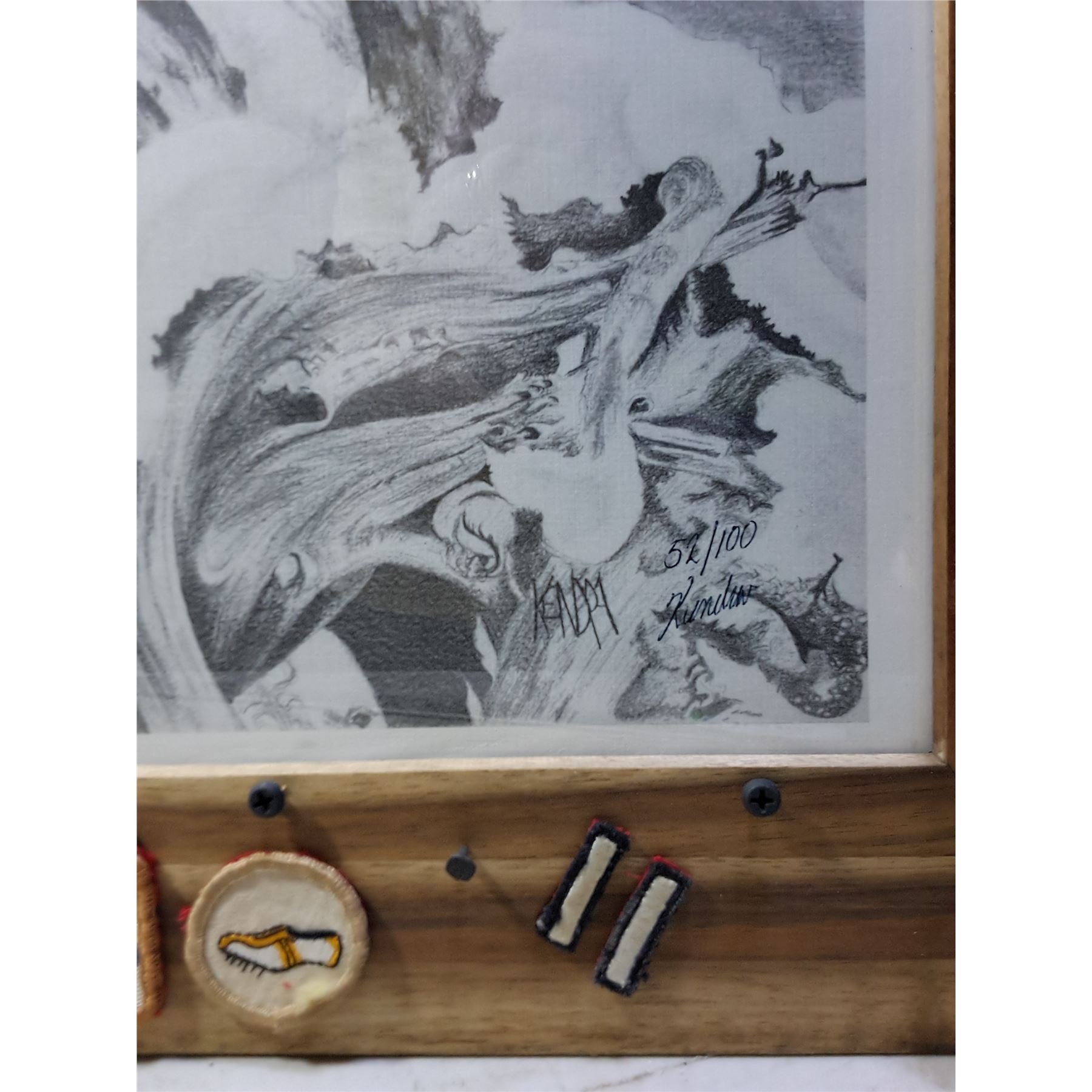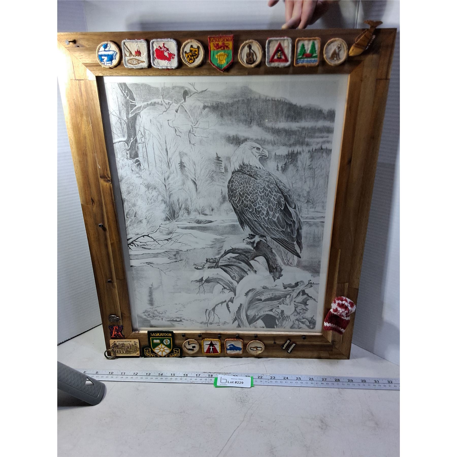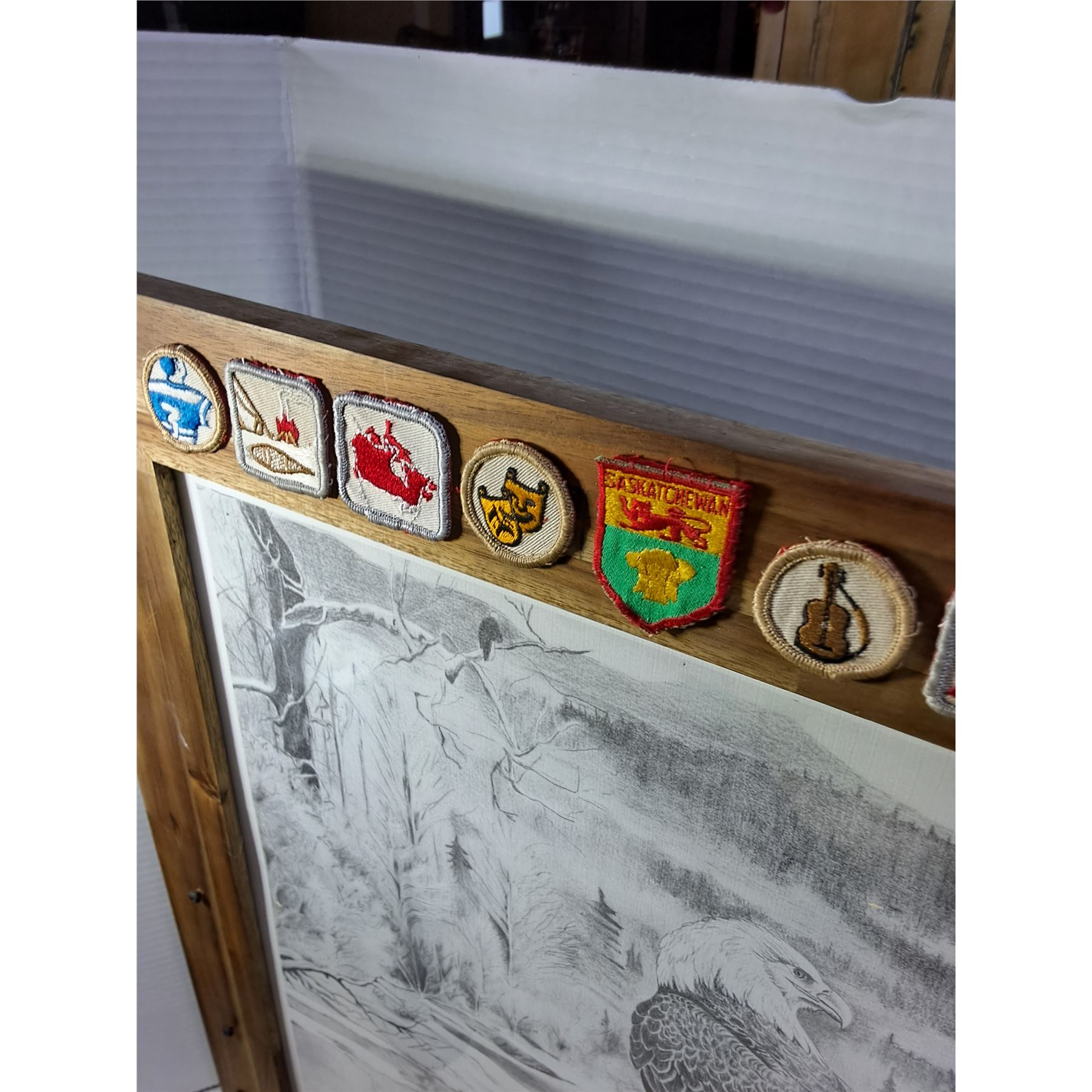 Lot 229 Vintage Wood Framed Charcoal Sketch Print 52/100 - 20" x 25" w/Glued Scout Badges - PICK UP