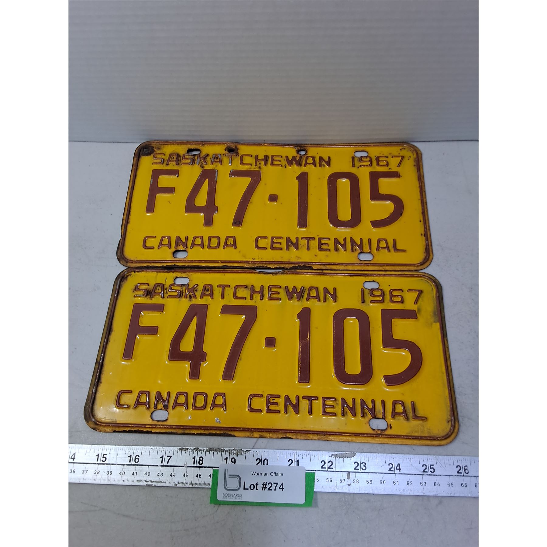 Lot 274 Pair of 1967 Saskatchewan Centennial License Plates
