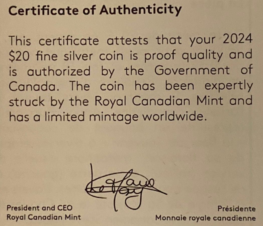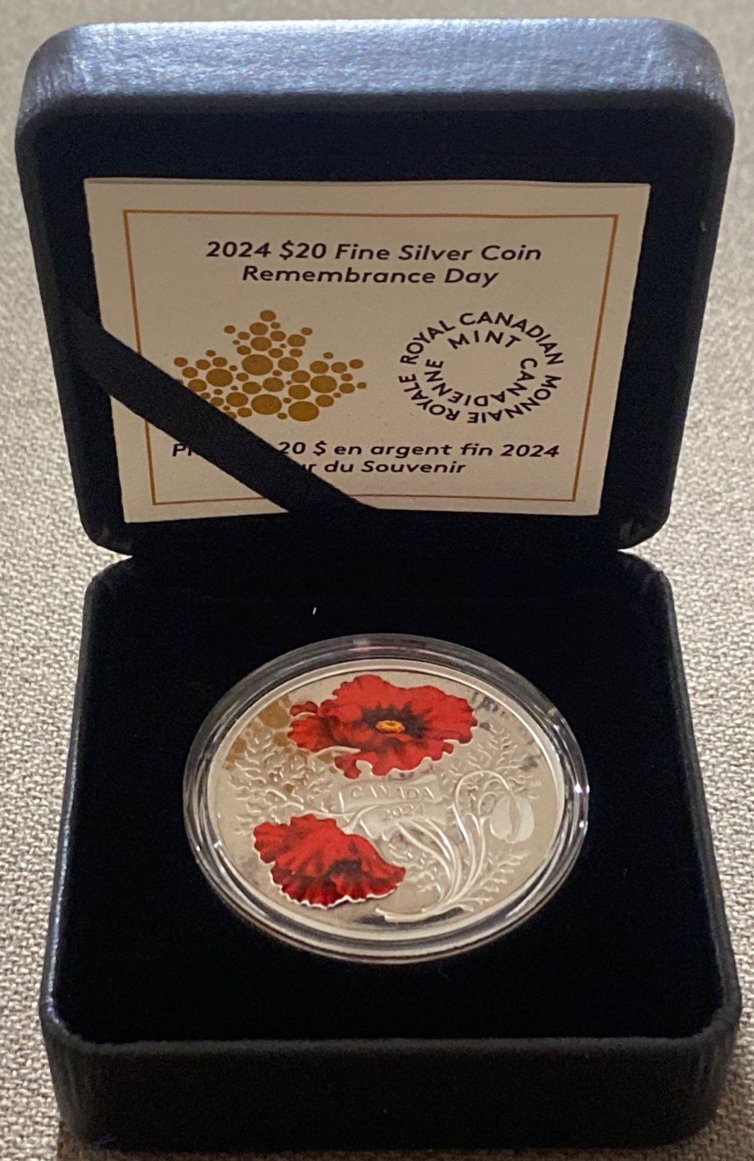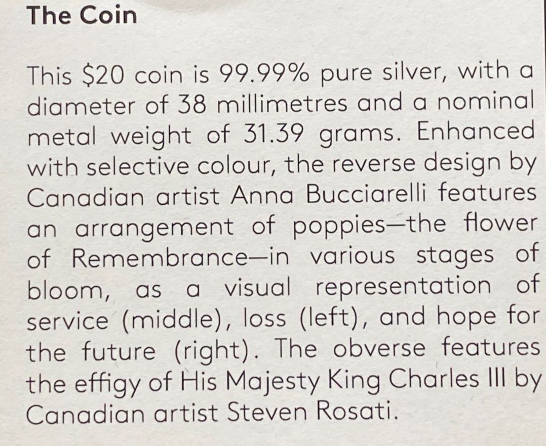 Lot 113 2024 $20 Remembrance Day Fine Silver Coin 31.39 Grams
