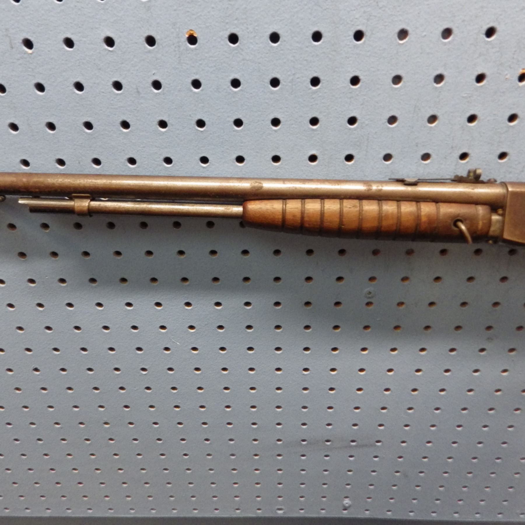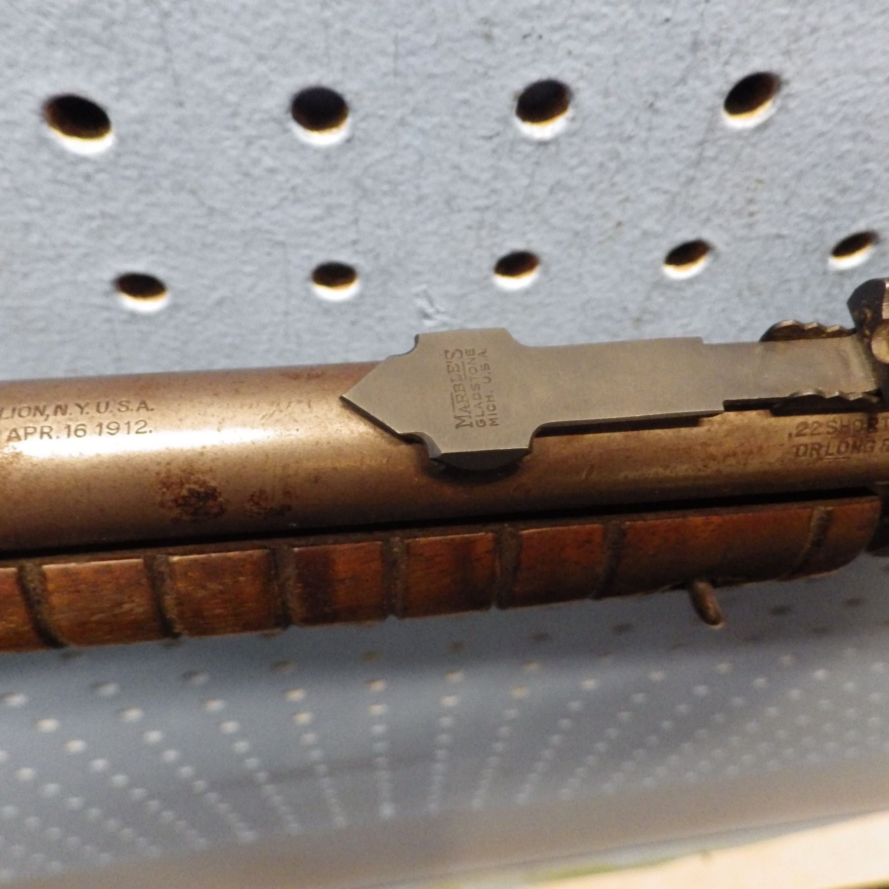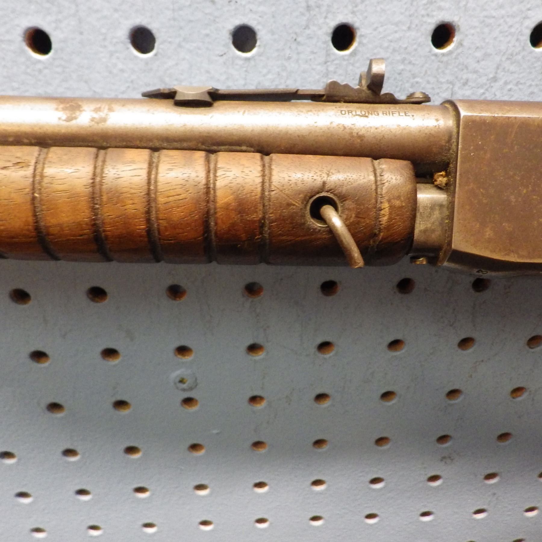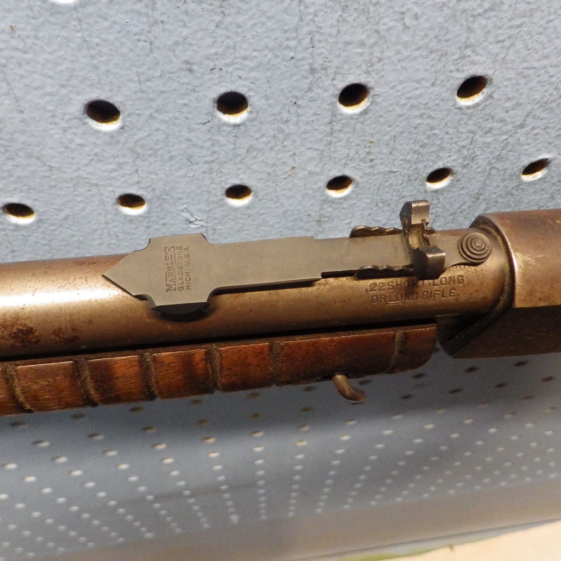 Remington Model 12 , pump action , 22 S-L-LR , 22 inch barrel , tube magazine damaged and missing parts , Marble's buckhorn rear sight , SERIAL # 266913