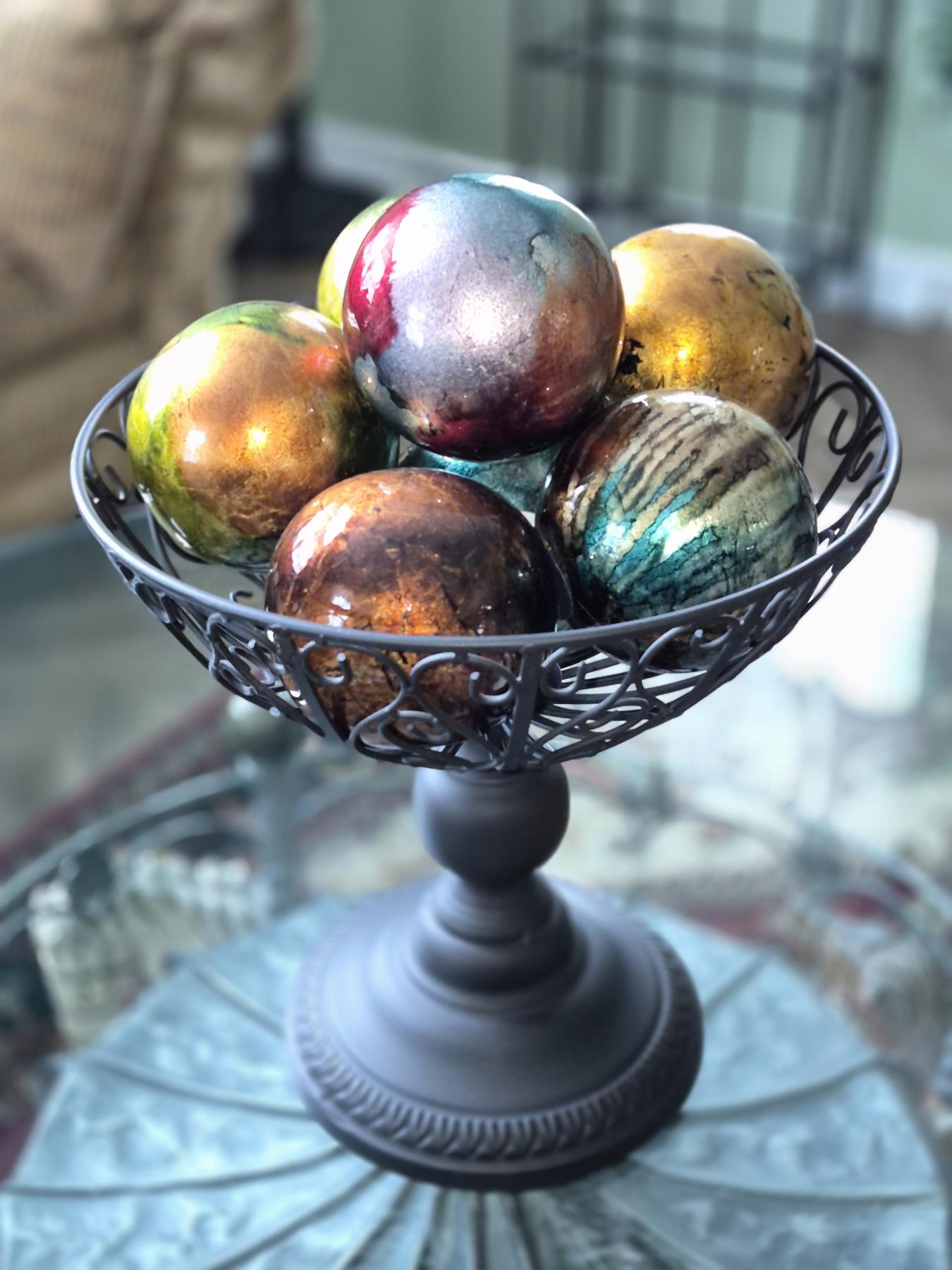 Lot 38DN PICKUP IN NORTHFIELD - Centerpiece Metal Decor Compote As shown With 7 Iridescent Orbs - See Pics
