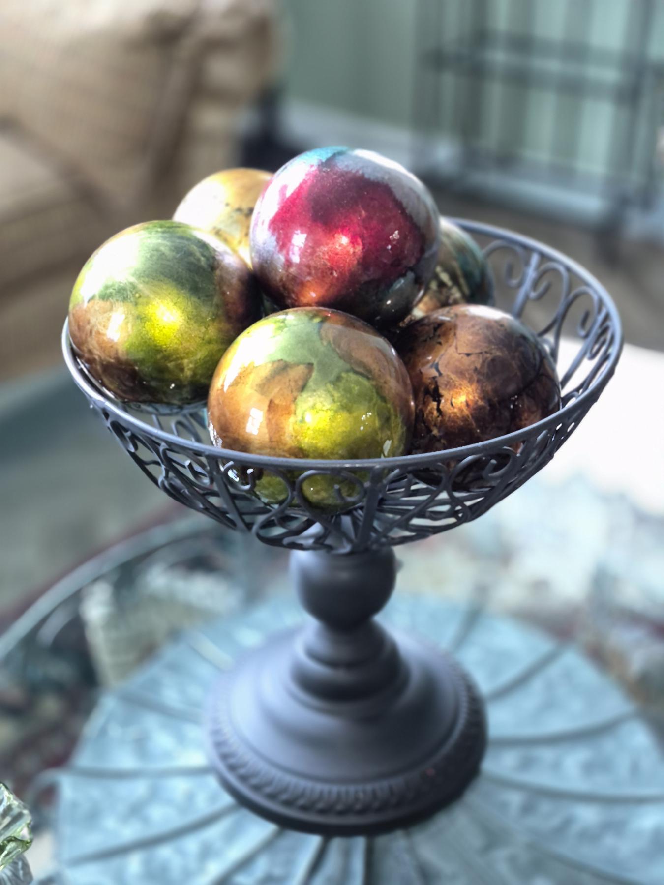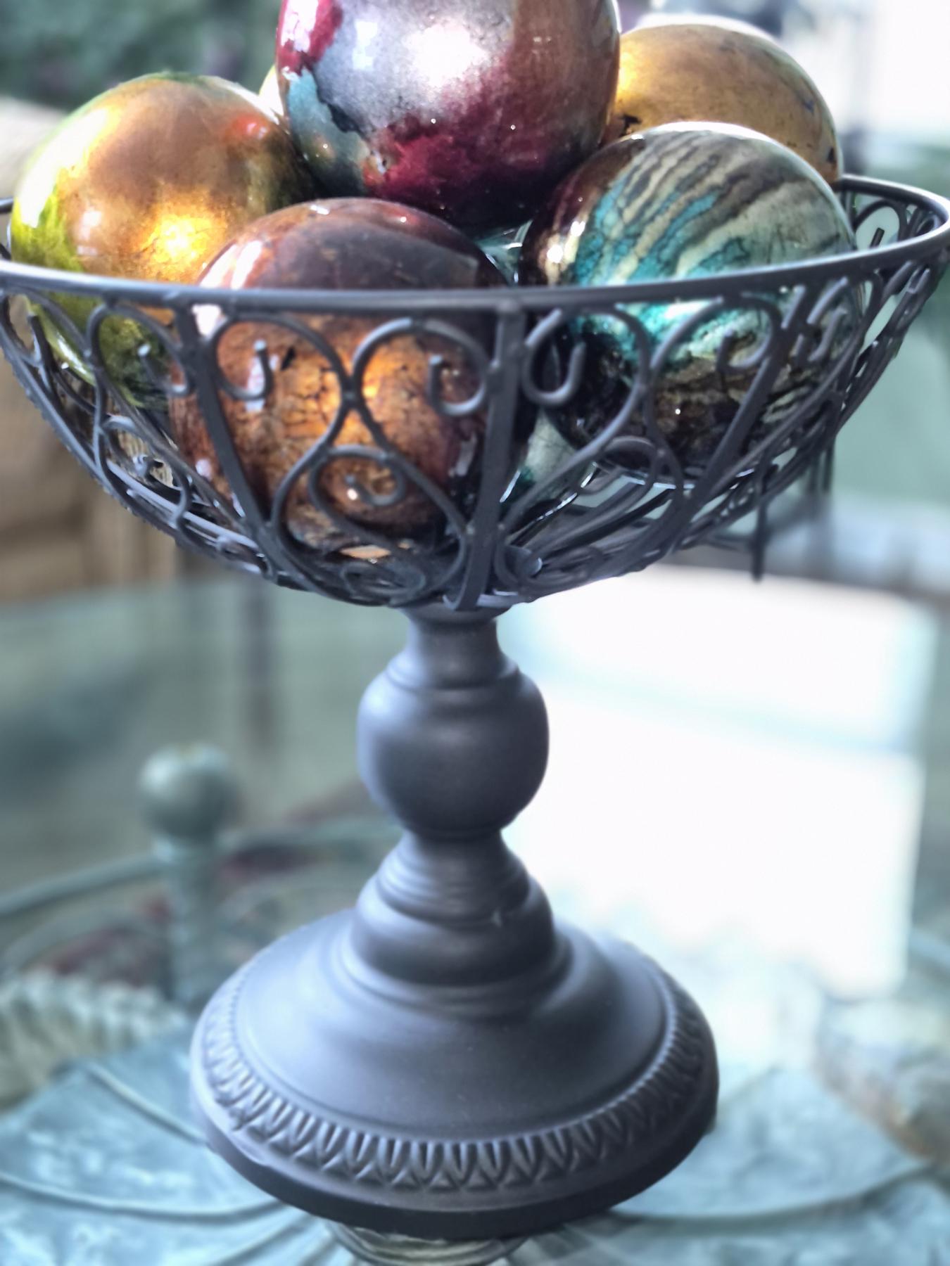 PICKUP IN NORTHFIELD - Centerpiece Metal Decor Compote As shown With 7 Iridescent Orbs - See Pics - (All Items noting "Pickup In Northfield" will be available the following Saturday after this auction ends. Other items in this auction will be available at our Louisville Office. Winners of Northfield items will be notified with the address and times, after the auction closes.)