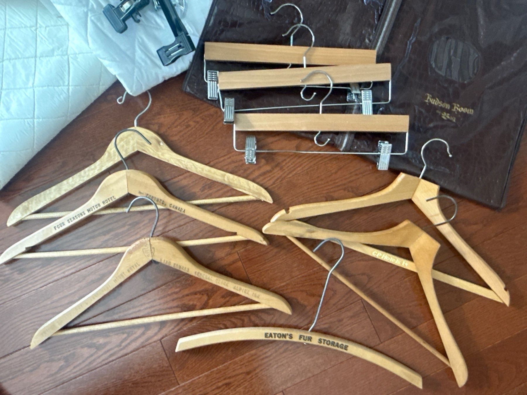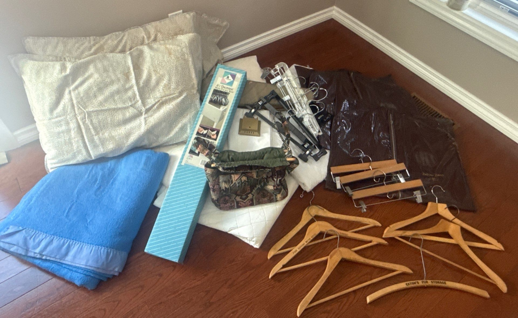 Lot 181 Wood Hangers Wool Blanket Garment Bags Plush Pillows & more