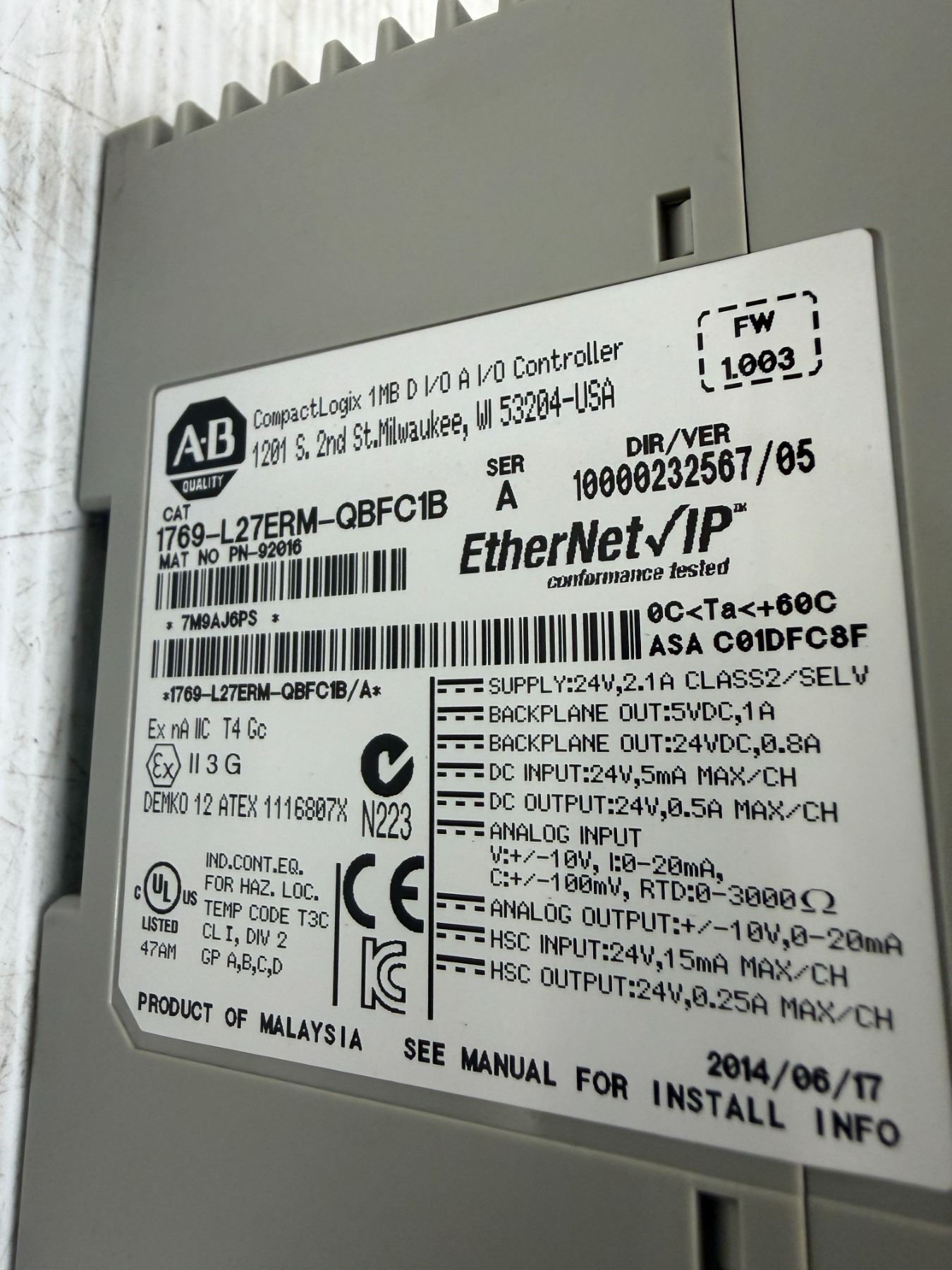 Allen-Bradley #1769-L27ERM-QBFC1B / #PN-92016 Plus #1769-IQ16 & # 1769-OB16