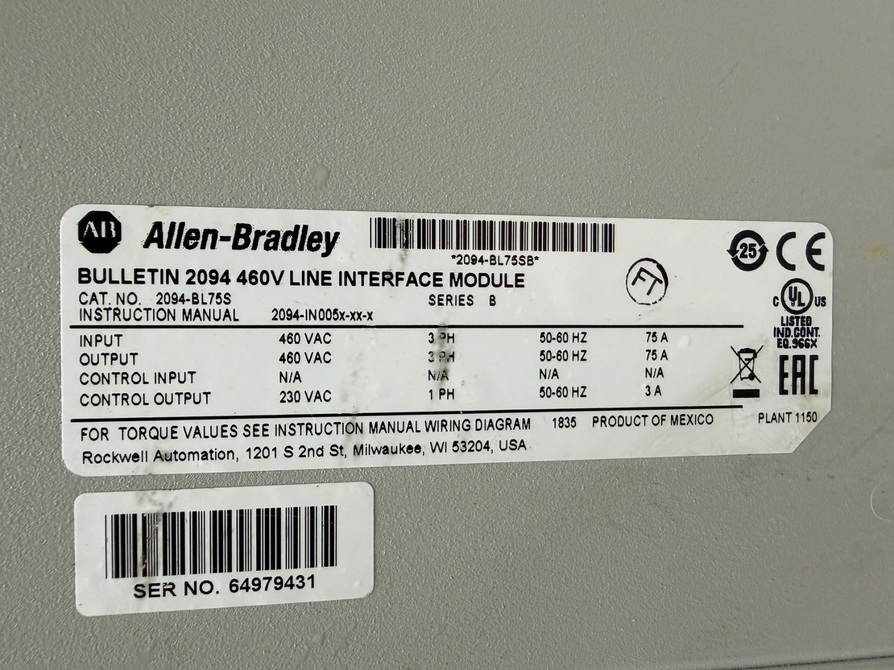 Allen-Bradley #2094-BL75S Bulletin 2094 460V Line Interface Module