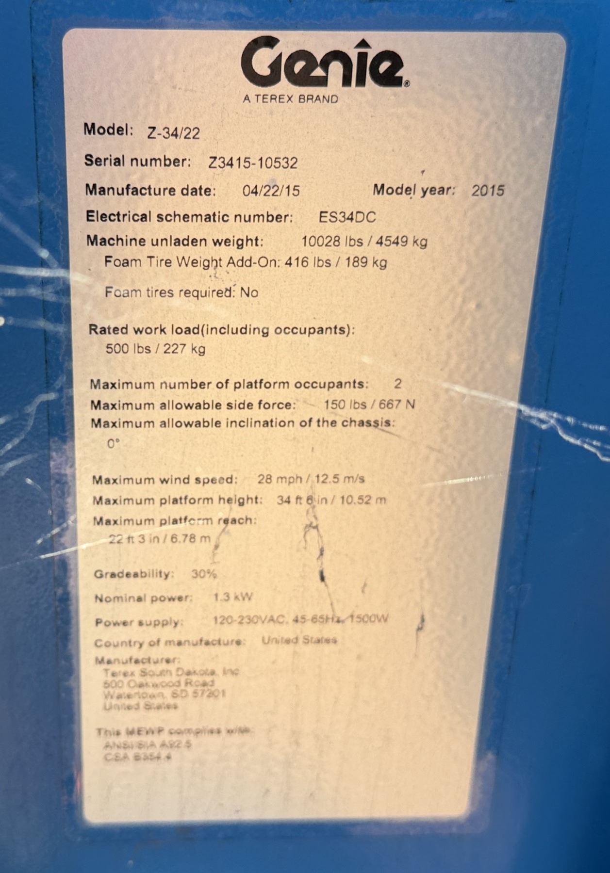 Lot 9 (867331) 2015 Genie Z34/22N 2WD Electric Articulating Boom Lift (Starts & Runs See Video)