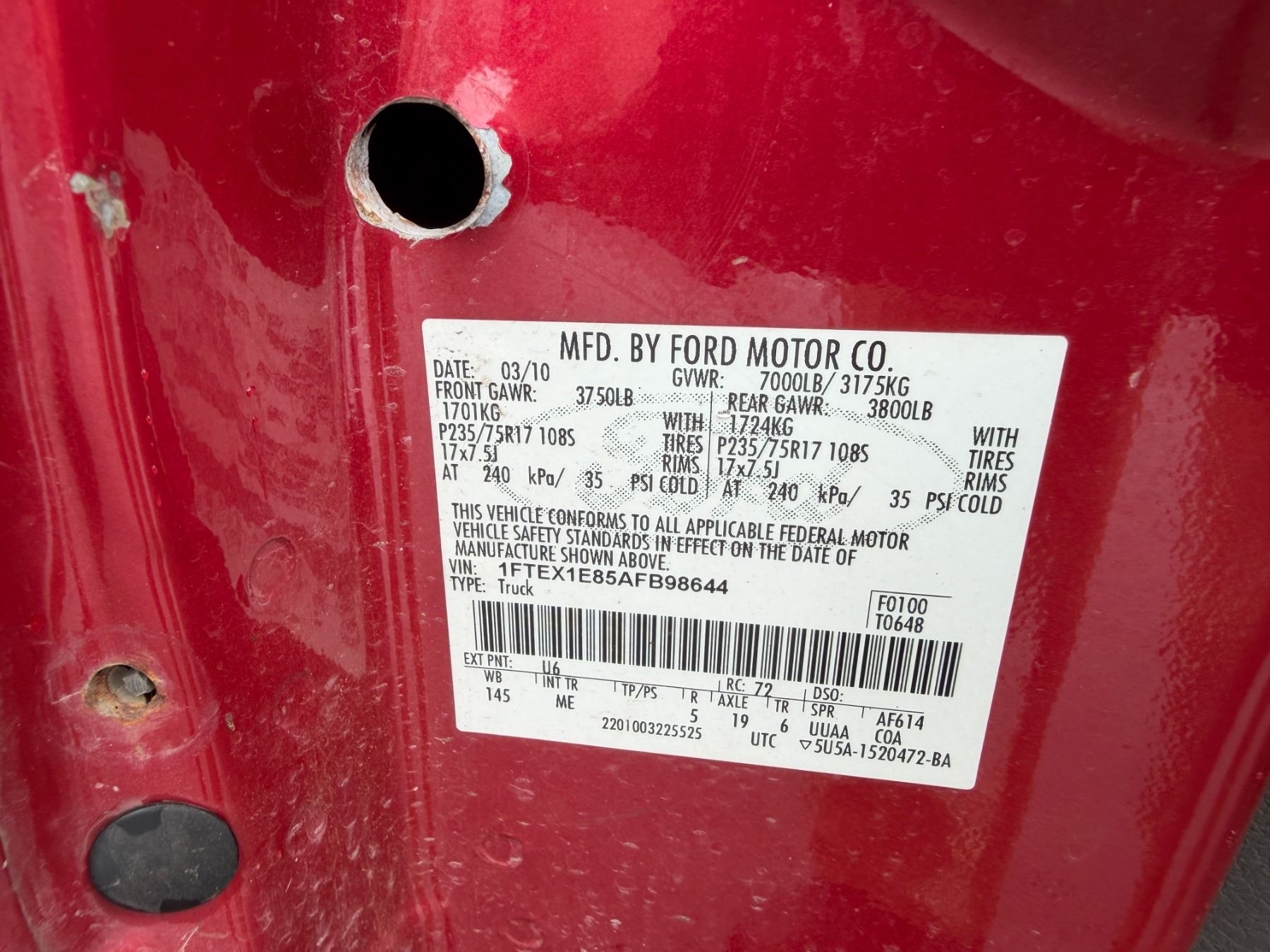 2010 Ford F150 4X4 Pickup Truck. Lic. ZBB970 (Starts & Runs - See Video). Registration expires March 2027.