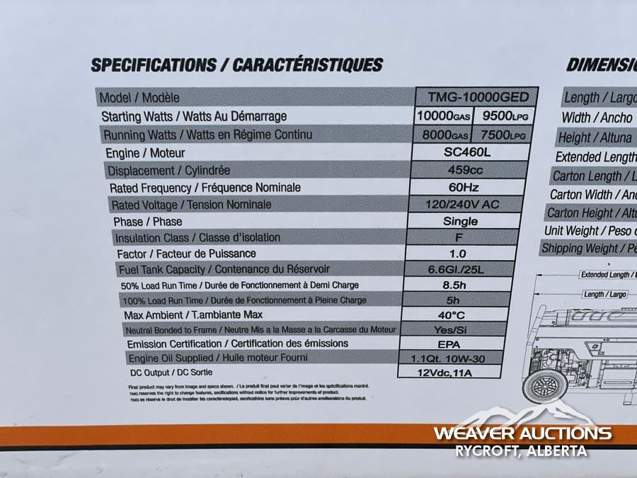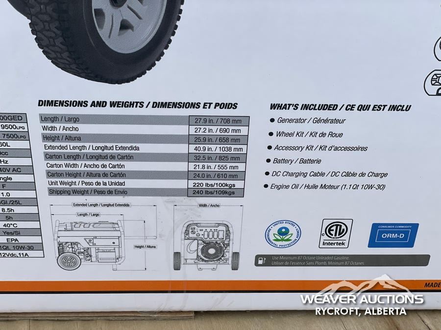 Specifications: *UNUSED, ELECTRIC START, 8.5 HOUR RUN TIME