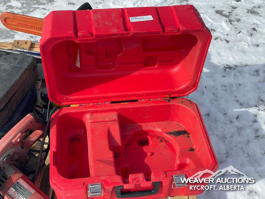 Lot 1063 MILWAUKEE TOOL BOX W/GREASE GUNS & CHAIN SAW
