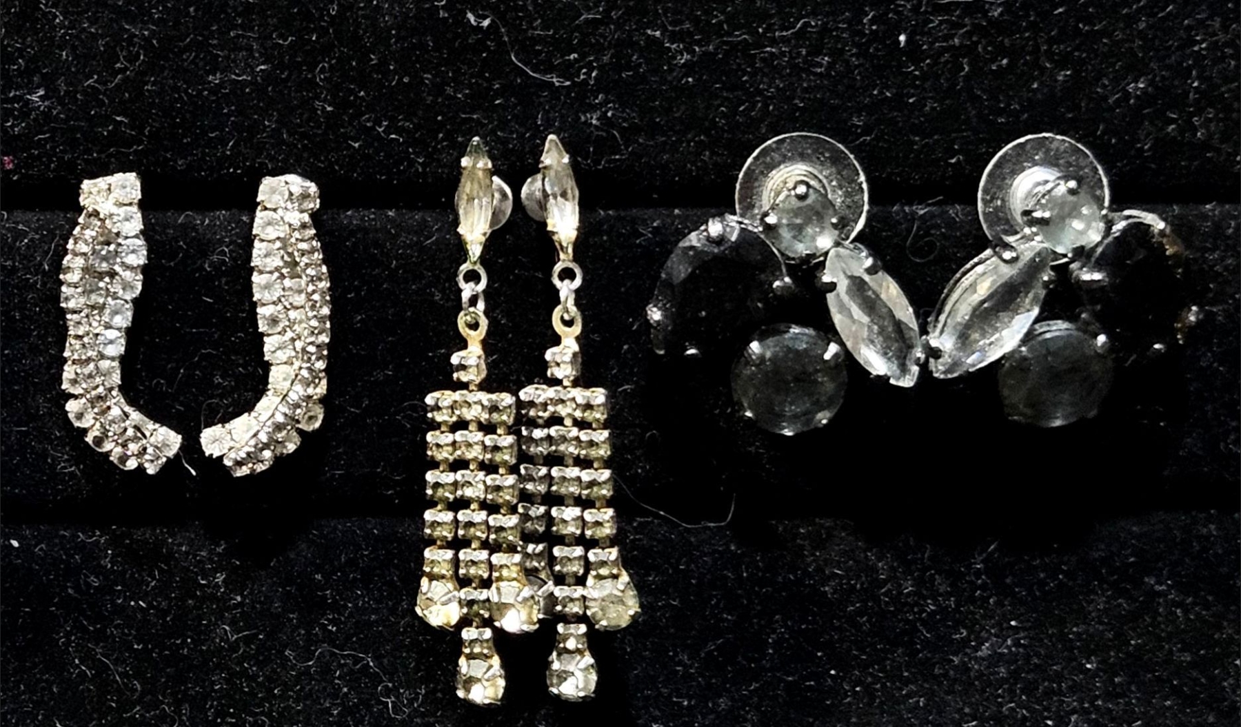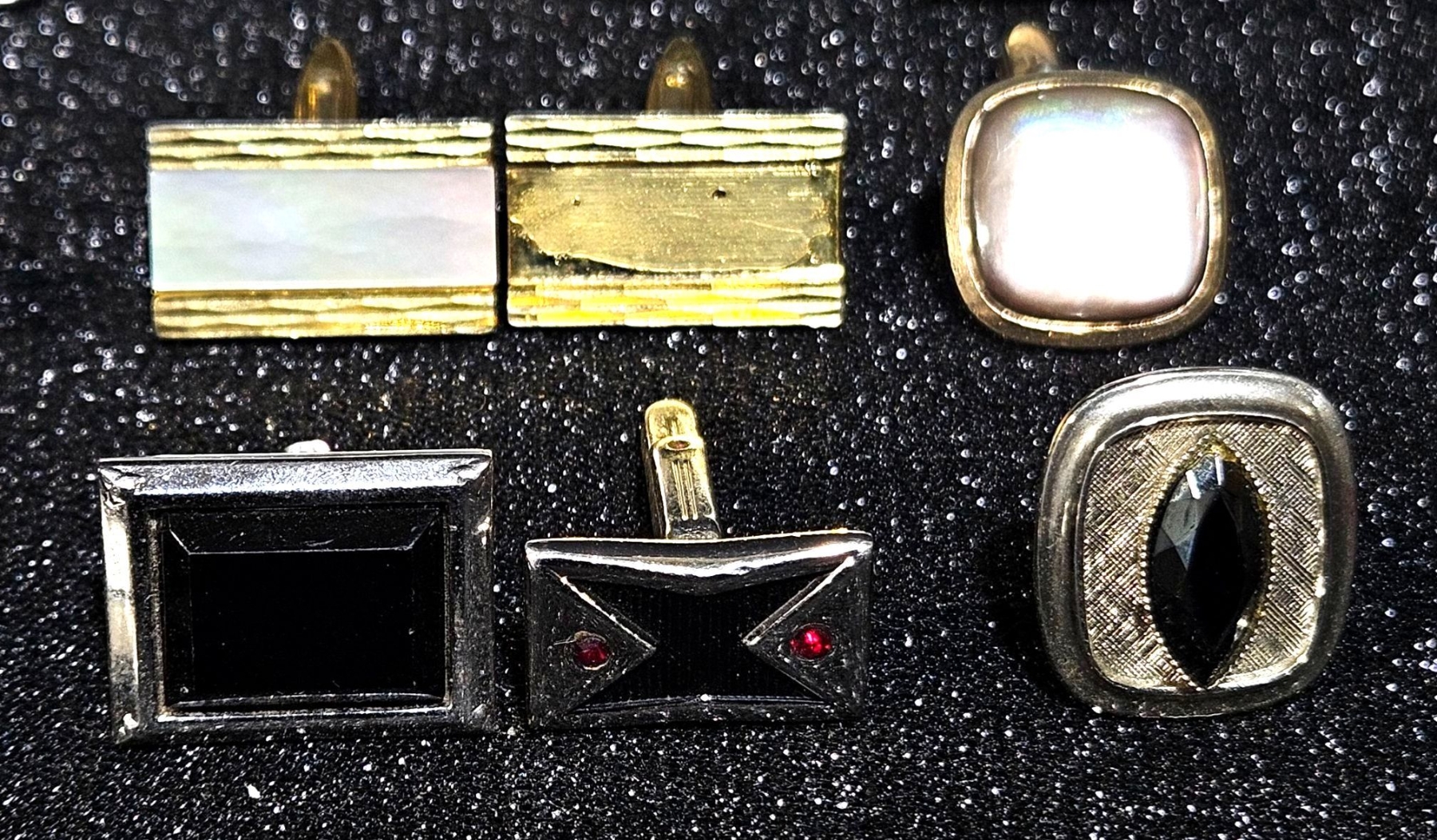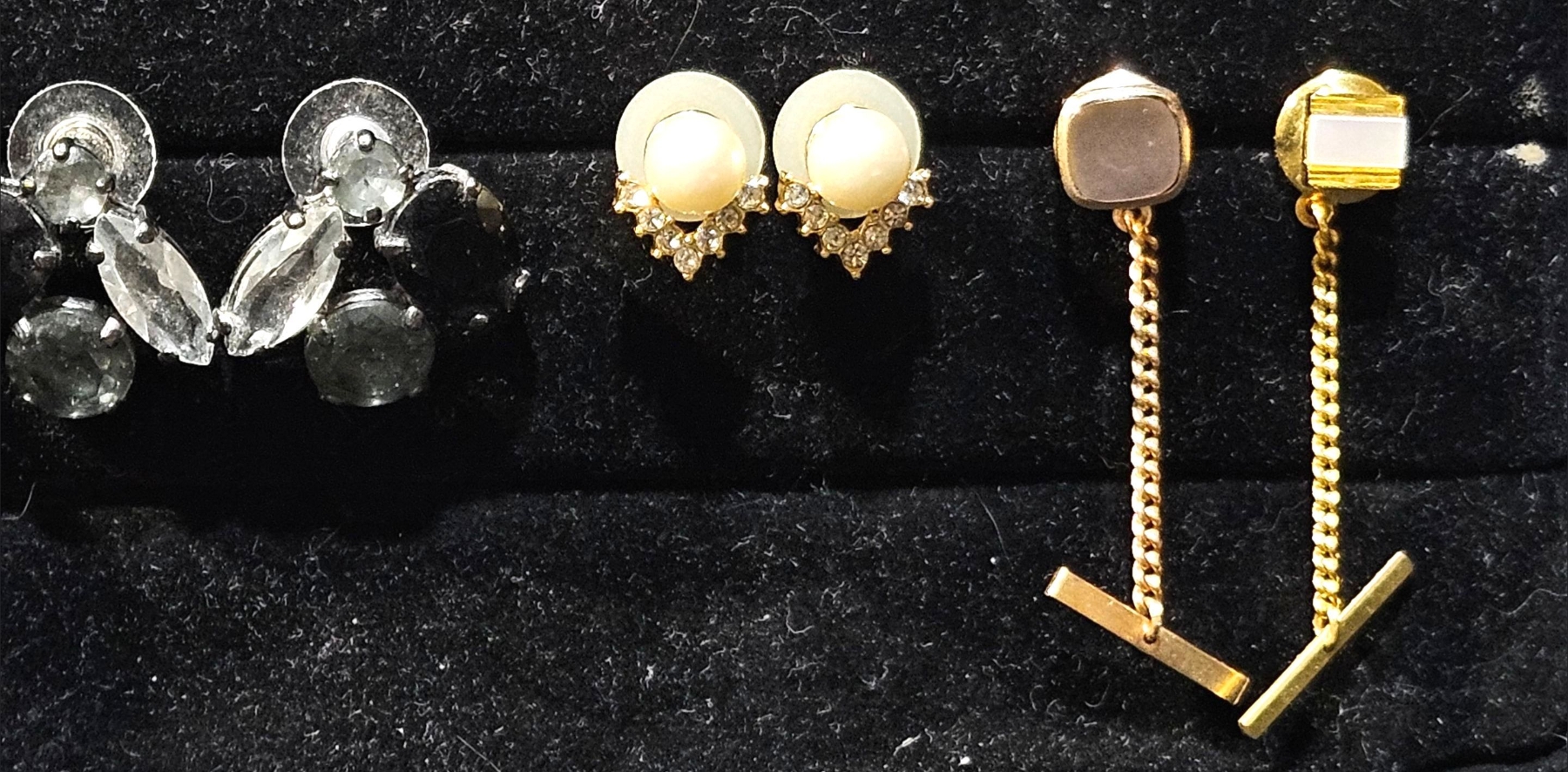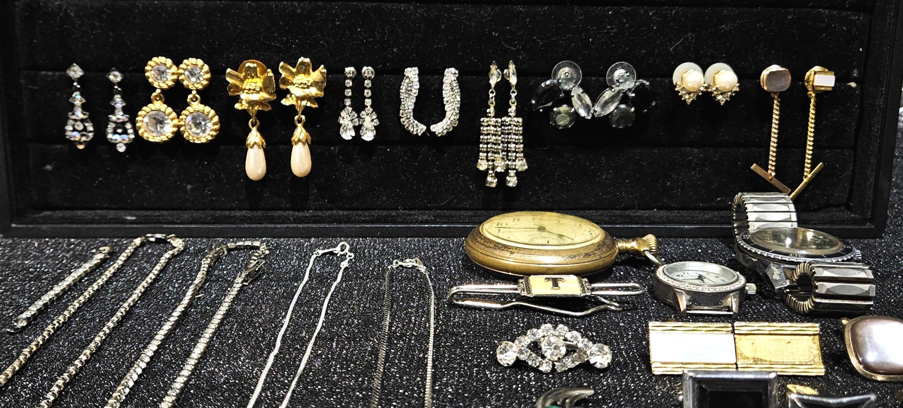 Large assortment of different jewelry, including various sets of earrings that dazzle in the light. Various sets of vintage cufflinks can also be found in this lot, as well as multiple pocket watch faces.