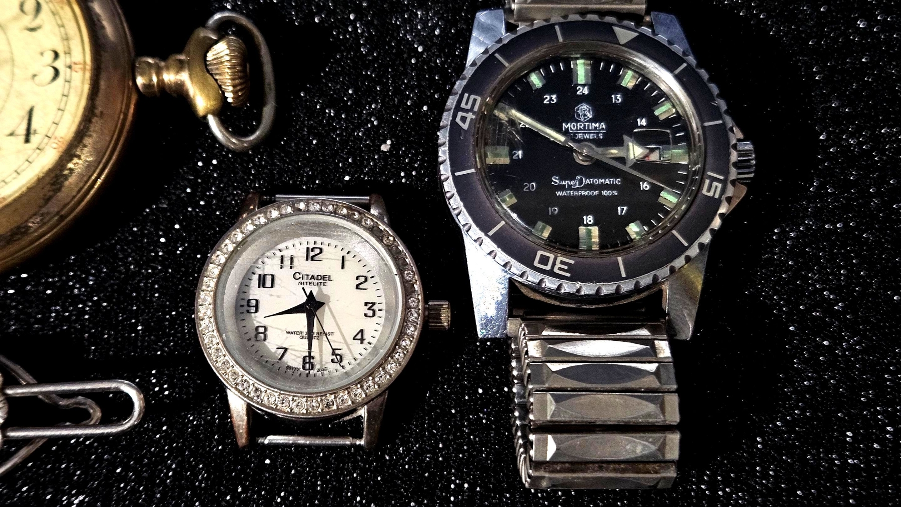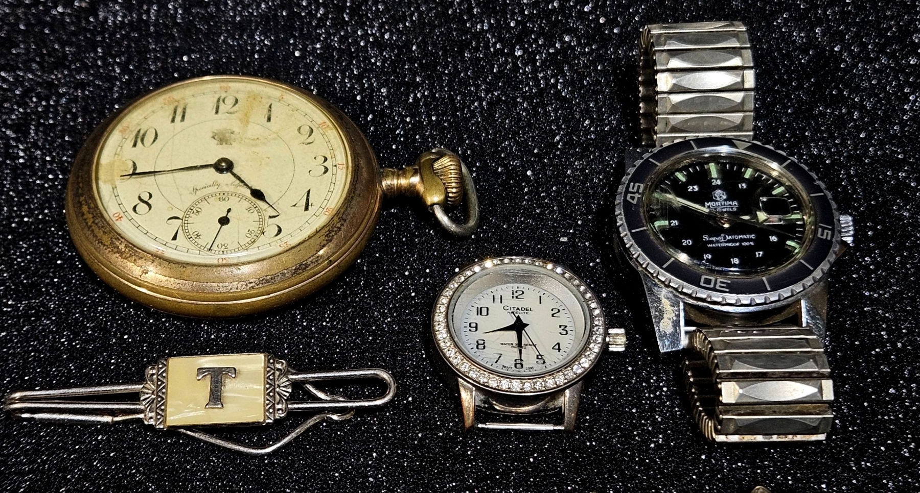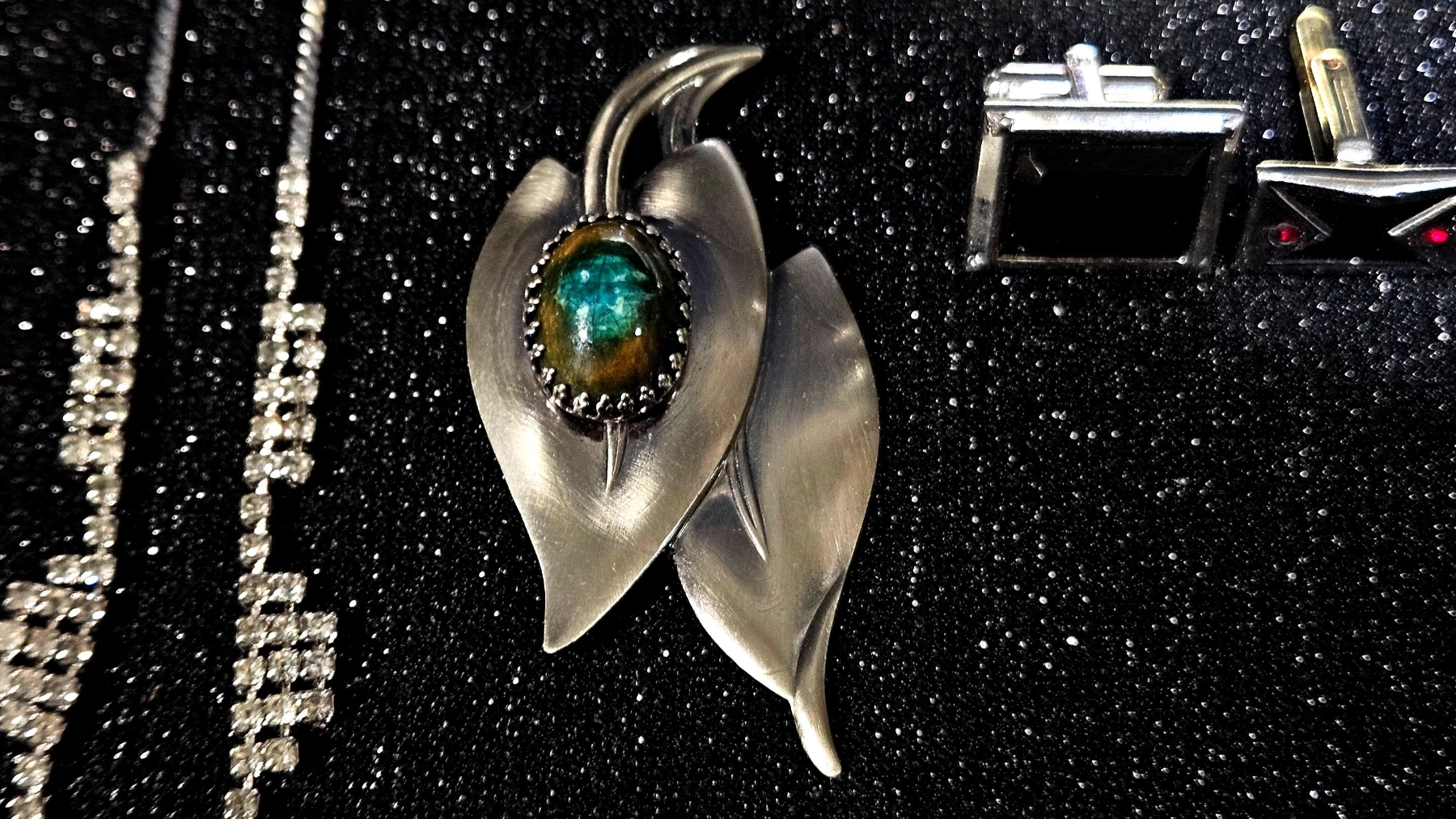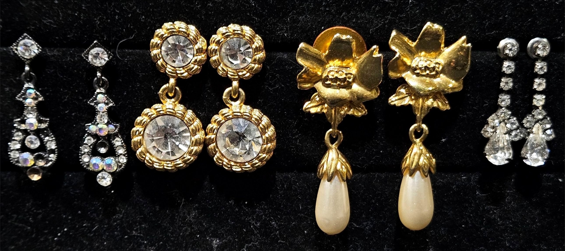 Large assortment of different jewelry, including various sets of earrings that dazzle in the light. Various sets of vintage cufflinks can also be found in this lot, as well as multiple pocket watch faces.