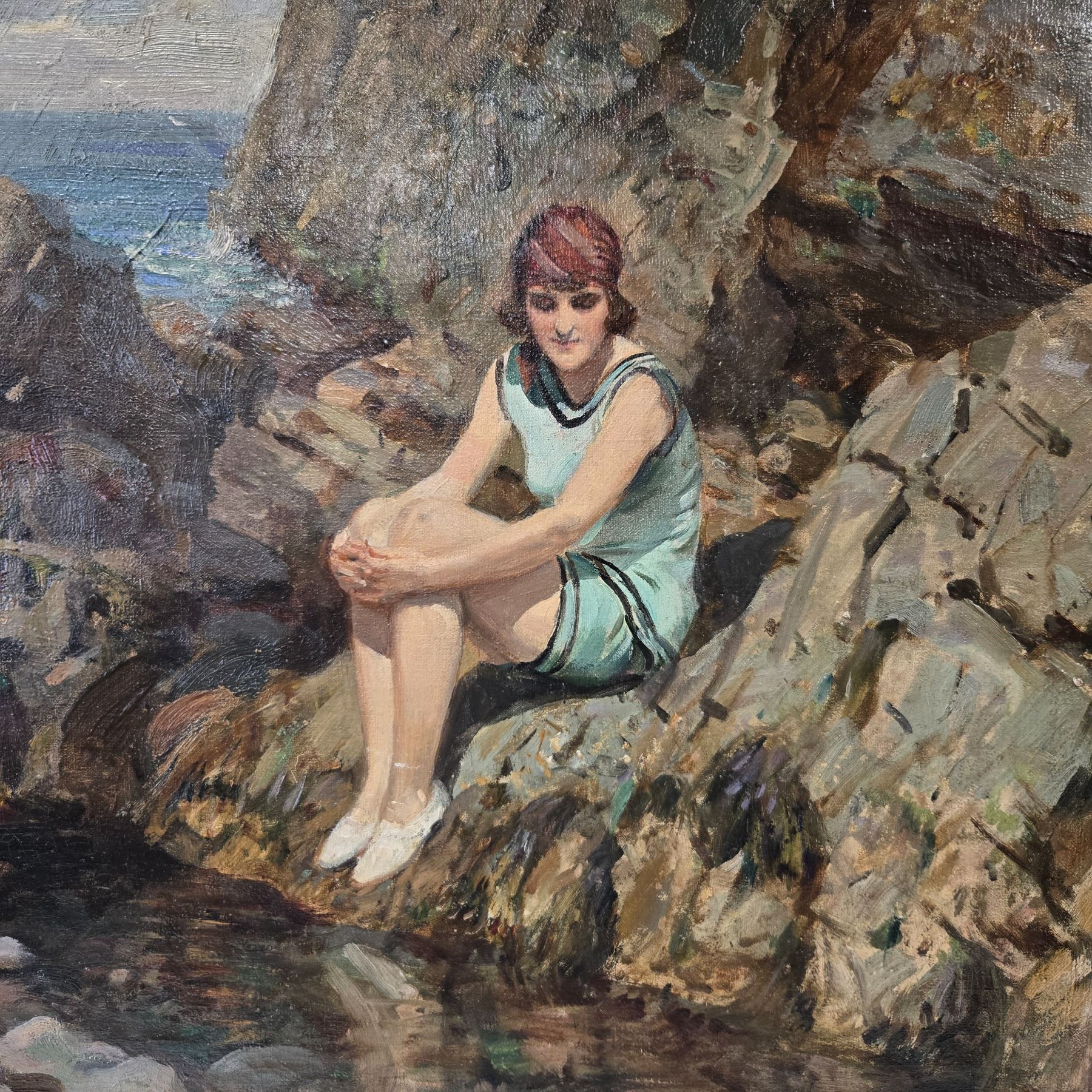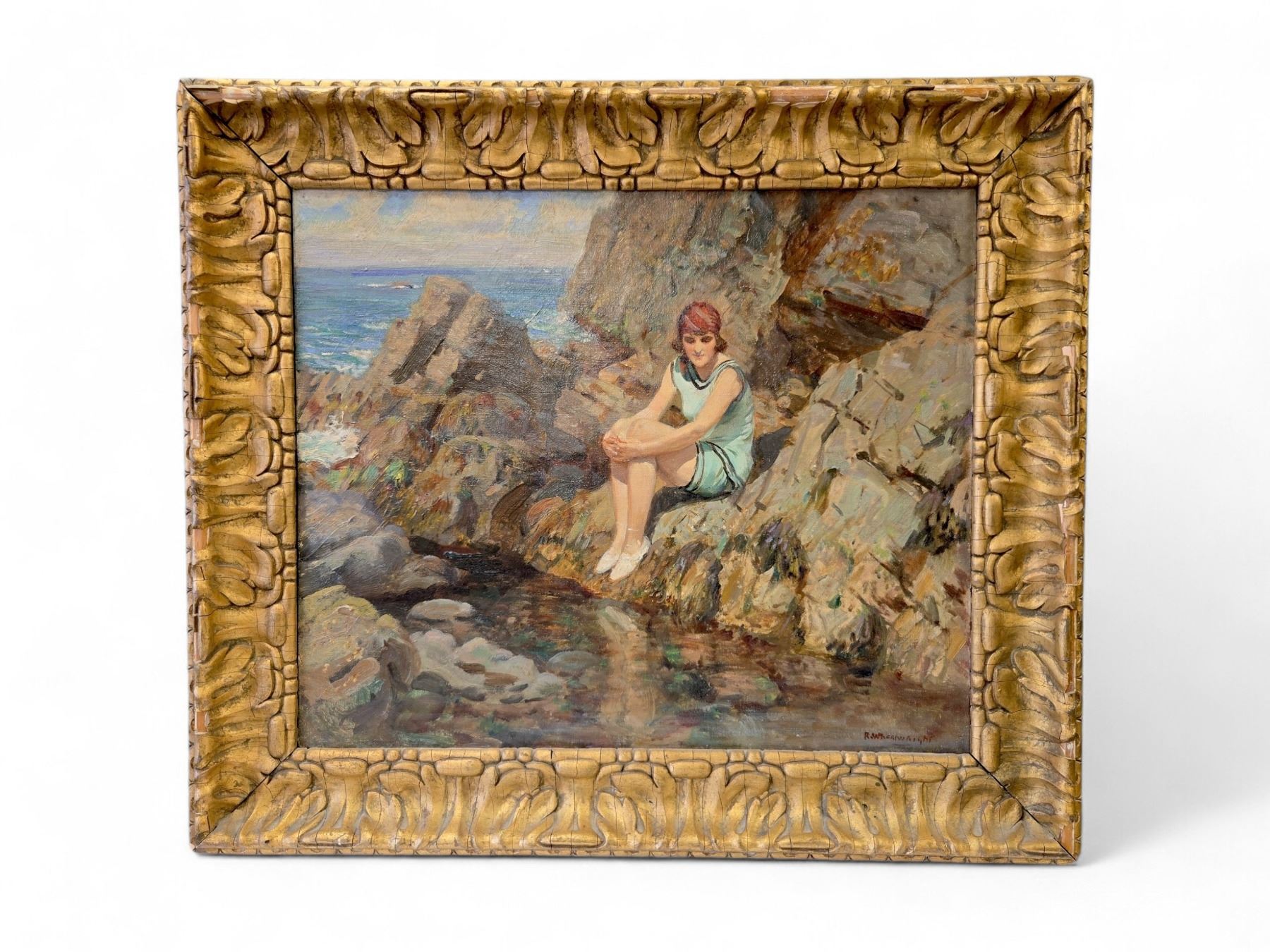 Original fine art piece titled 'The Reflection' by R. Wheelwright. The artwork is framed and features a serene depiction of a woman by the water. Framed piece measures x24-Inch as specified. Item is as pictured. Appraised value is $3500.