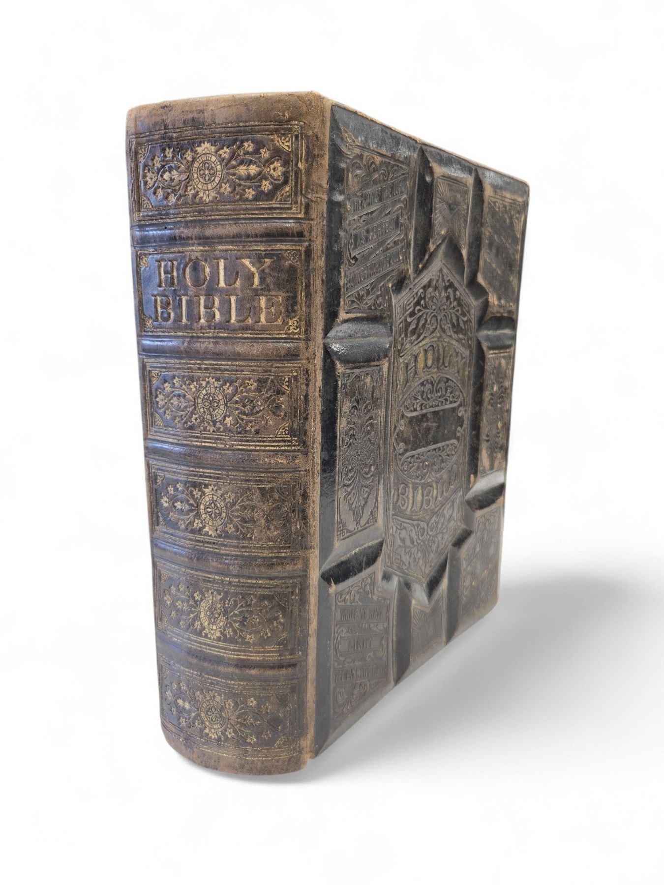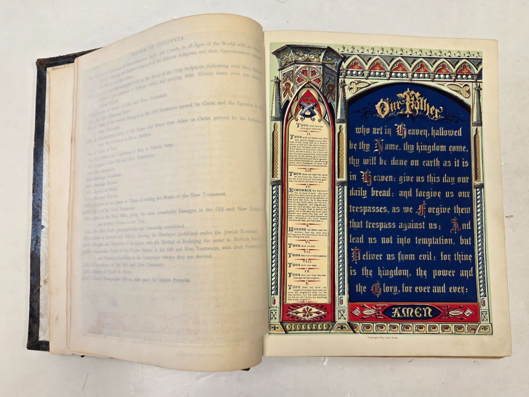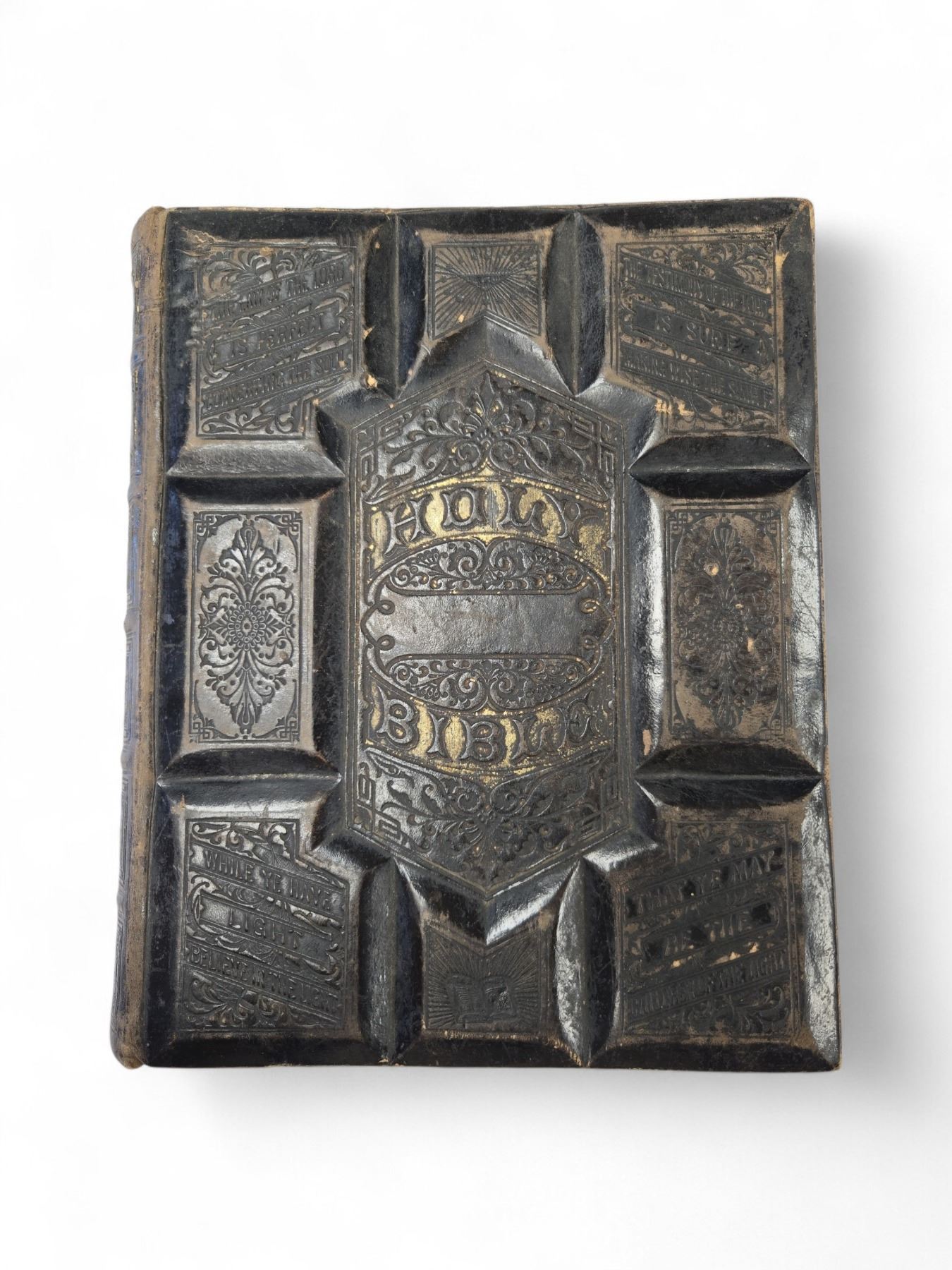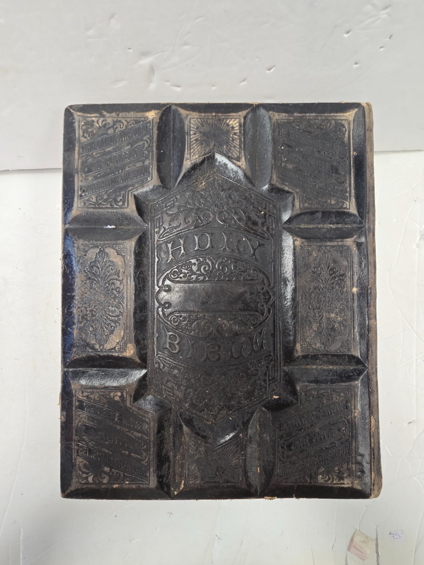 Lot 21 Large Leather Bound Antique Bible with 1882 Inscription & 2 Tin Type Family Photos (Peoples Standard