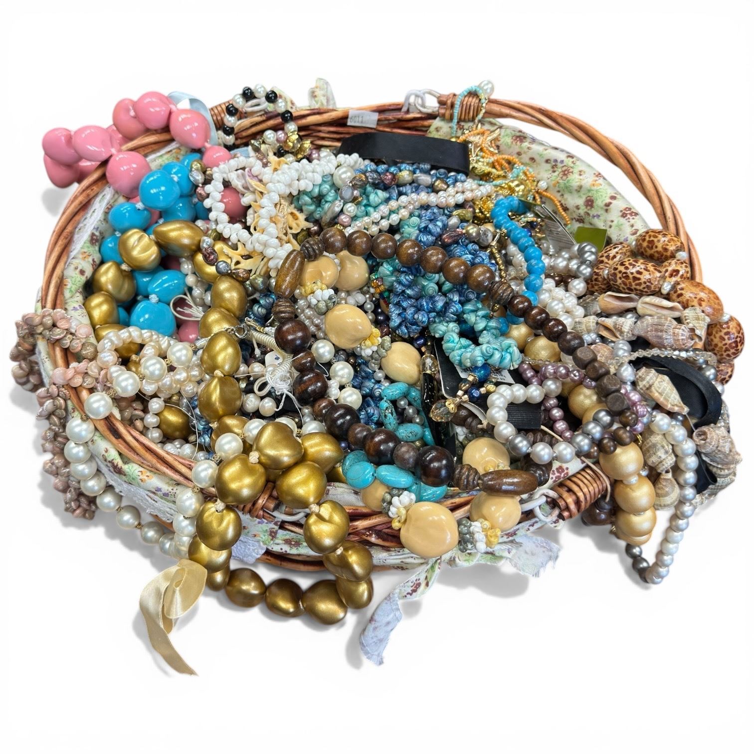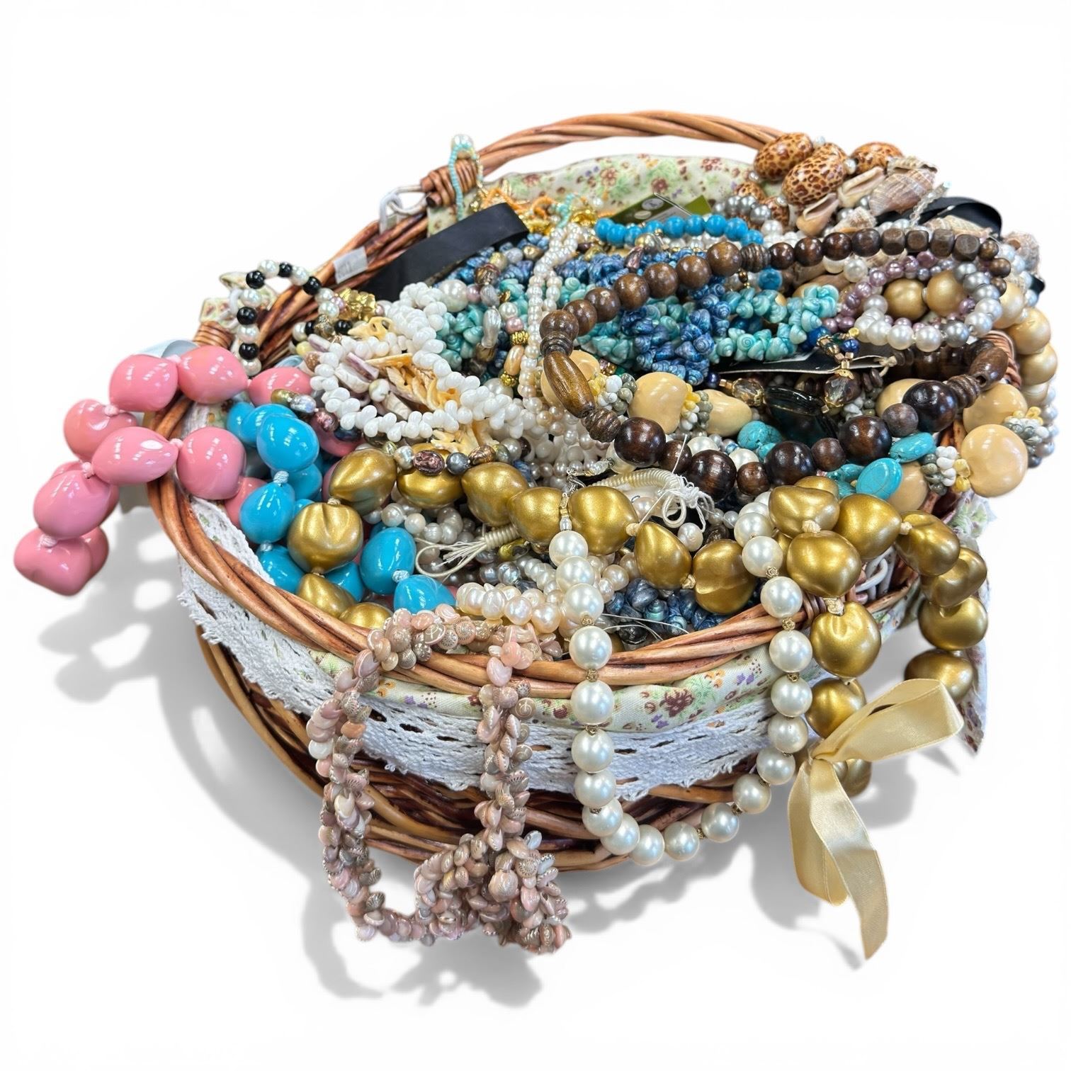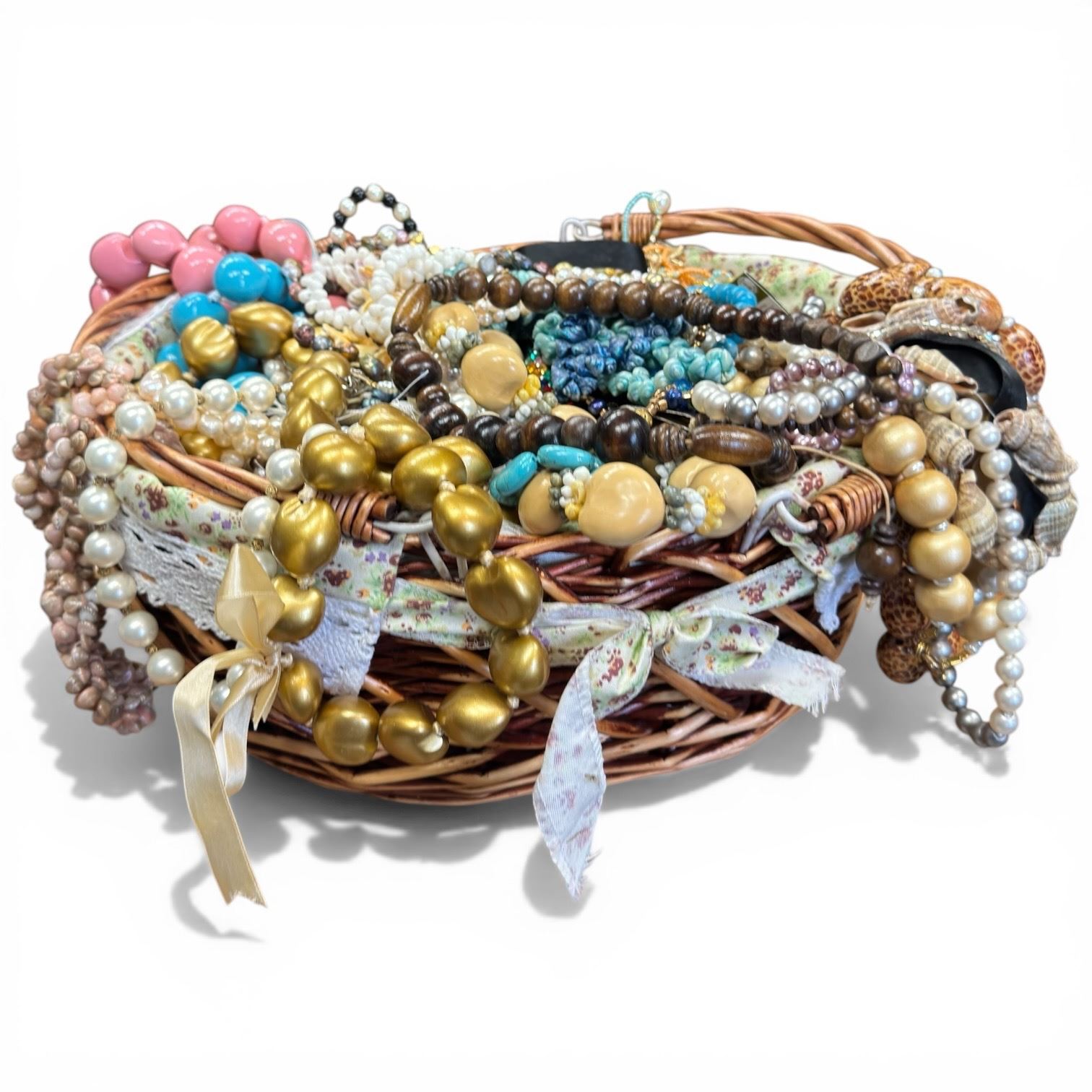 Lot 26 Wicker Basket Full of Beaded Fashion & Costume Jewelry