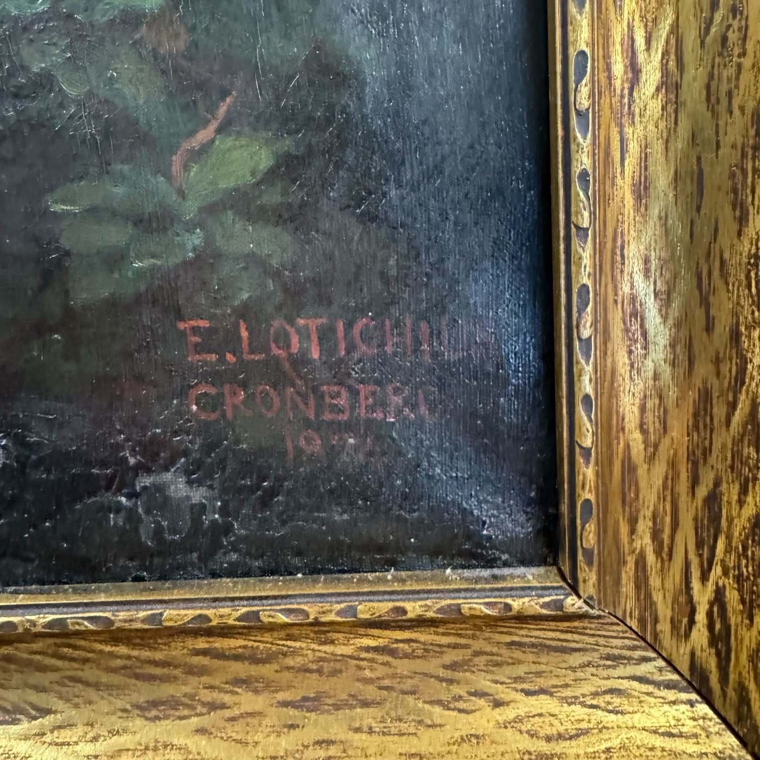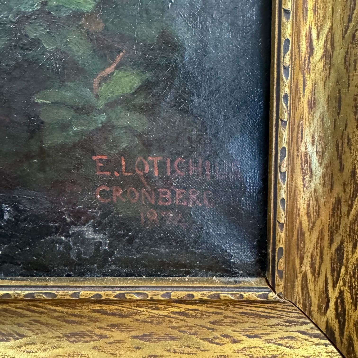30X40" in antique frame. Lotichius is a documented German surname, particularly associated with the Hessen and Kronberg/Cronberg im Taunus region-an active 19th‑century artists' colony. The "Cronberg" inscription almost certainly refers to this center of Düsseldorf‑ and Munich‑influenced painters. The 1874 date aligns with the height of German wildlife and hunting‑scene painting, a genre widely collected by the rising middle class of the period.