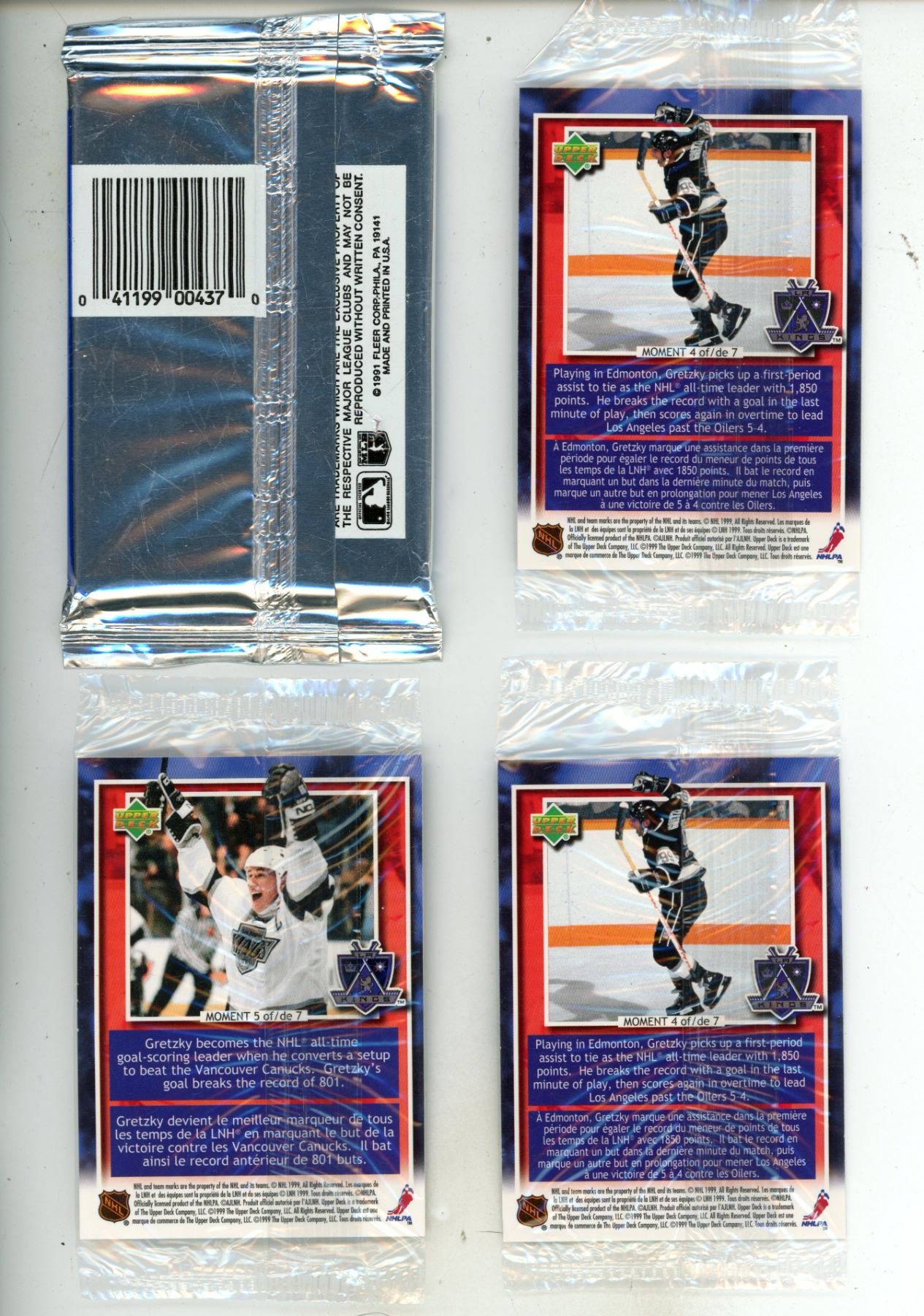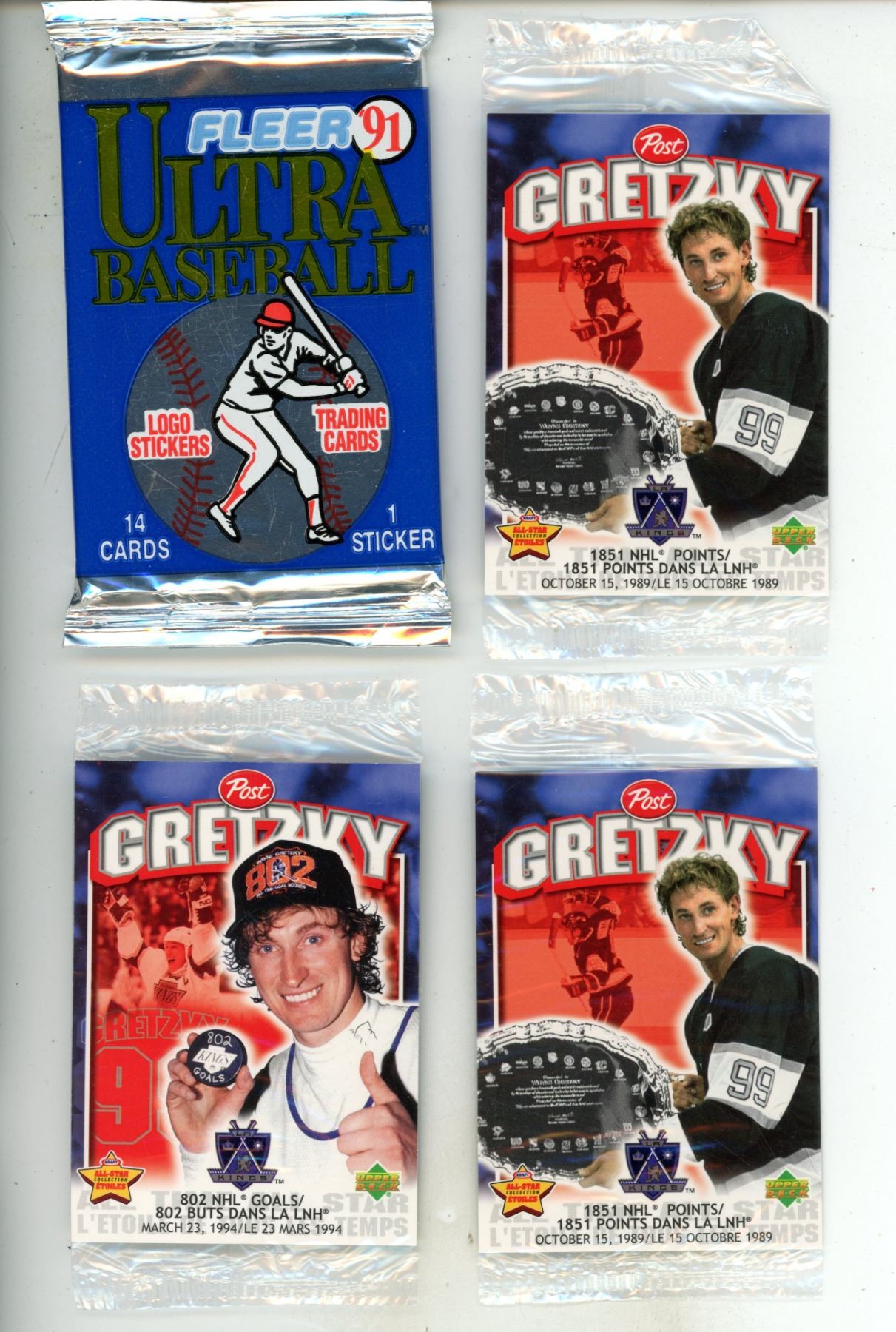 Vintage sports trading cards and sticker packs from the early 1990s, specifically showing sealed Fleer Ultra Baseball packs and Post Wayne Gretzky Promotional sets.