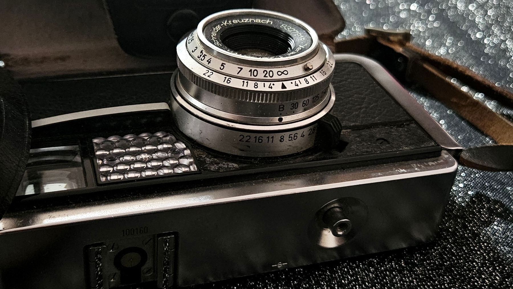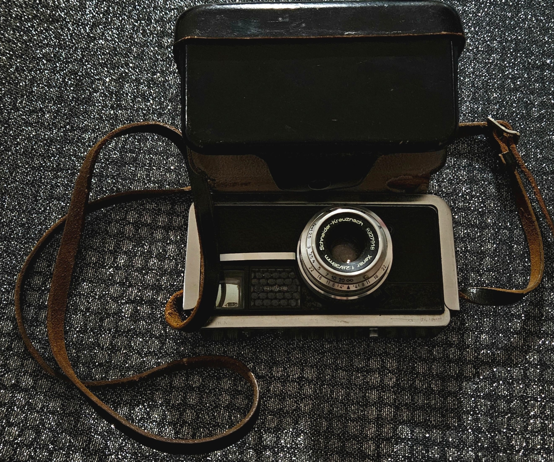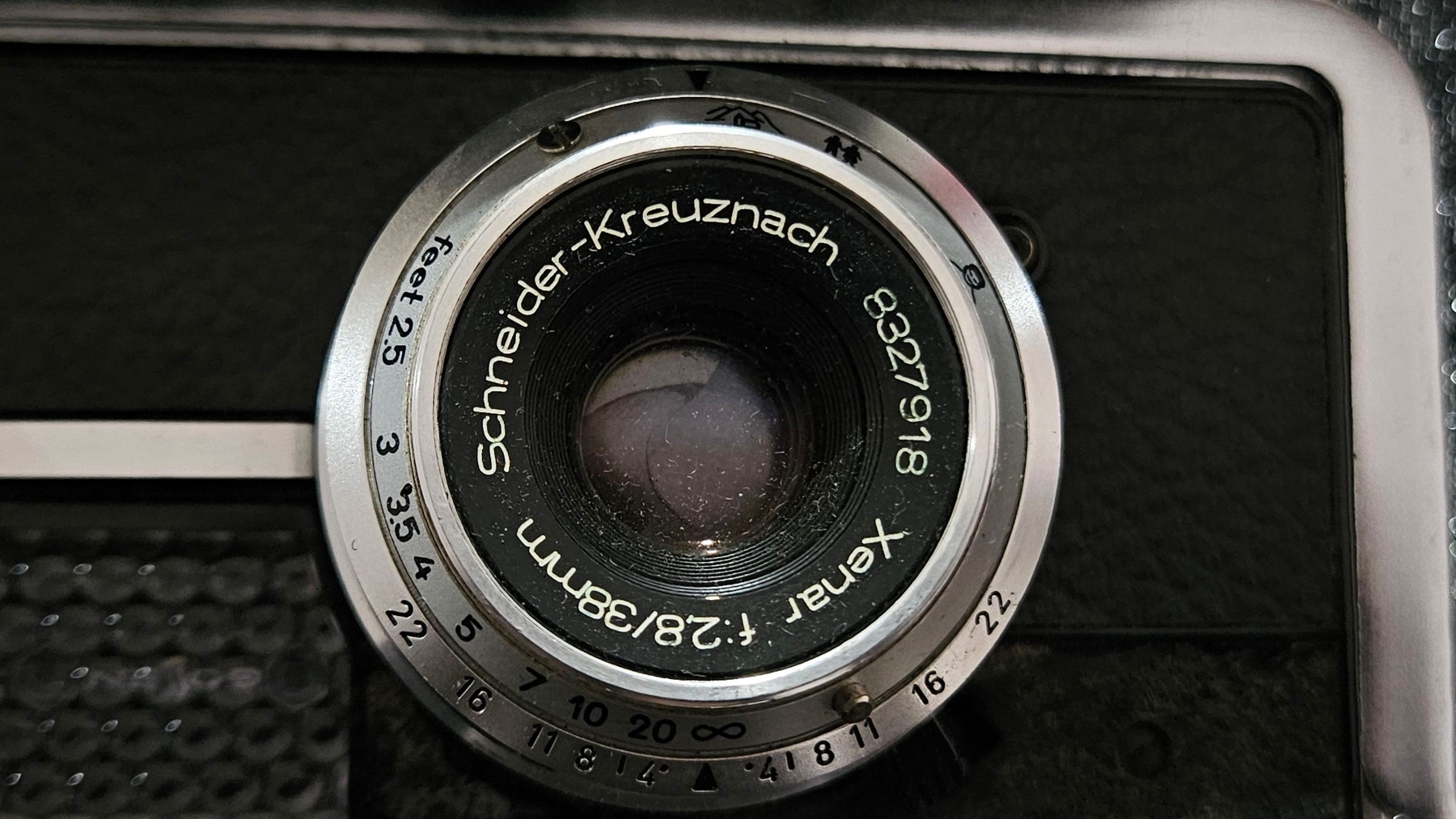 Manufactured in Germany. Features a high-quality Schneider-Kreuznach Xenar 38mm f/2.8 lens that retracts into the body. Includes original carrying case. Sold as-is.
