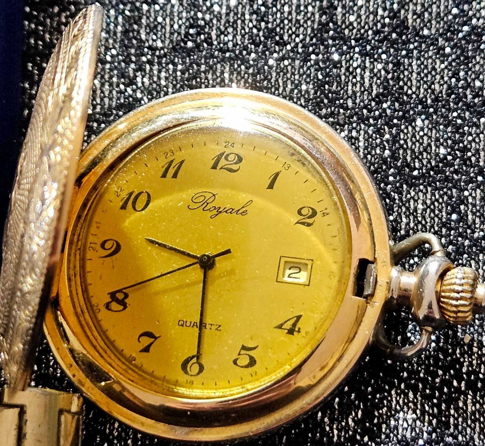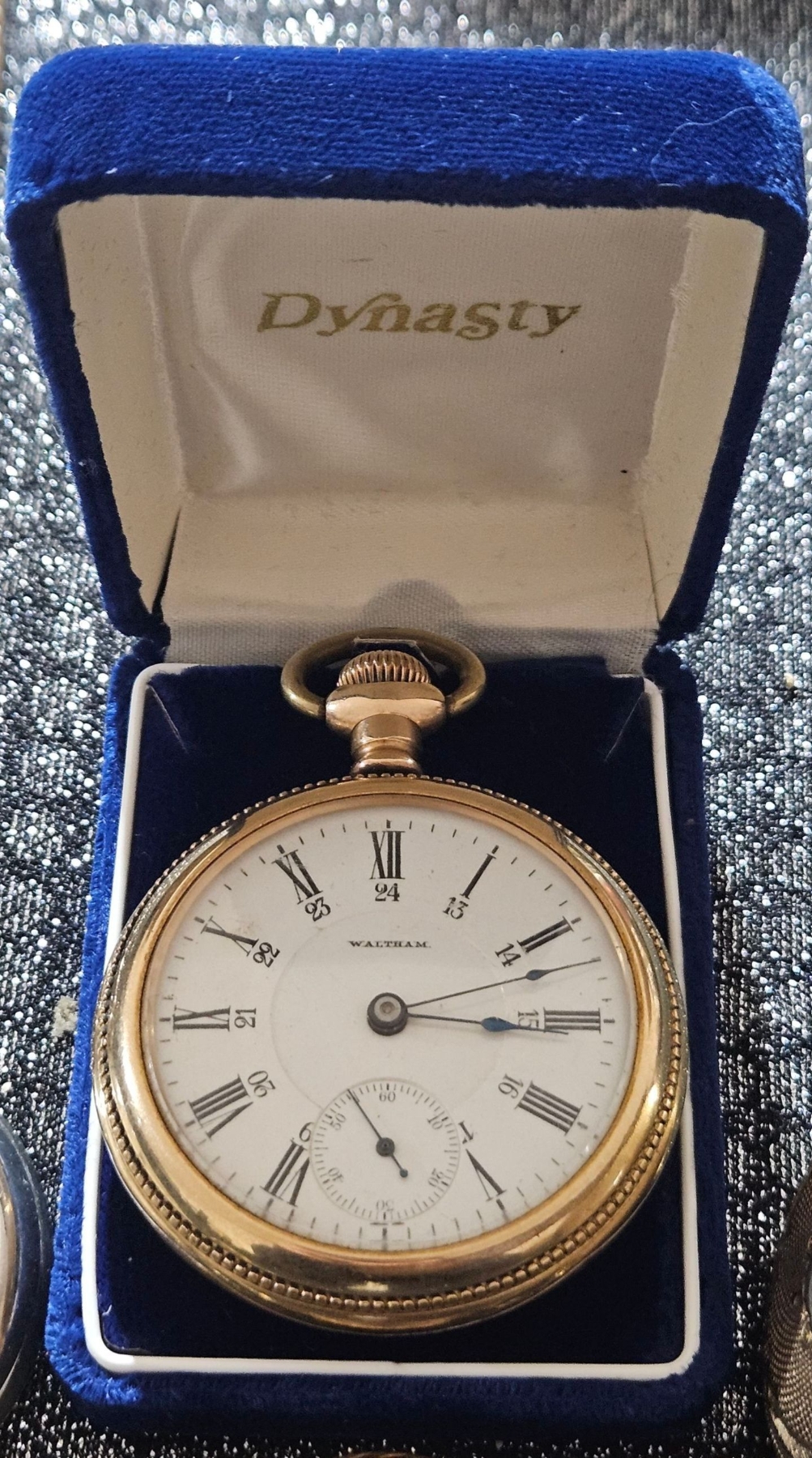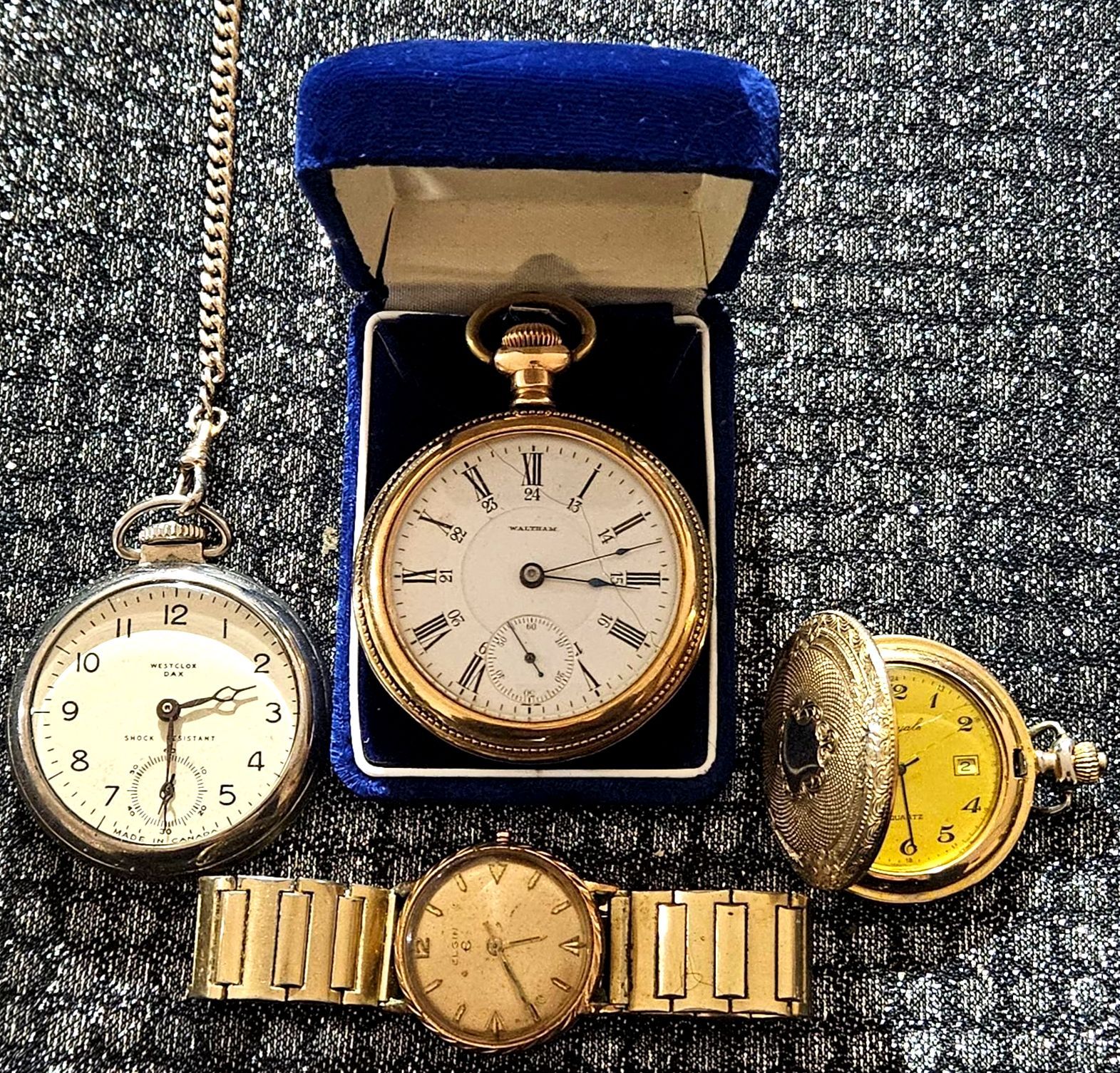 Set features a 1900's antique Waltham pocket watch in a beautiful blue display case alongside a Westclox pocket watch. Contains 4 pocket watches and one wristwatch in total.