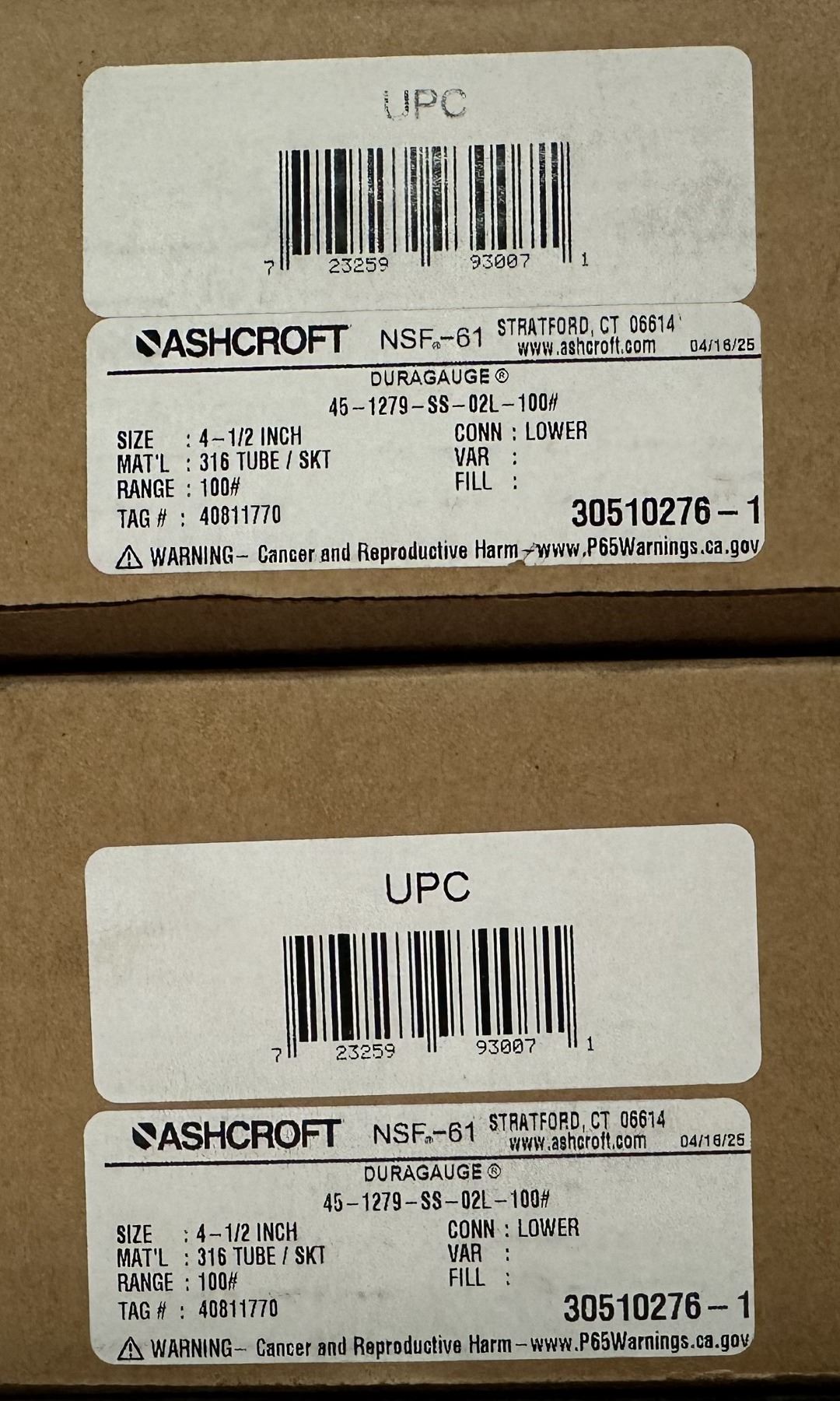 Lot 333 (2) Ashcroft #NSF-61 DuraGauge Pressure Gauges