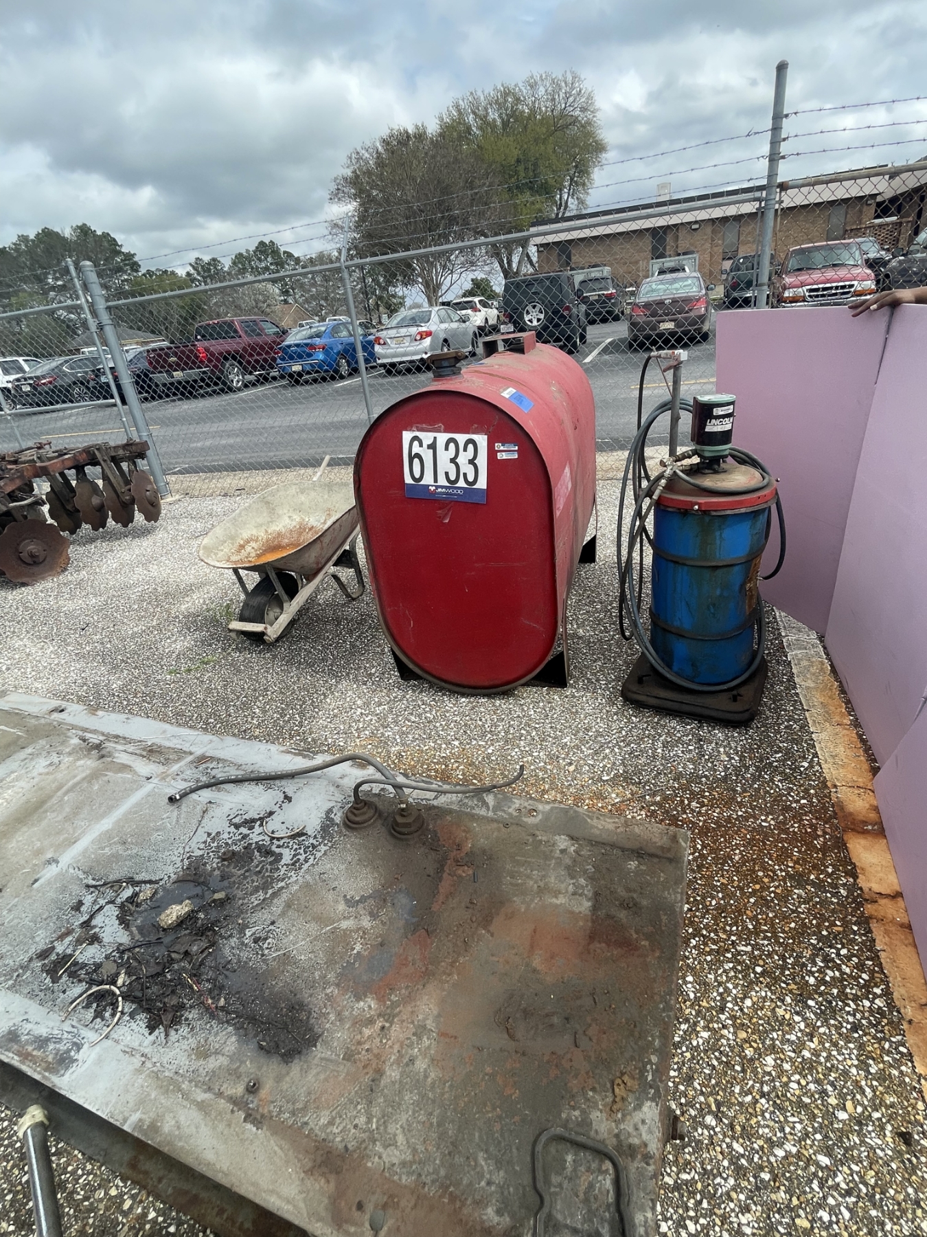 seed spreader, fuel pumps, fuel tanks, grease bbl, wheel barrow, Selling Offsite: Located in Montgomery, AL