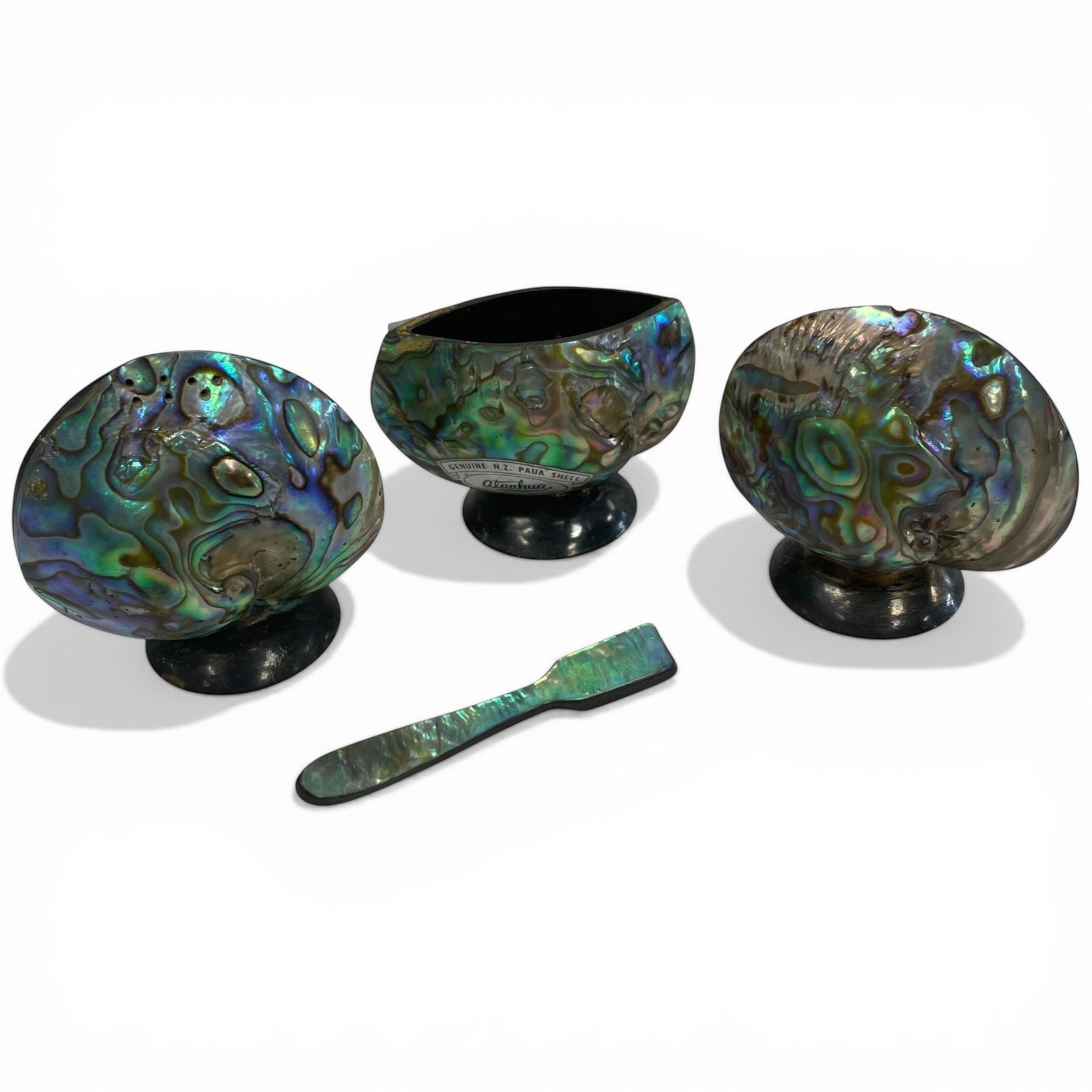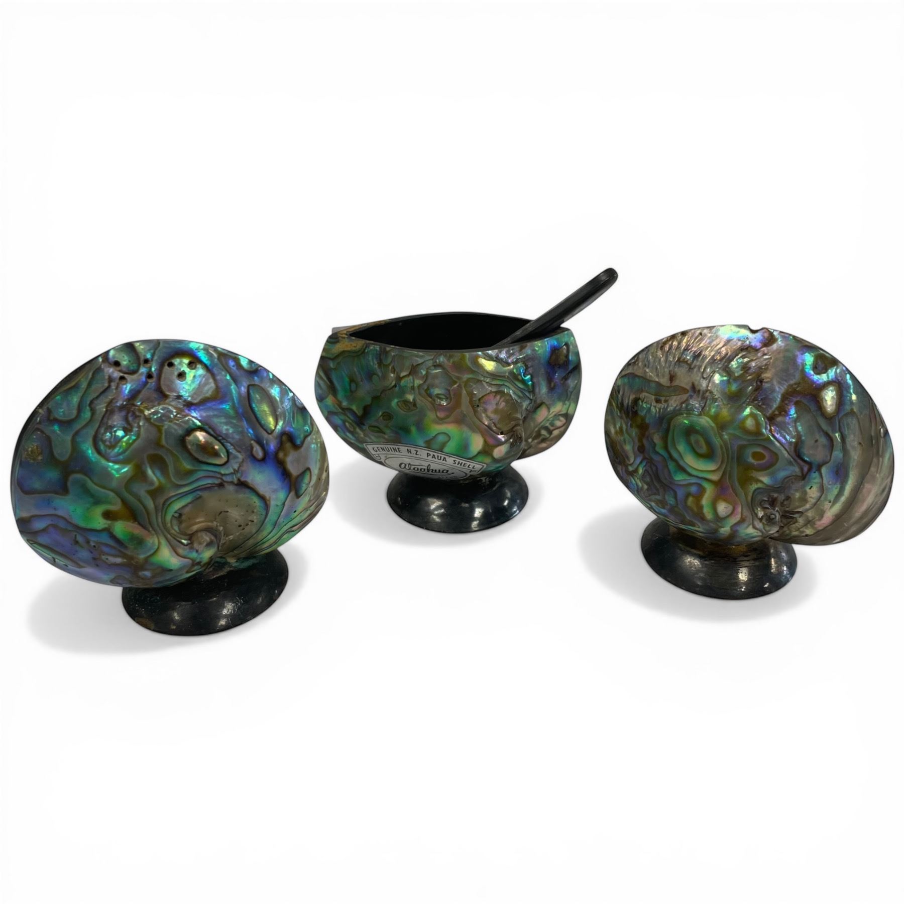 Lot 107 3 Genuine Ataahua New Zealand Paua Shell Tableware (Salt, Pepper & Salt Cellar * Largest is 2.5" s 2