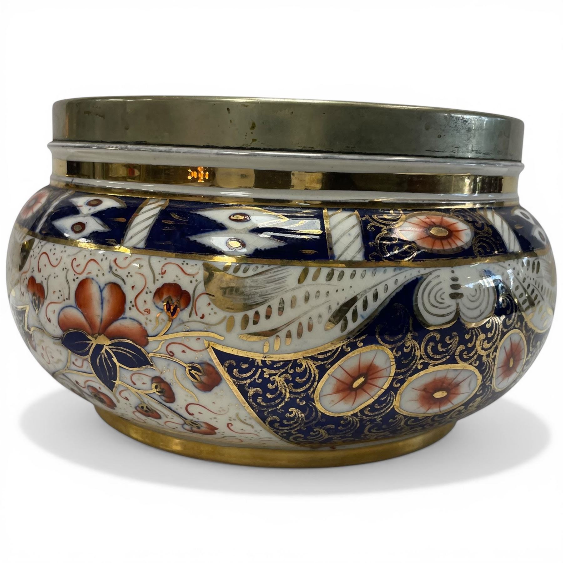 Lot 134 Antique English Imari Jardinière with Silver Plated Rim * 9" Diameter X 4" Deep