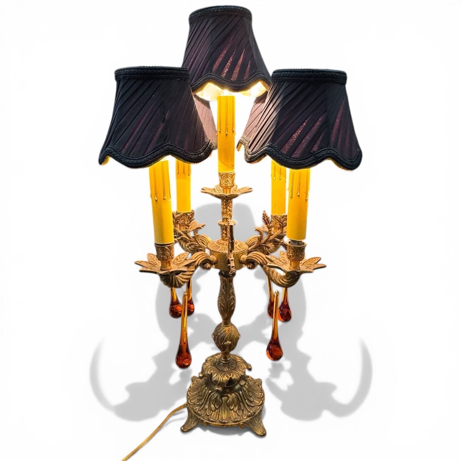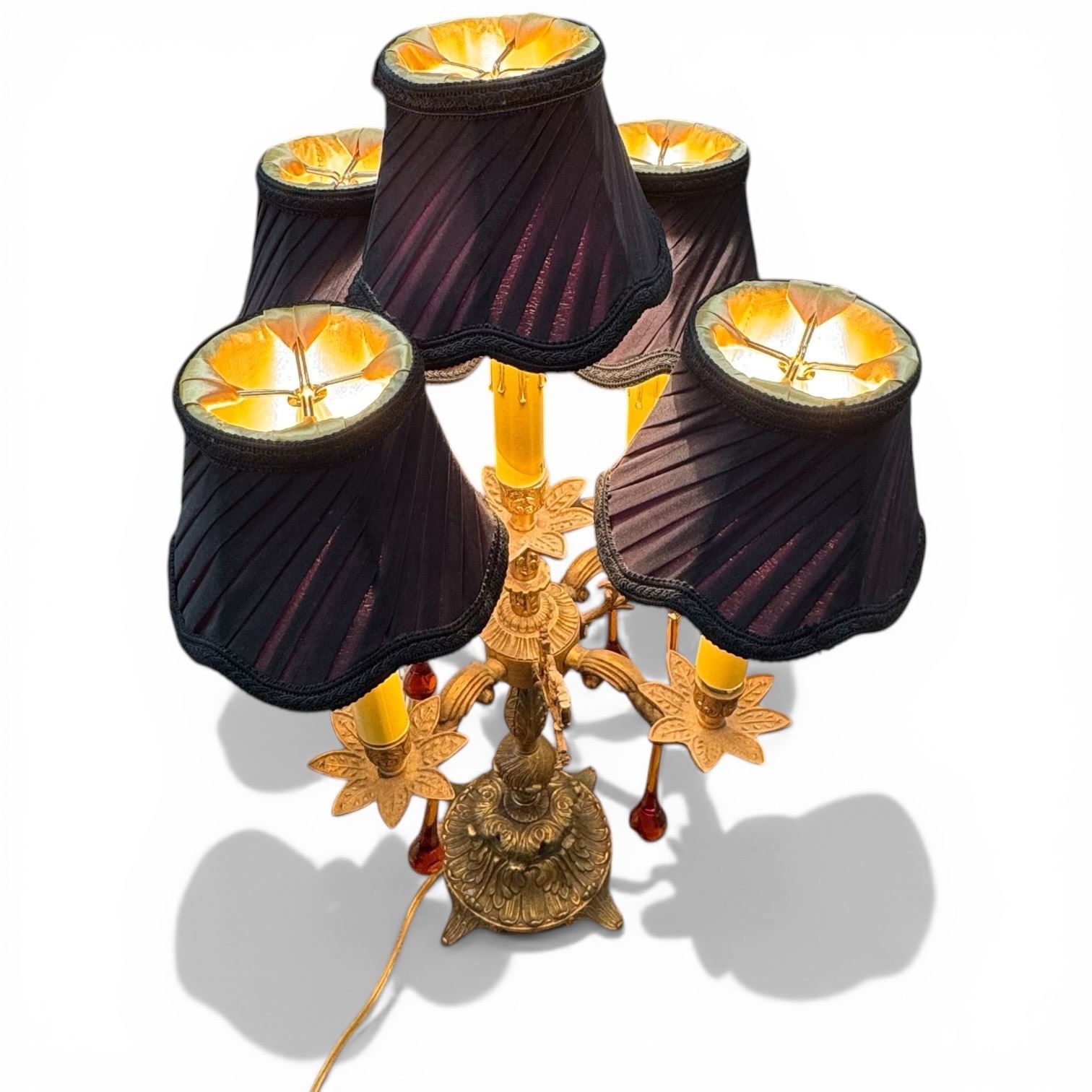 Brass Five Shade Electric Candelabra with Art Glass Drops (24" tall x 12" diameter) Tested and working