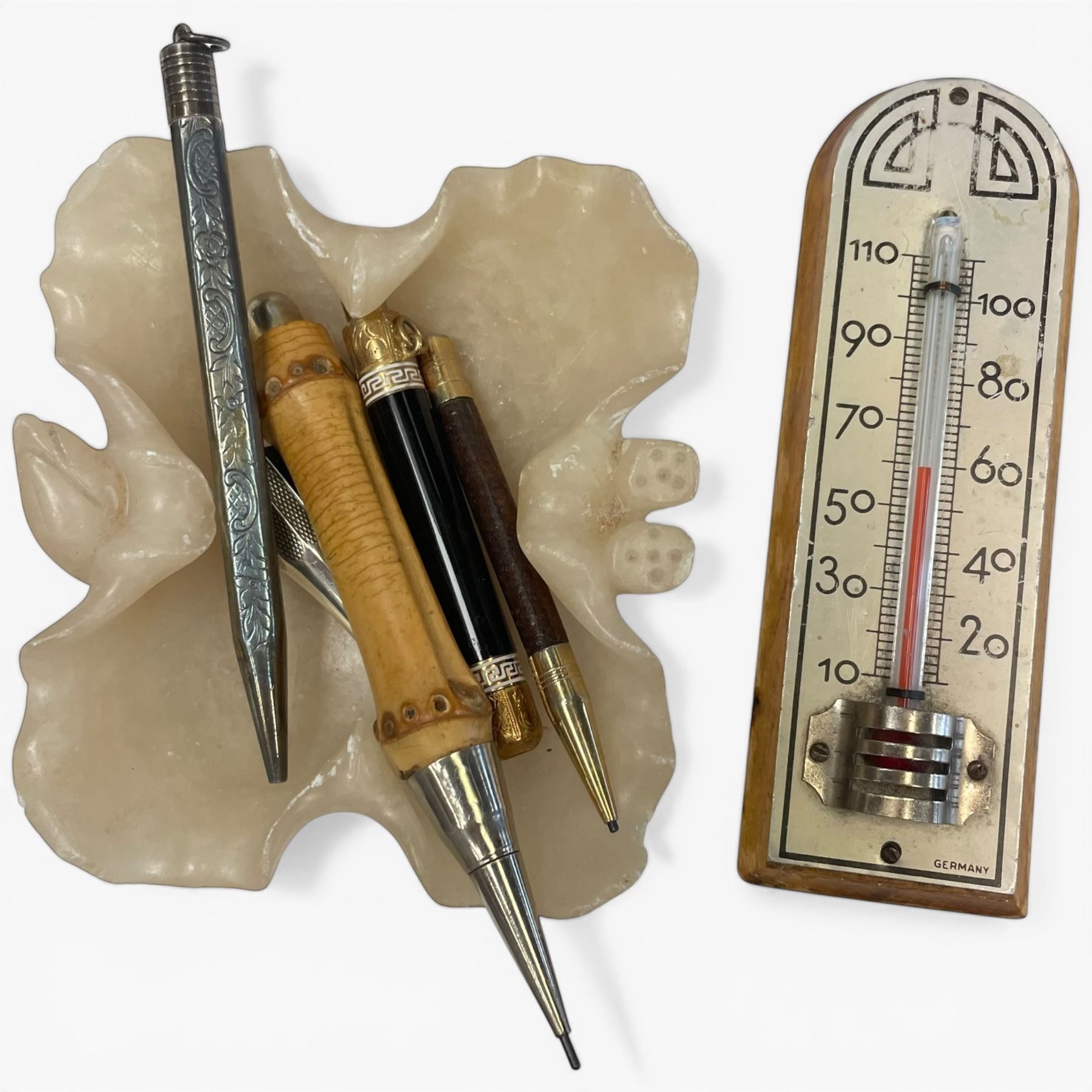 Collection of Vintage Leather & Cloth Purses & Wallets, Vintage Pens, Small Pink Bubble Glass Dish & more