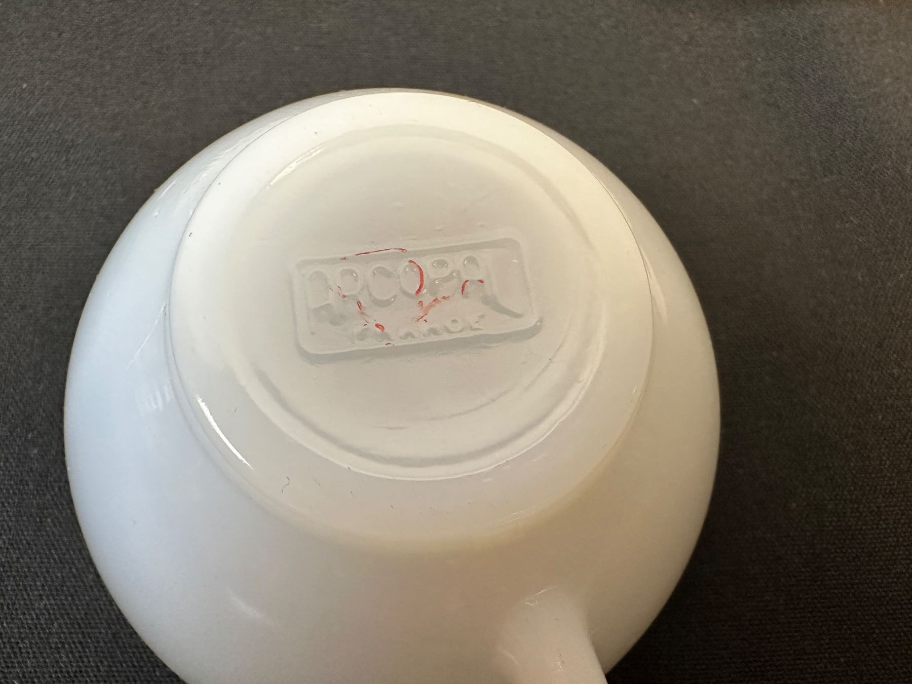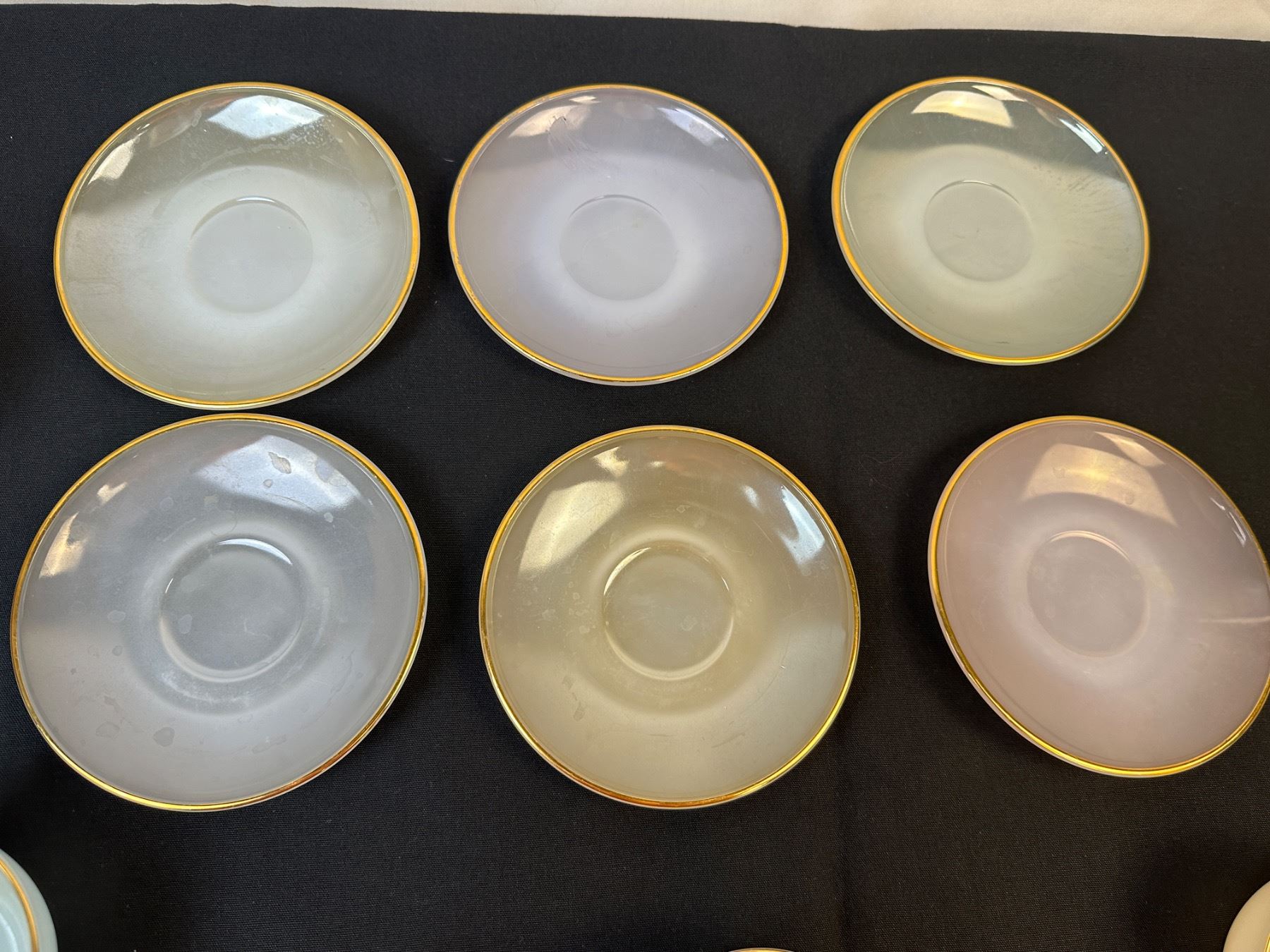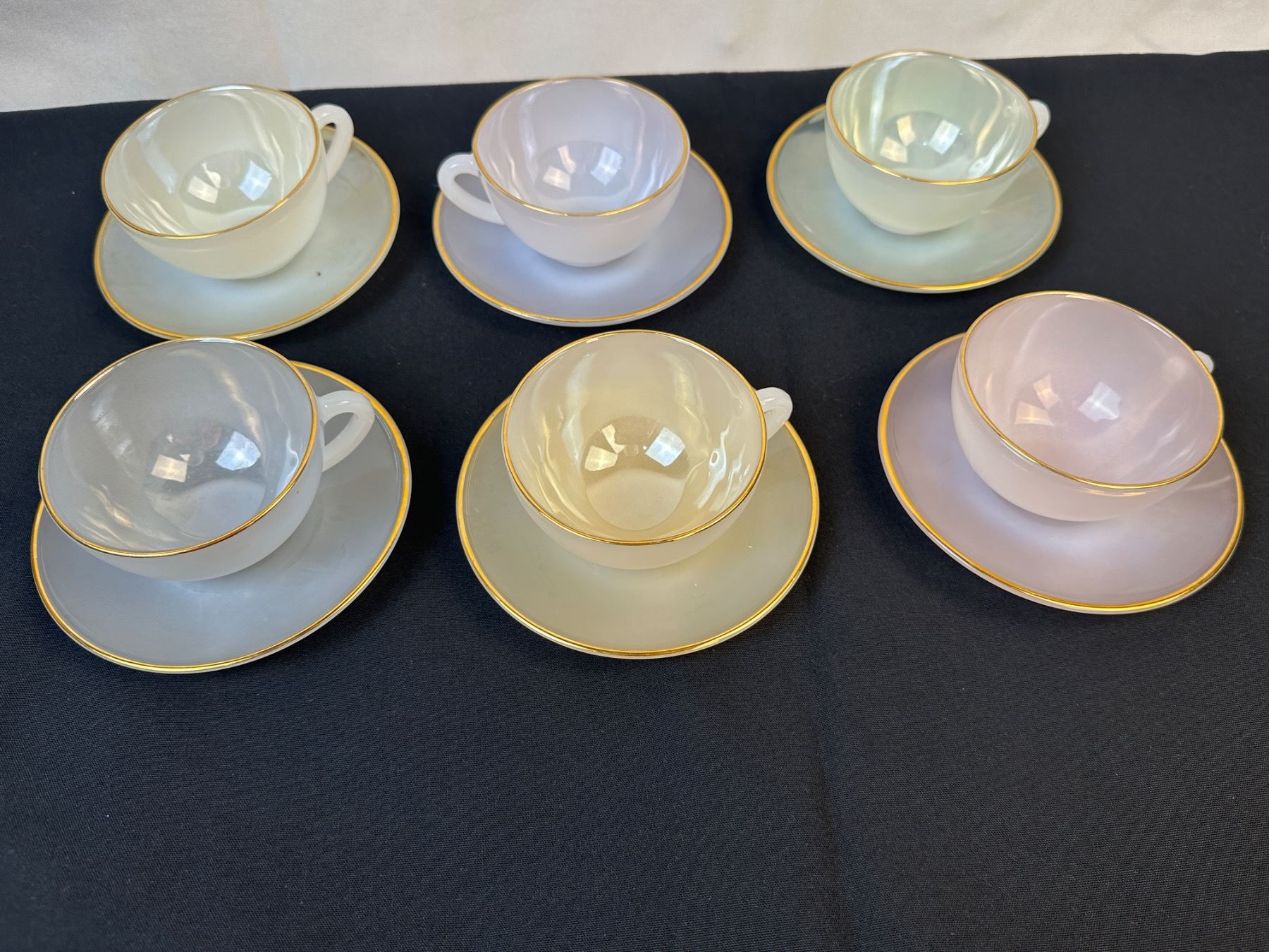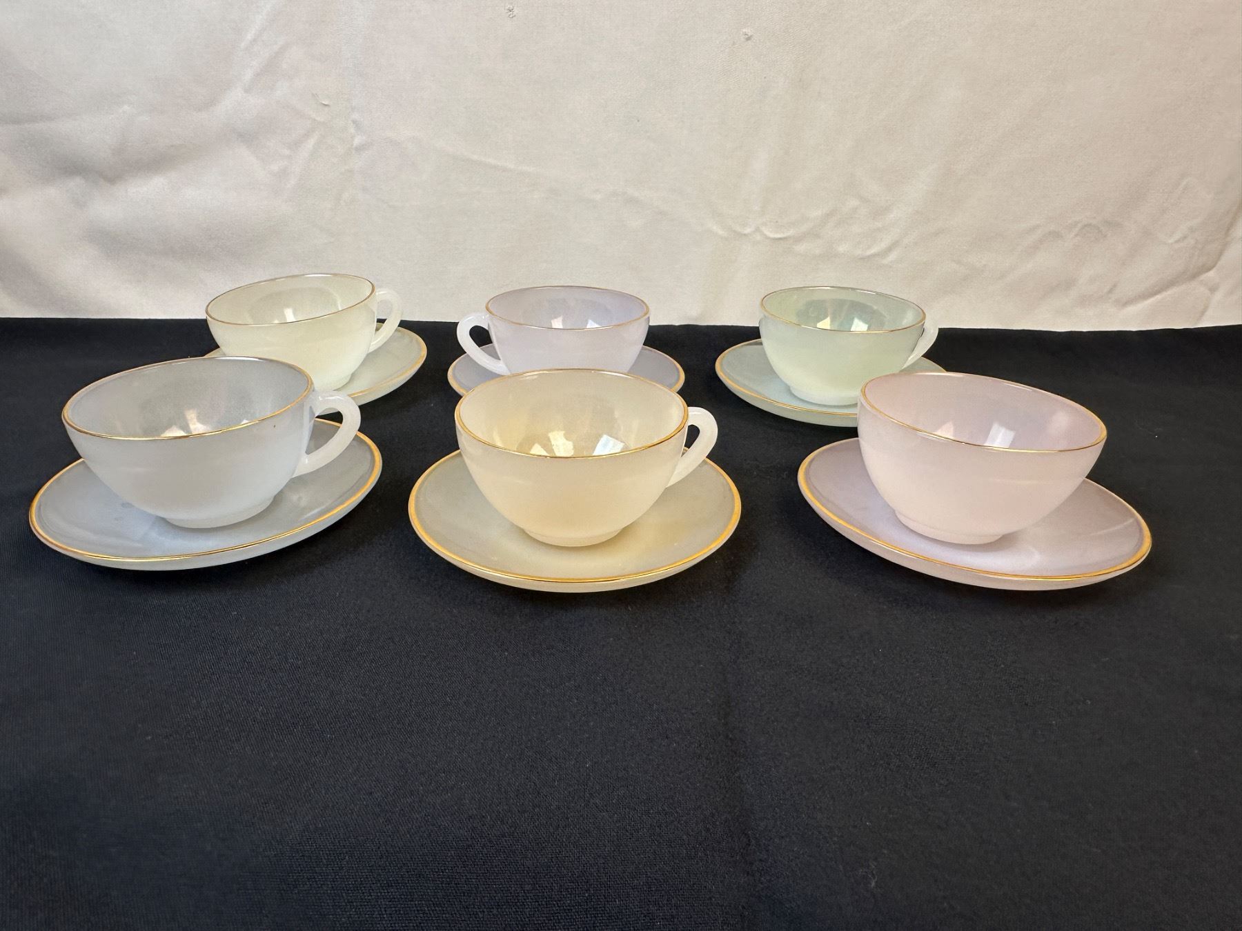 Lot 2104 Arcopal France Harlequin Pastel Colors Milk glass Tea Cups and Saucer
