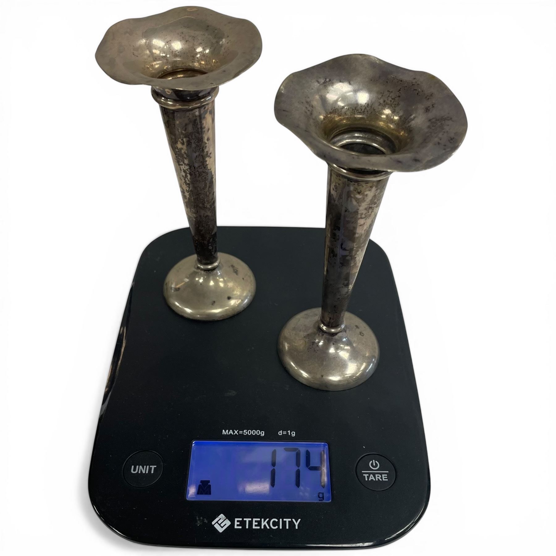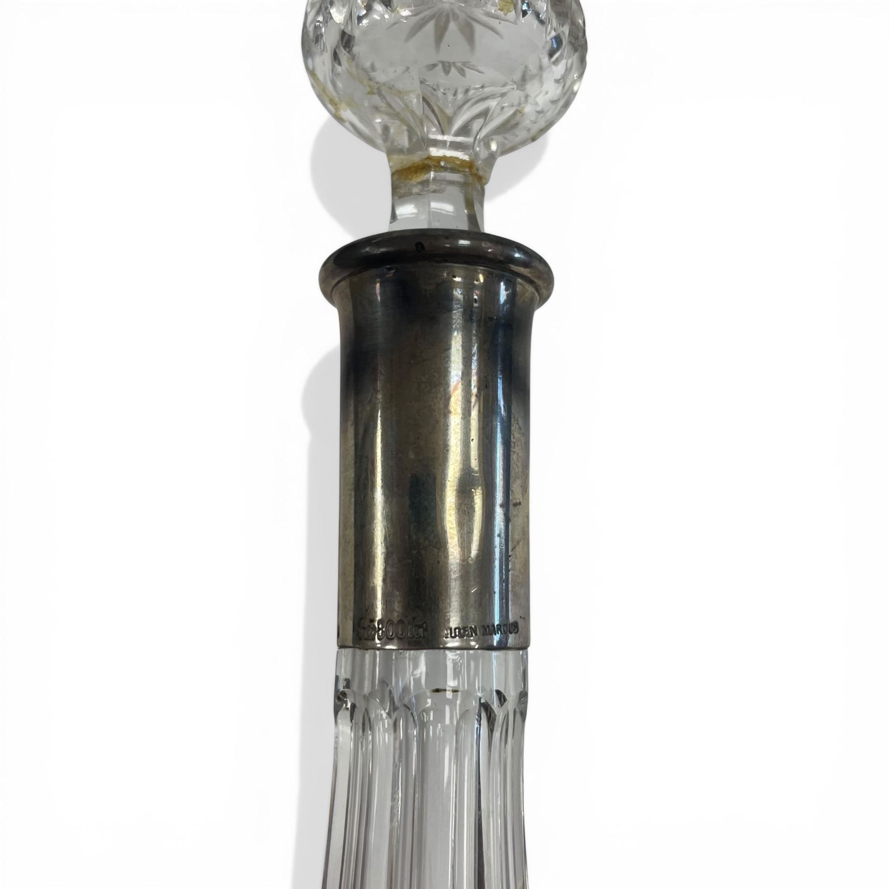 Lot 158 Weighted Silver Bud Vases & 1 Antique Crystal Decanter All with .800 Silver Band (Decanter is