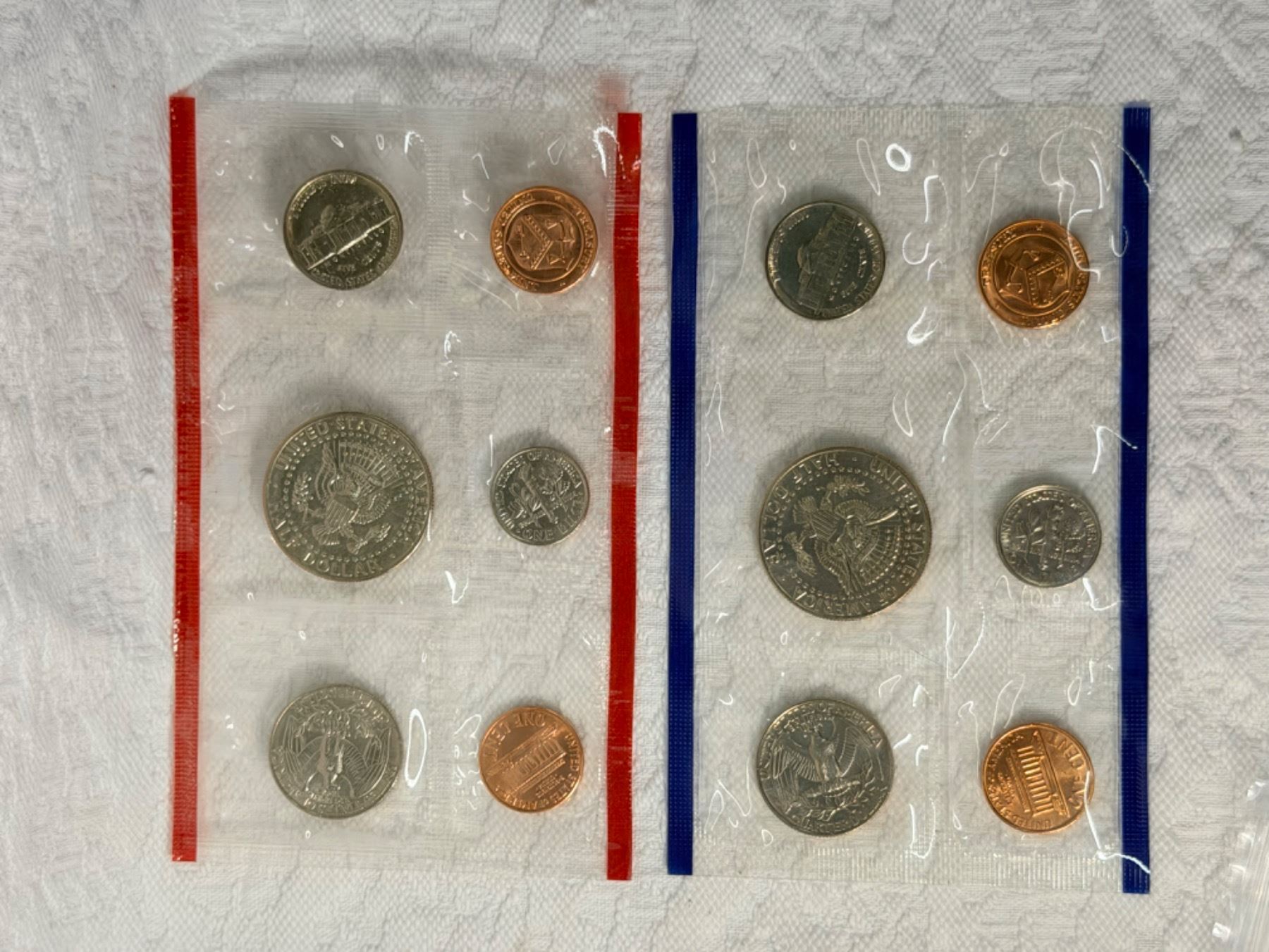UNCIRCULATED MINT SET INCLUDES COINS MINTED FROM BOTH THE PHILADELPHIA AND THE DENVER MINTS; BOTH ARE STILL IN THEIR ORIGINAL MINT CELLOPHANE WITH COPPER MINT TOKENS