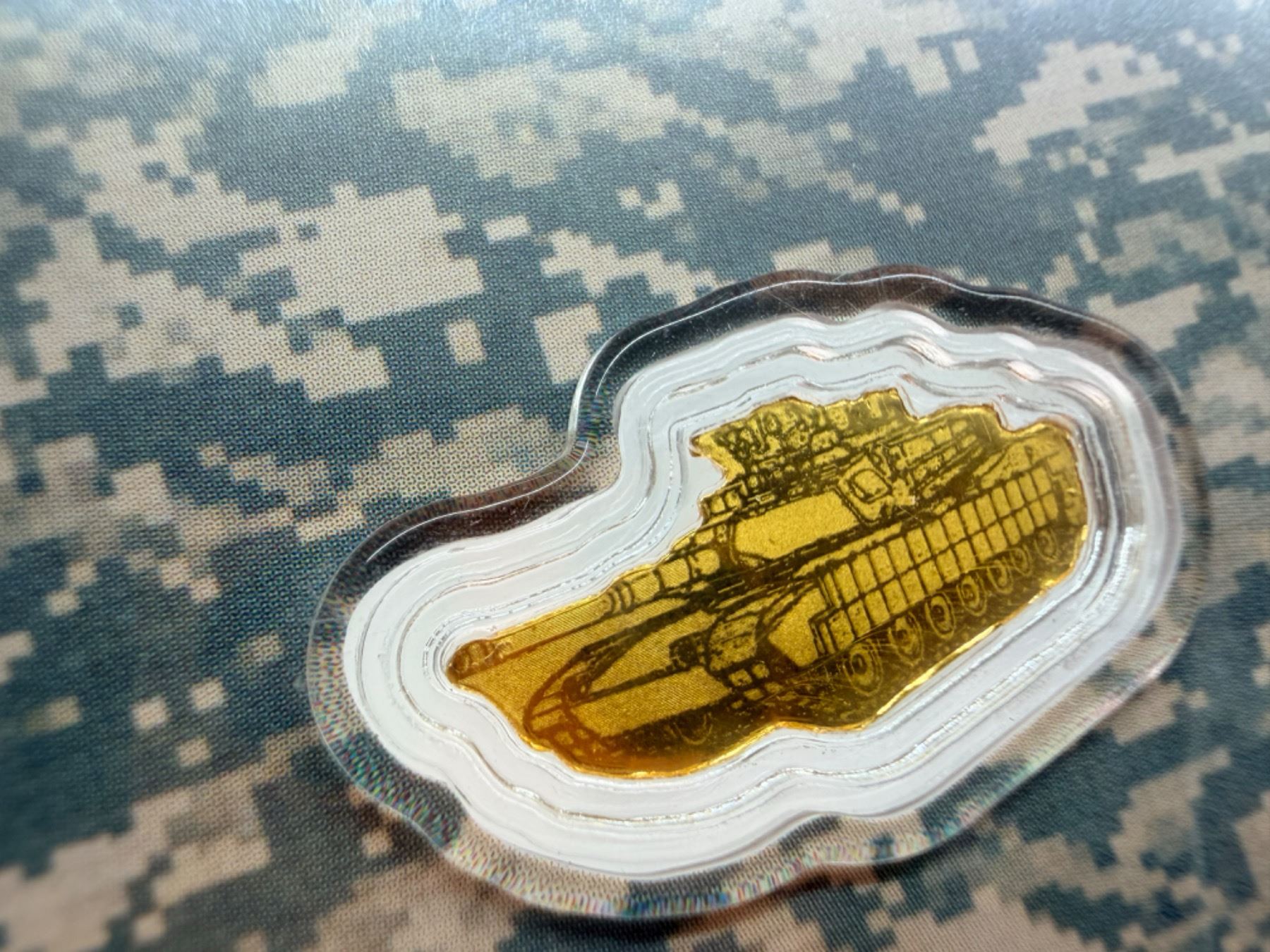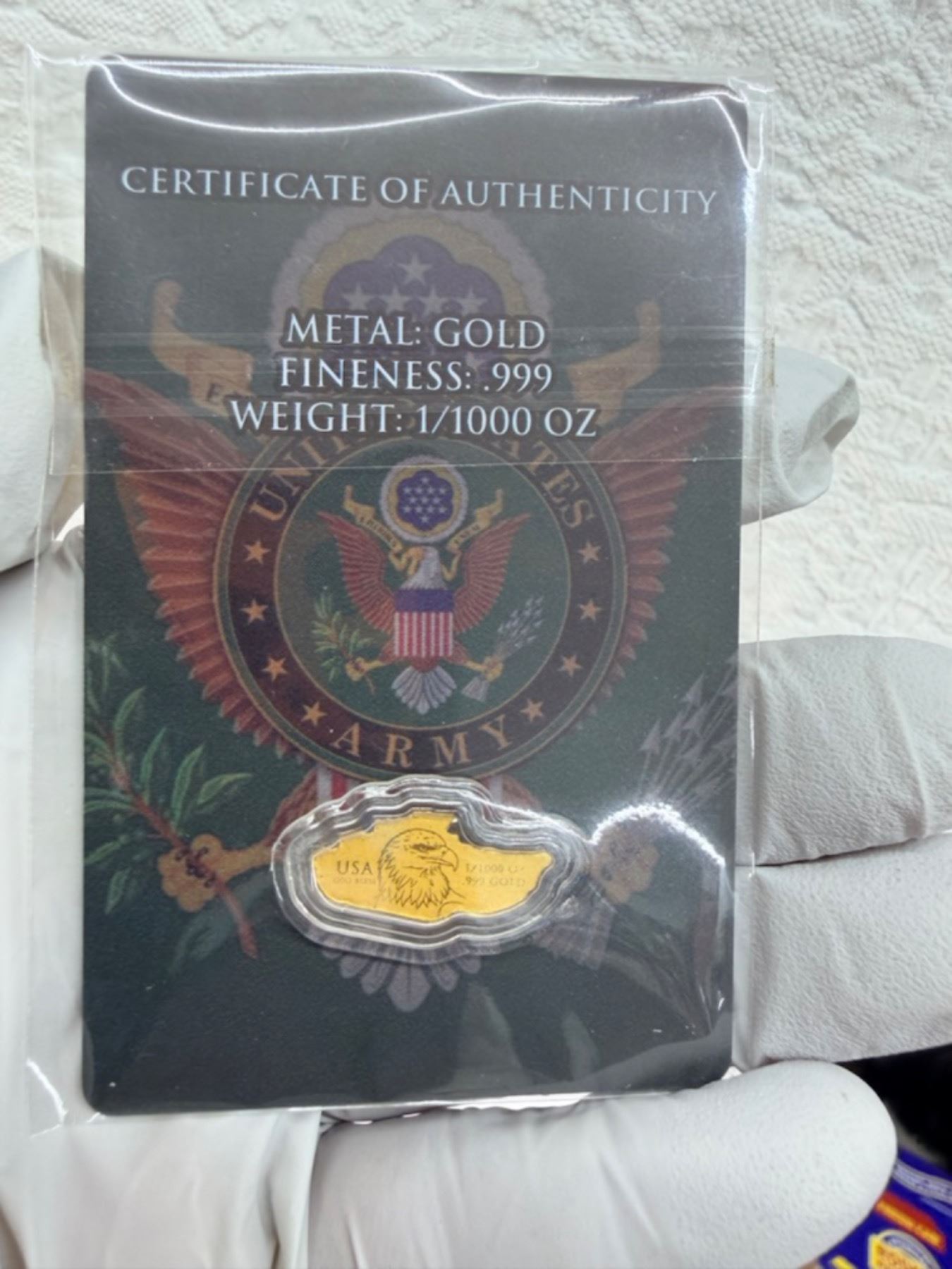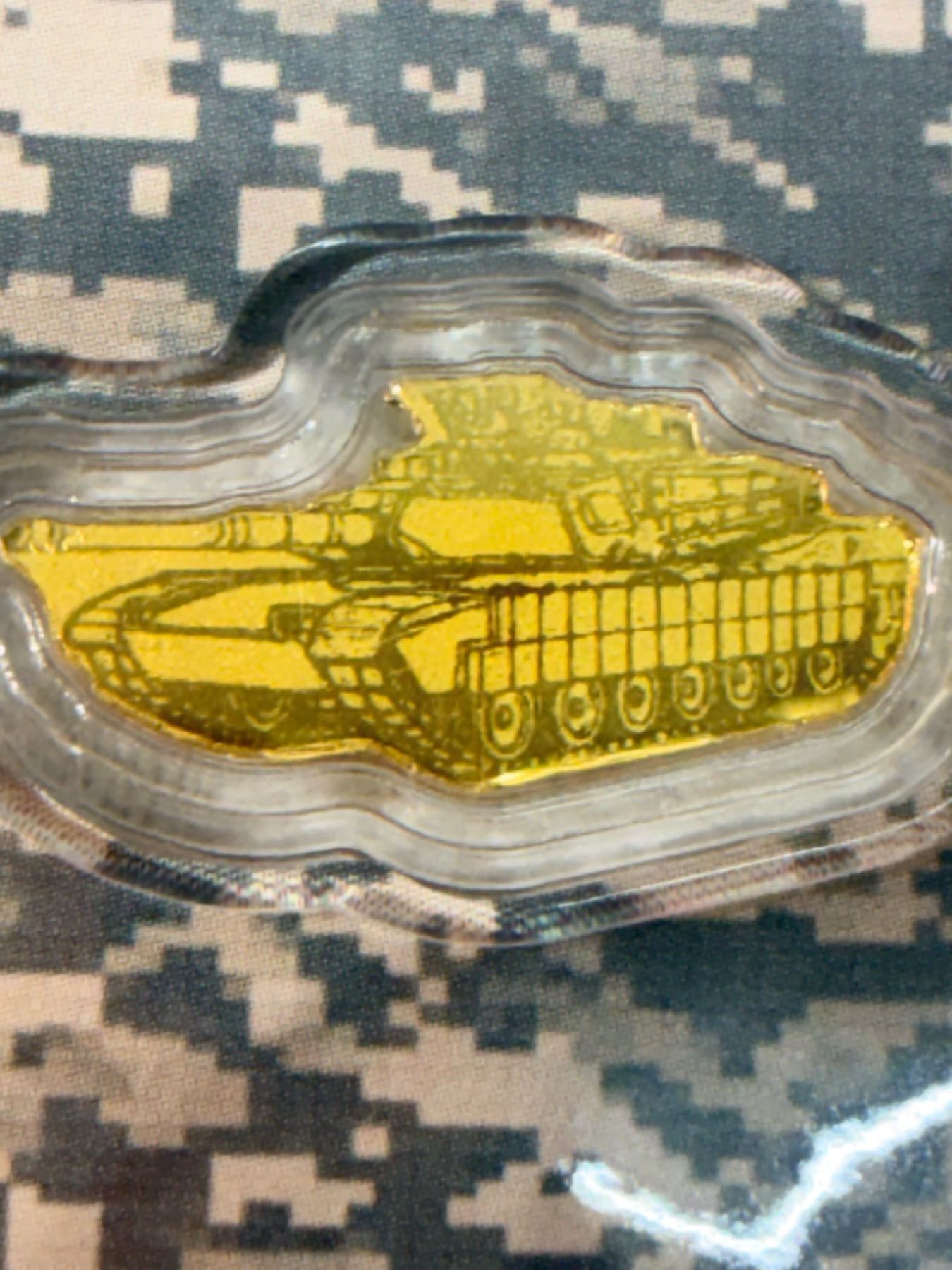 MADE OF .999 FINE GOLD WITH A PRECIOUS METAL CONTENT OF 1/1000 OUNCE. THIS BAR IS IN THE SHAPE OF A US ARMY TANK AND HAS AN AMERICAN BALD EAGLE ON THE REVERSE; IT IS MANUFACTURED IN THE UNITED STATES; IT IS A UNIQUE AND VALUABLE INVESTMENT PIECE FOR THOSE LOOKING TO ADD GOLD TO THEIR PORTFOLIO IN SMALL INCREMENTS