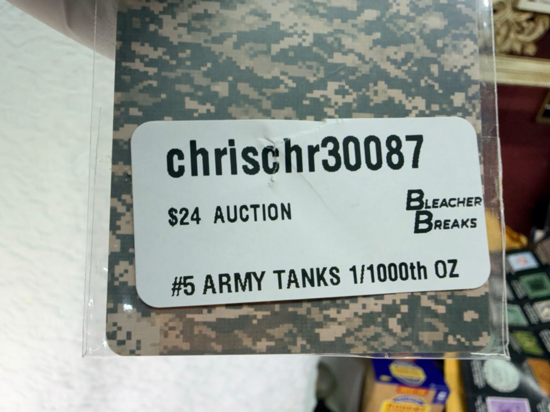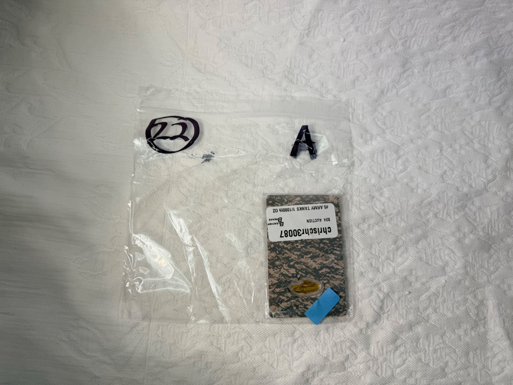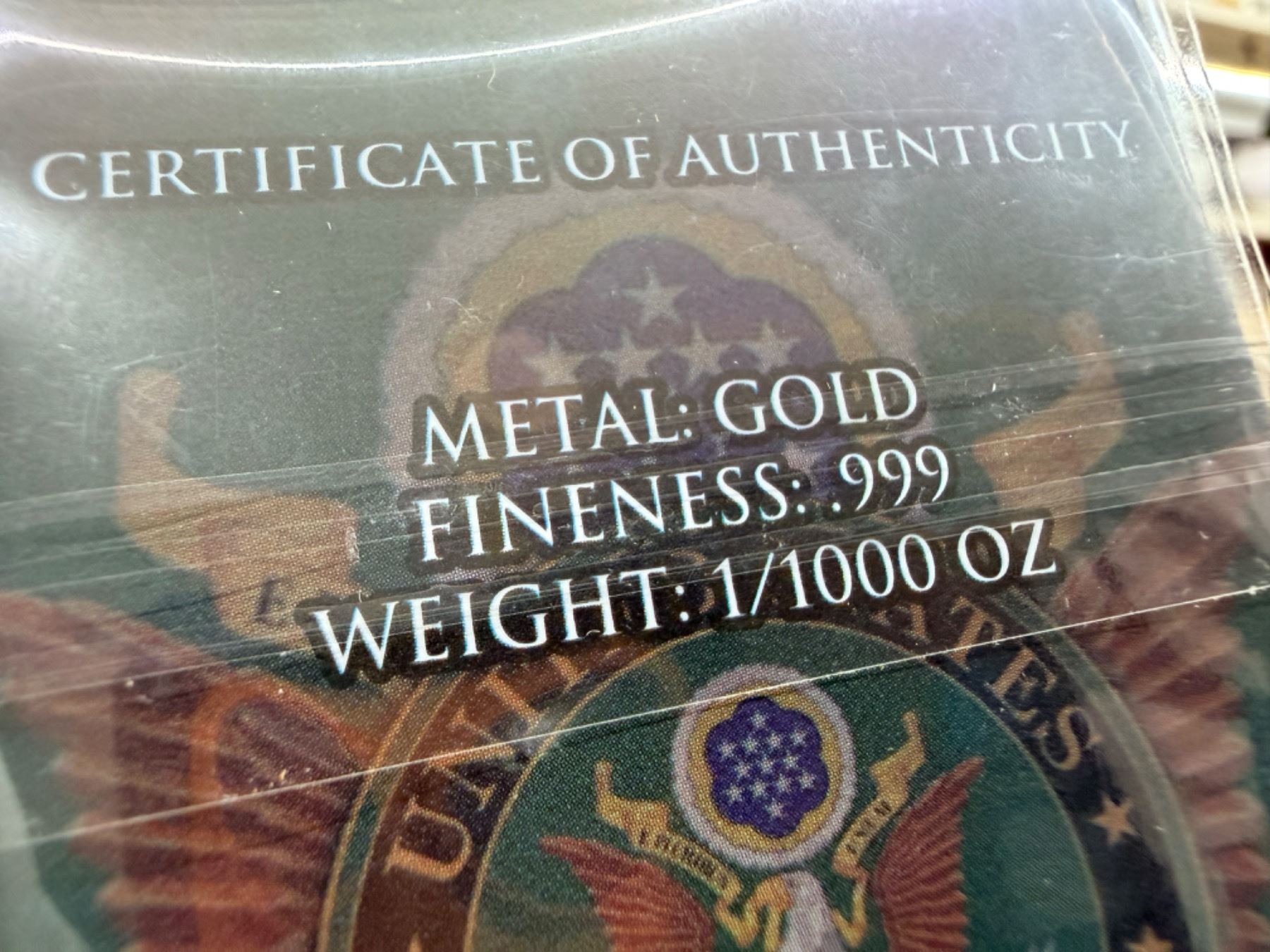 MADE OF .999 FINE GOLD WITH A PRECIOUS METAL CONTENT OF 1/1000 OUNCE. THIS BAR IS IN THE SHAPE OF A US ARMY TANK AND HAS AN AMERICAN BALD EAGLE ON THE REVERSE; IT IS MANUFACTURED IN THE UNITED STATES; IT IS A UNIQUE AND VALUABLE INVESTMENT PIECE FOR THOSE LOOKING TO ADD GOLD TO THEIR PORTFOLIO IN SMALL INCREMENTS