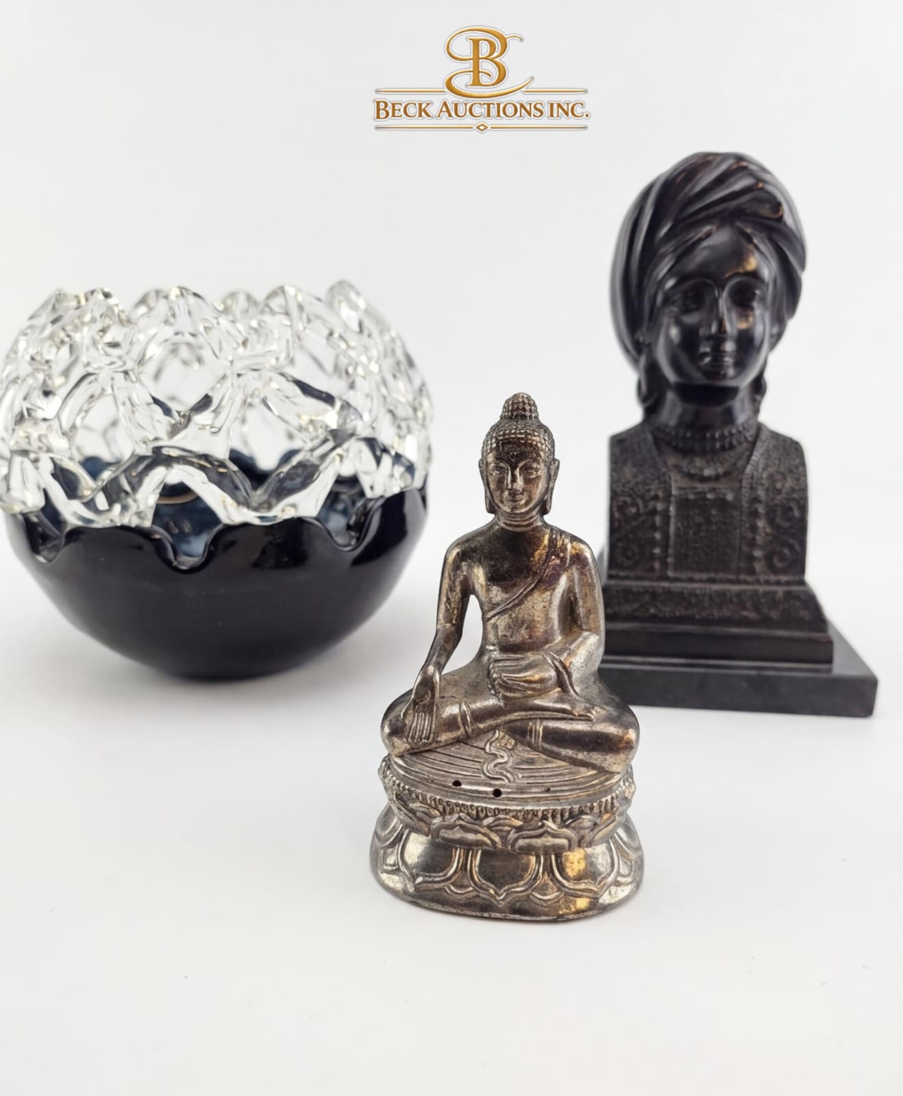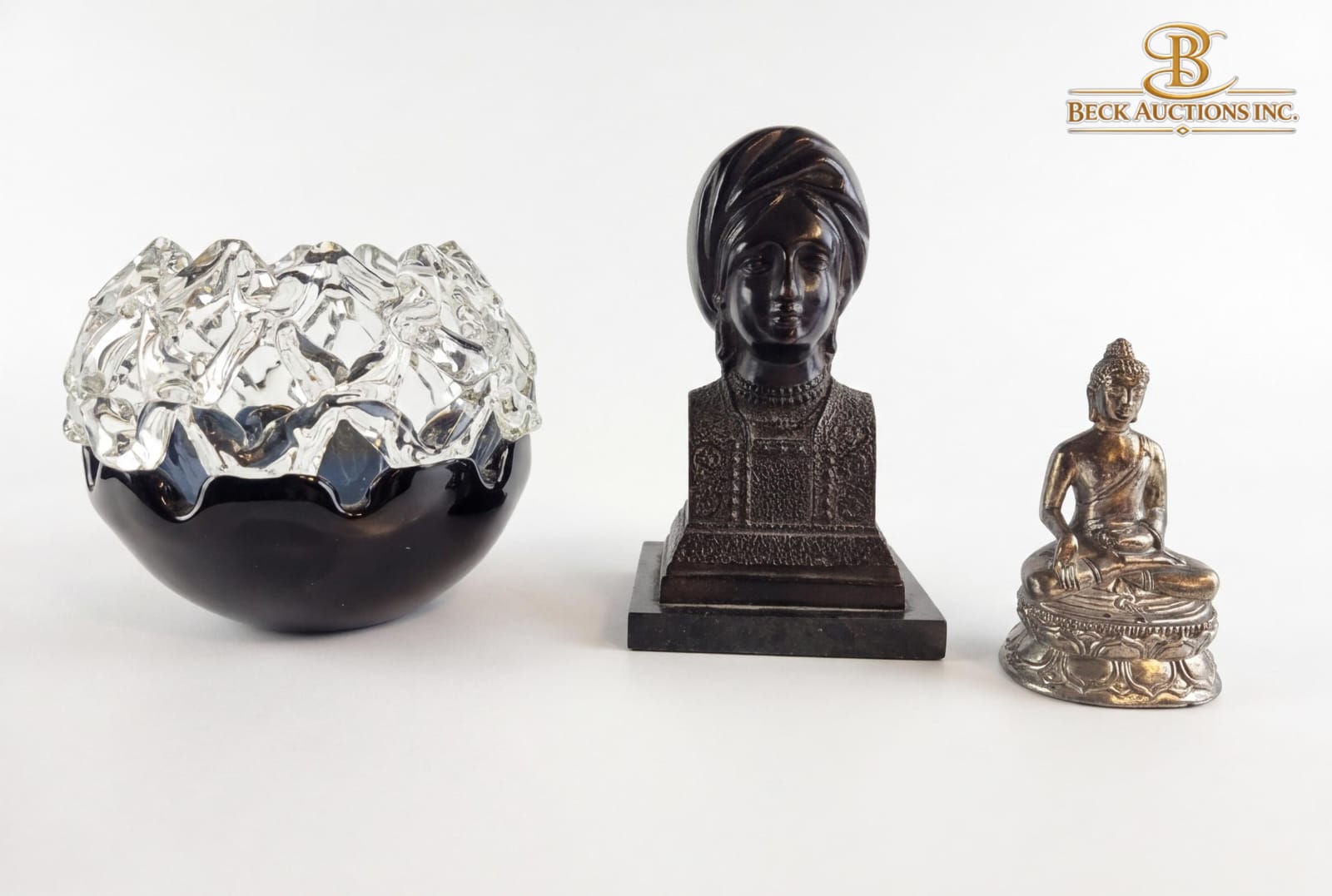 Art Glass Bowl Blue Glass Interior With A Clear 6''INCHES HEIGHT, Bronze Bust Of A Figure Wearing A Turban And An Ornate 8''INCHES HEIGHT, Tibetan-Style Buddha Figurine 5''INCHES HEIGHT