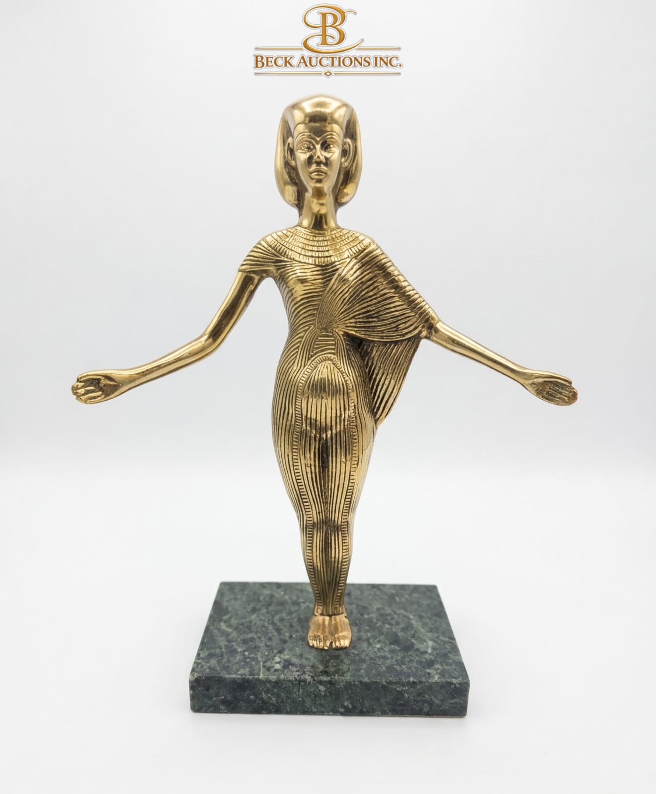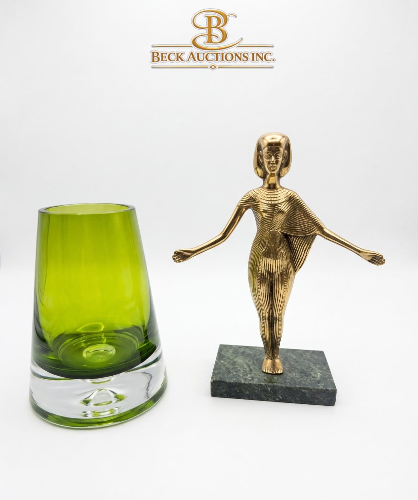 Lot 13 Decorative Sculpture Of The Egyptian Goddess Serket 9''INCHES HEIGHT, Green Glass Vase A Clear.