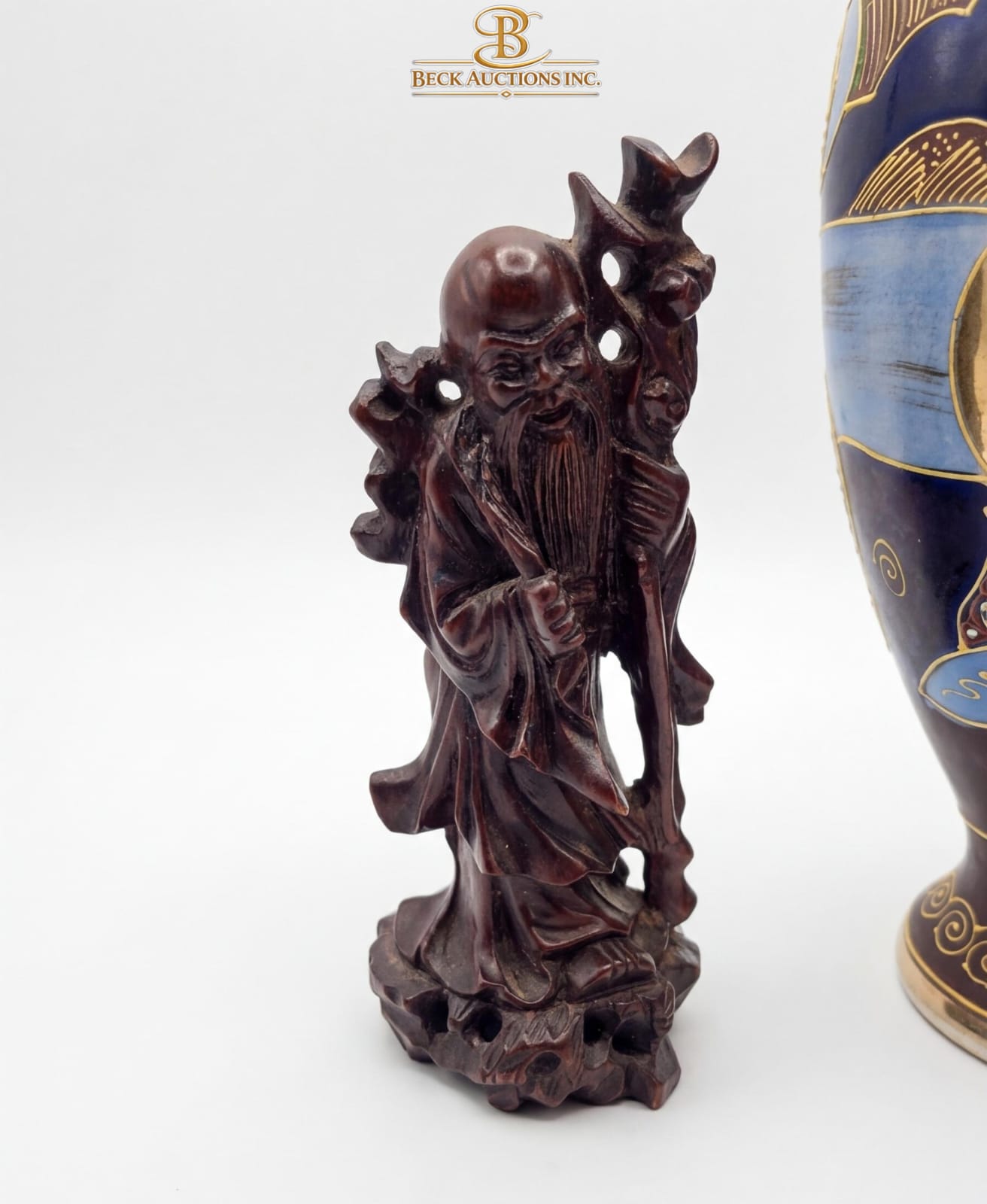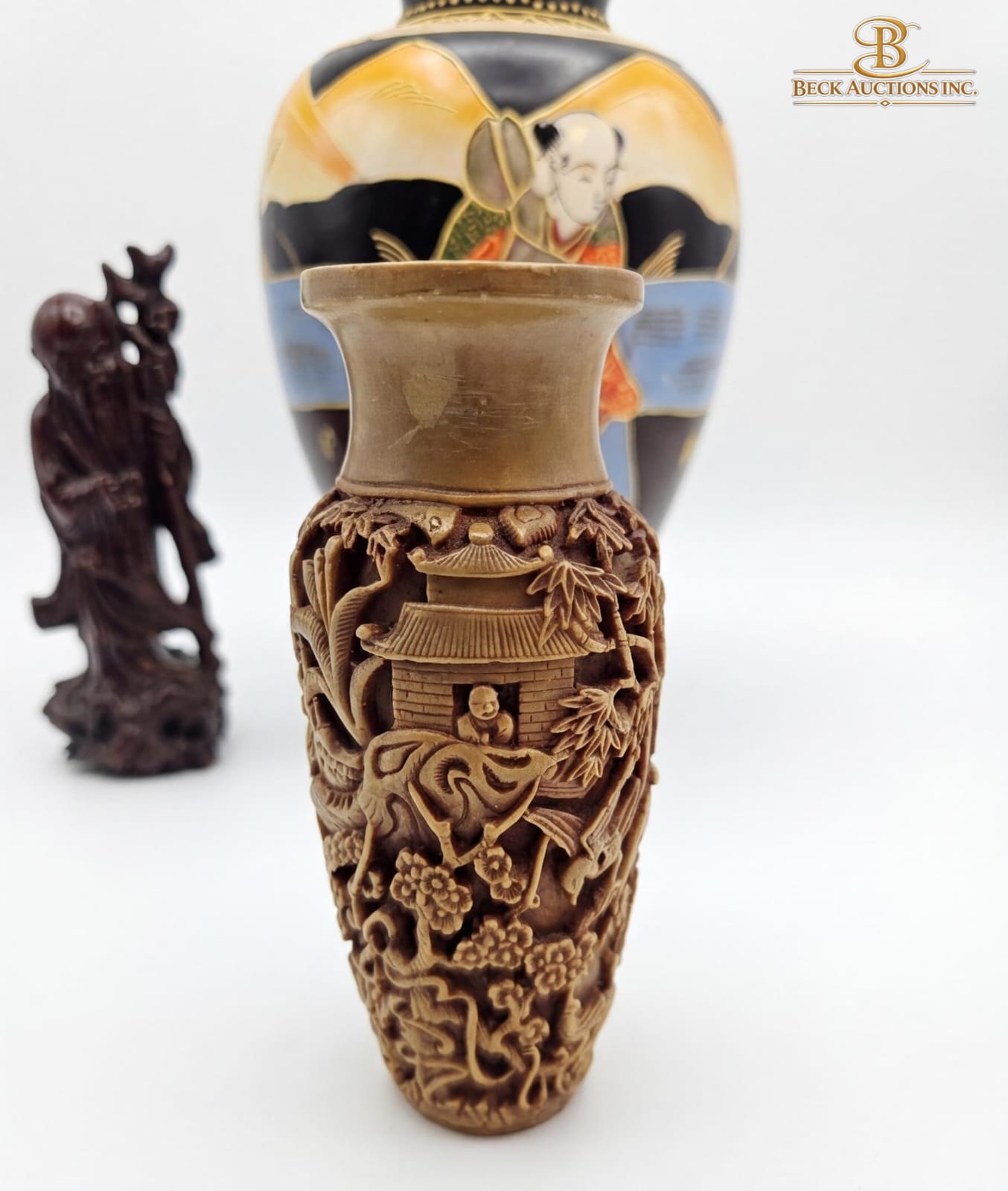 Lot 14 Satsuma Pottery Vase 10''HEIGHT, Asian-Style Carved Resin , Chinese Wood Carving Of Shou Lao.