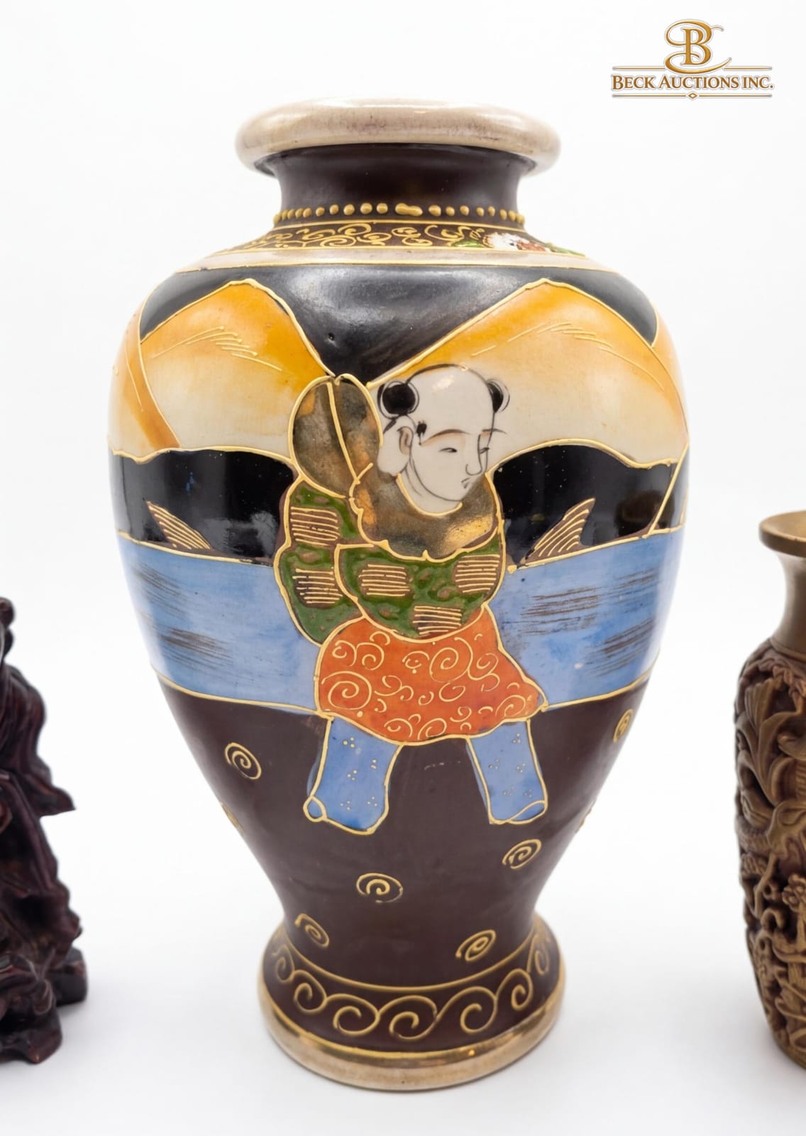 Collection Of Japanese Decorative Items, Satsuma Pottery Vase 10''HEIGHT, Asian-Style Carved Resin , Chinese Wood Carving Of Shou Lao.