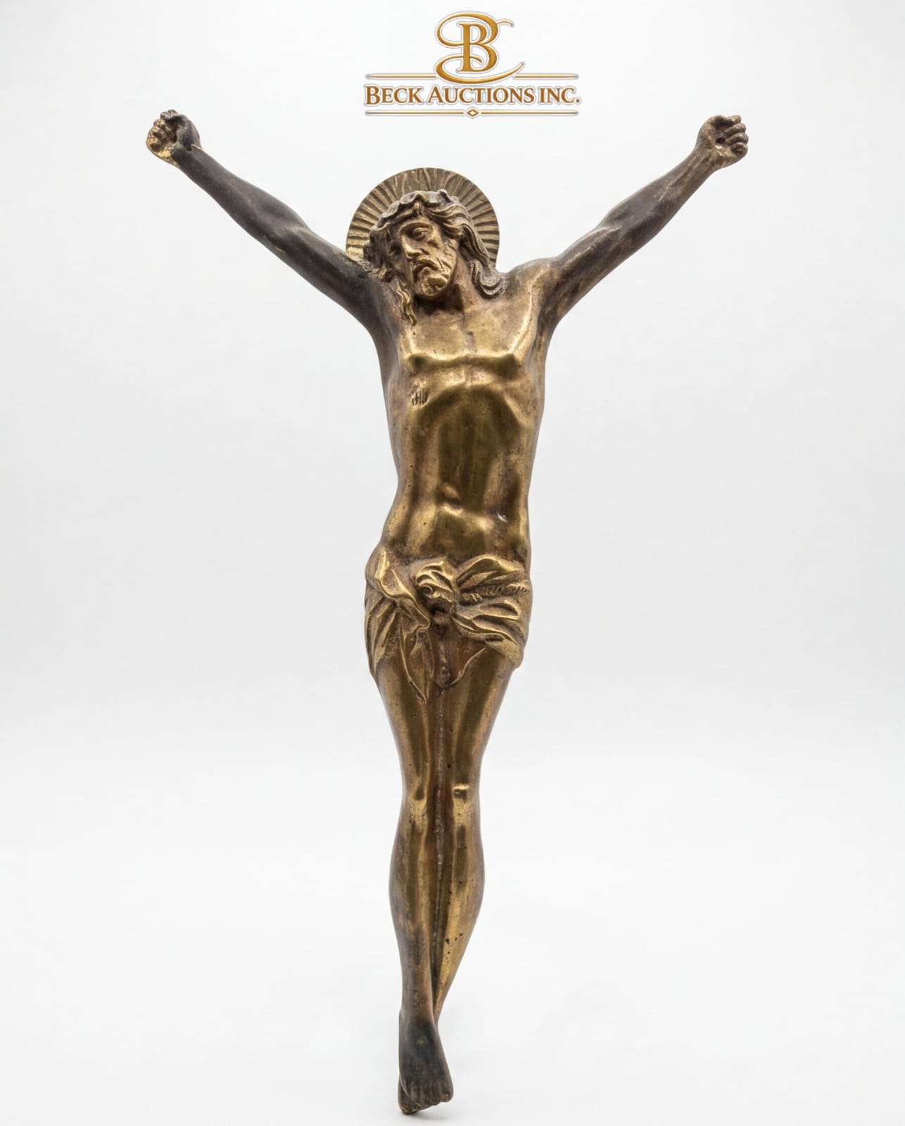 Lot 15 Vintage Bronze Crucifix Figure Of Jesus Christ Alongside A Blue Iridescent Glass Vase And More