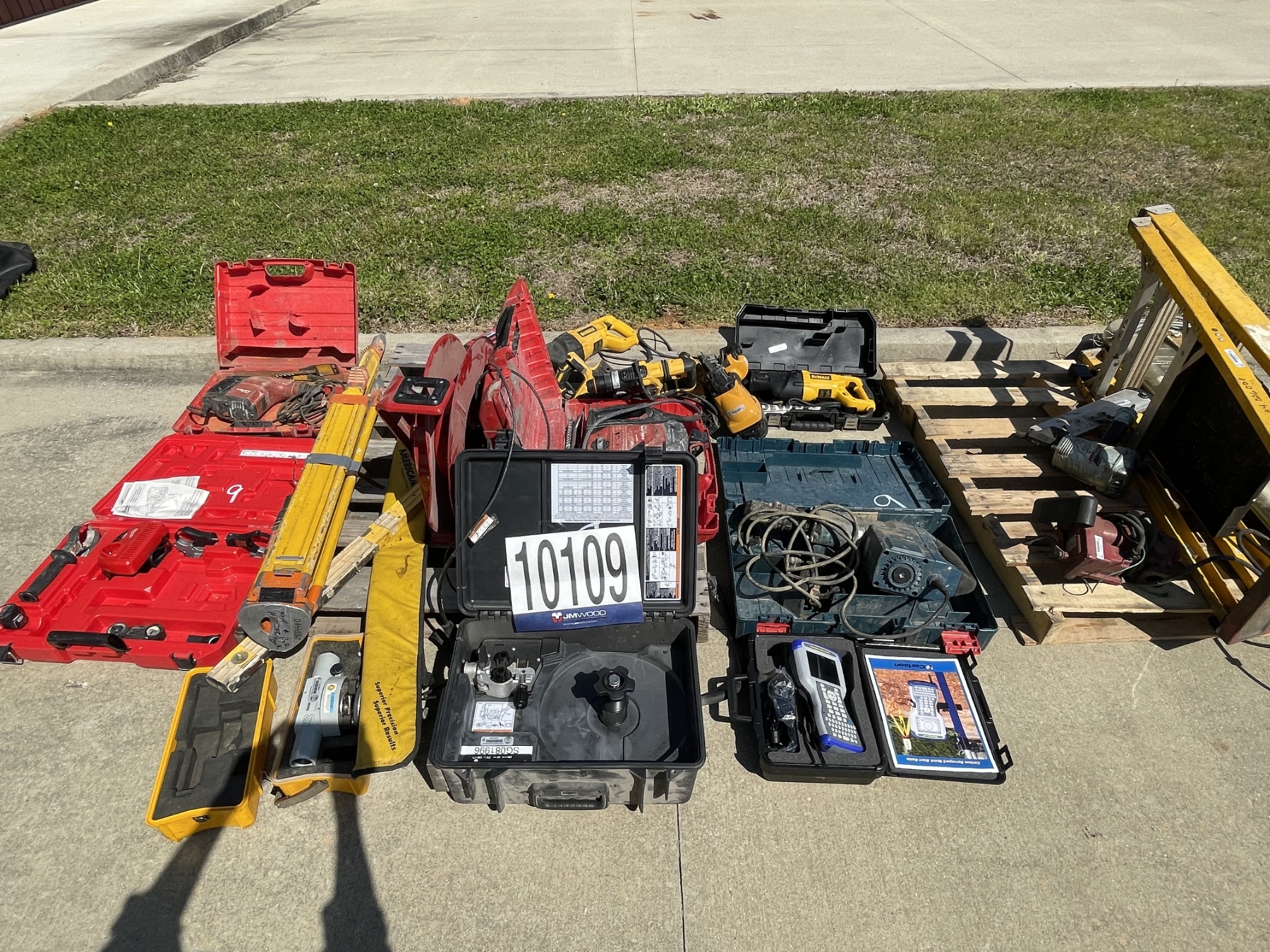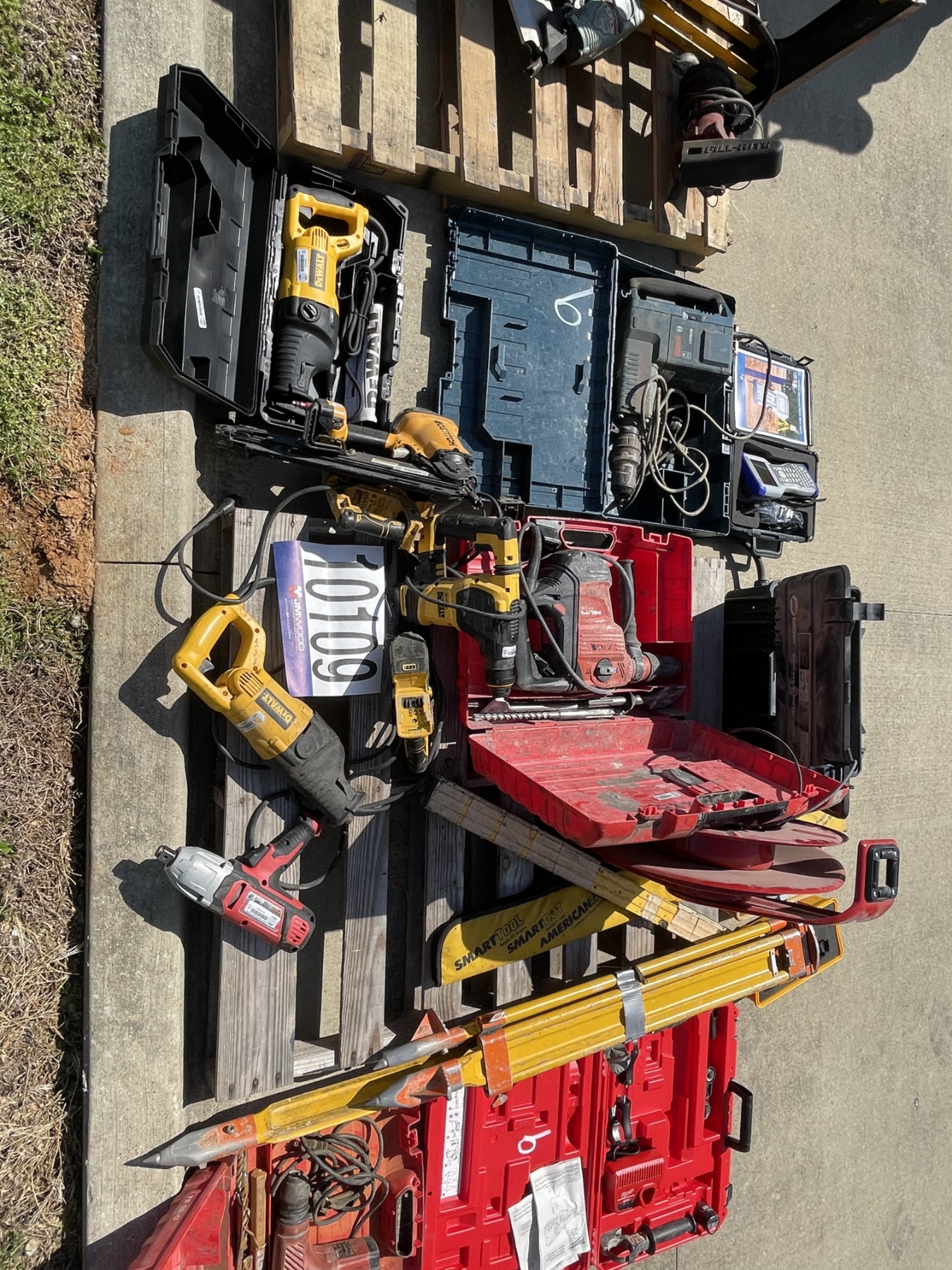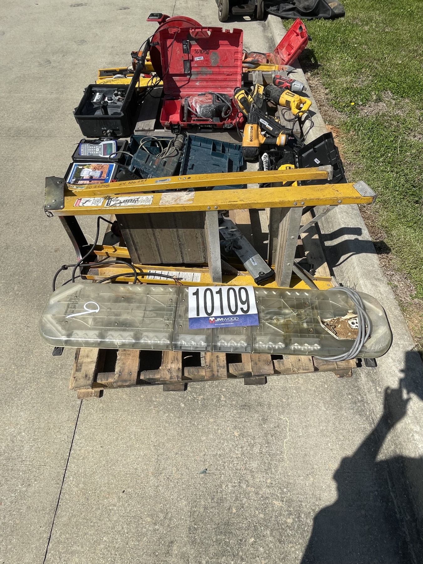 light bar, step ladder, hose reel, tripod, mail gun, impact wrench, hammer drills, reciprocating saws, Selling Offsite: Located in Fayette, AL