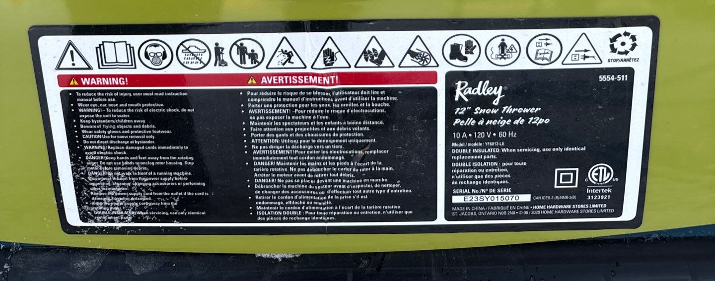 Lot 12 Radley 12' Electric Snow Thrower