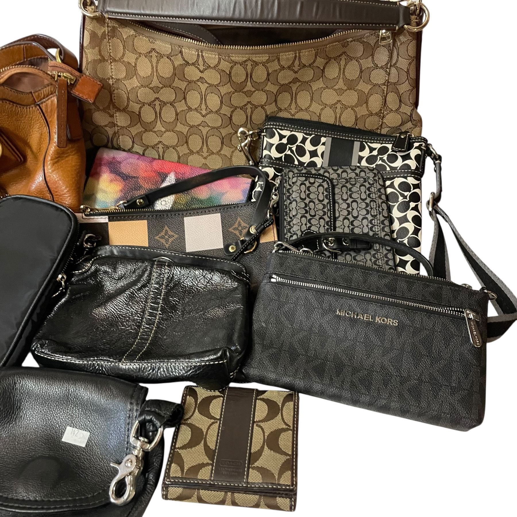 Large Group of Purses and Wallets * Coach, Steve Madden, Michael Kors, Luis Vuitton Replicas * Fossil and more (We have not authenticated them, come and take a look)