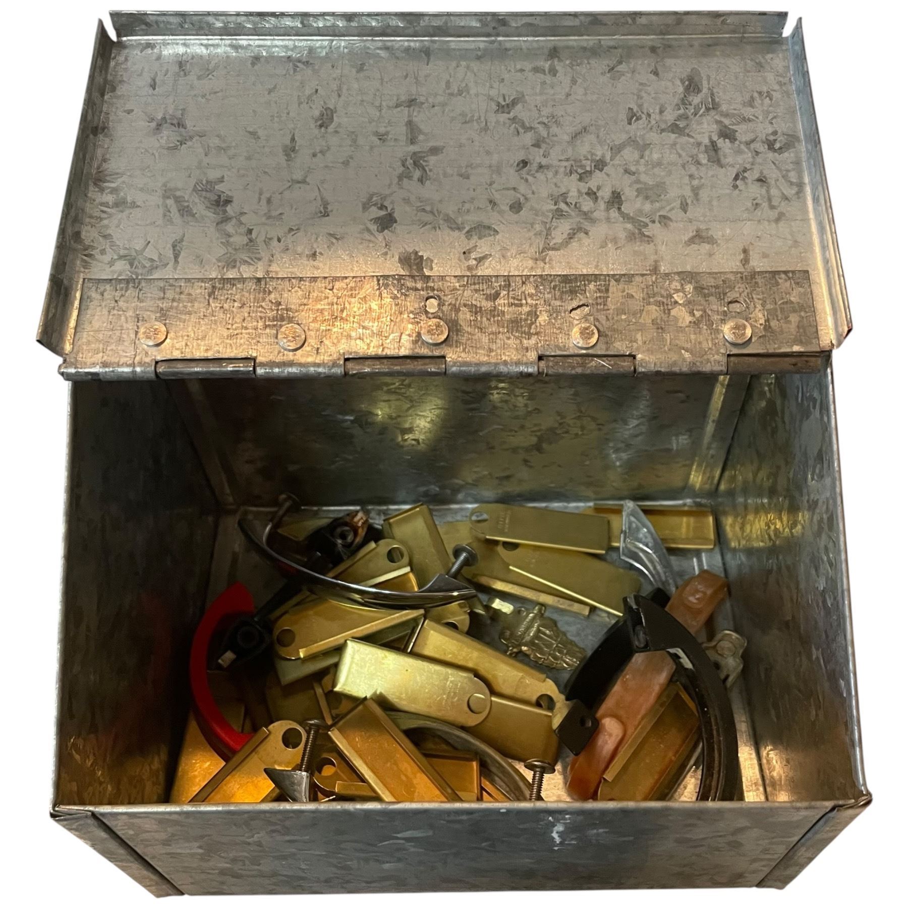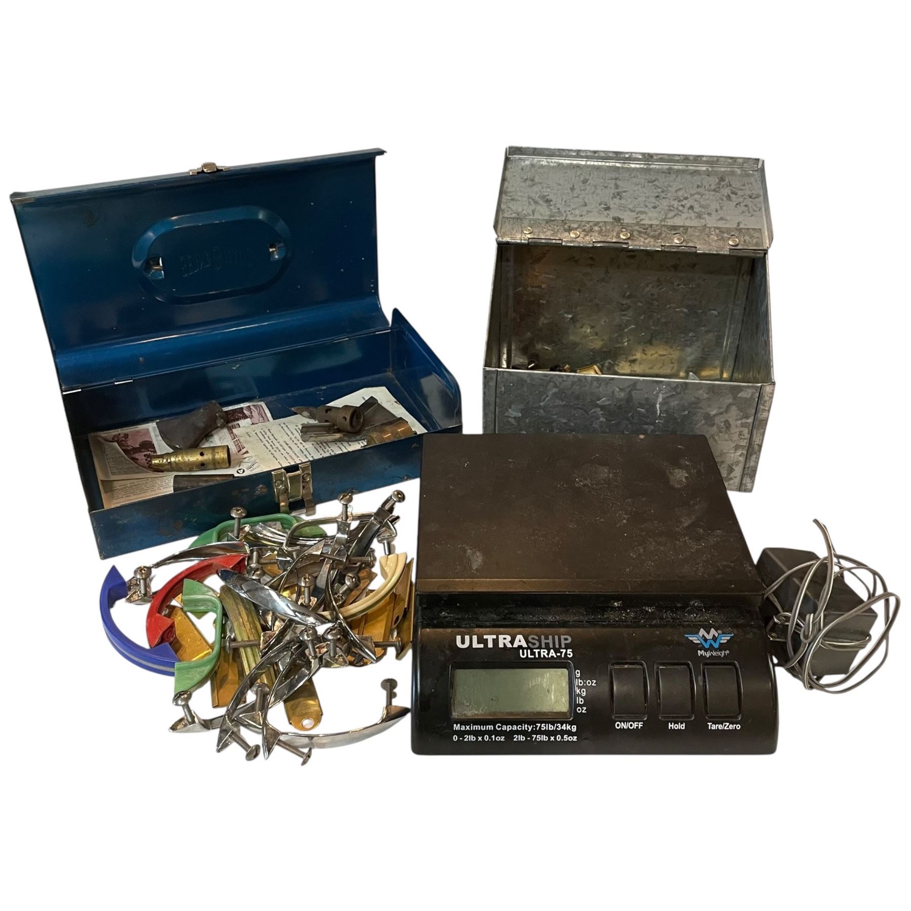 Lot 264 Group of Drawer Pulls, Small Boxes, Shipping Scale and Tools