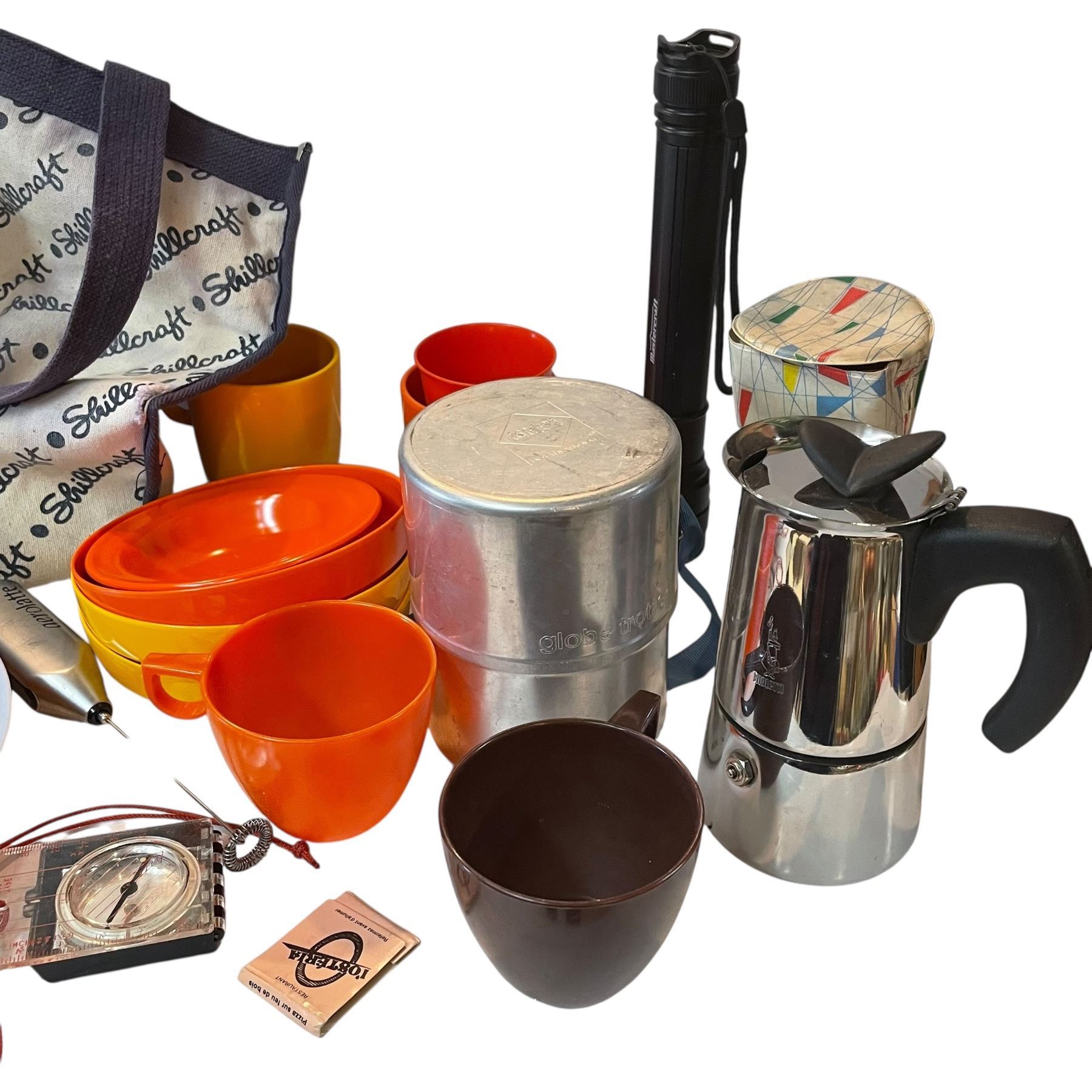 Shelf lot of Camping and Household Goods * Flashlight, compass, milk frothier, dishes & more