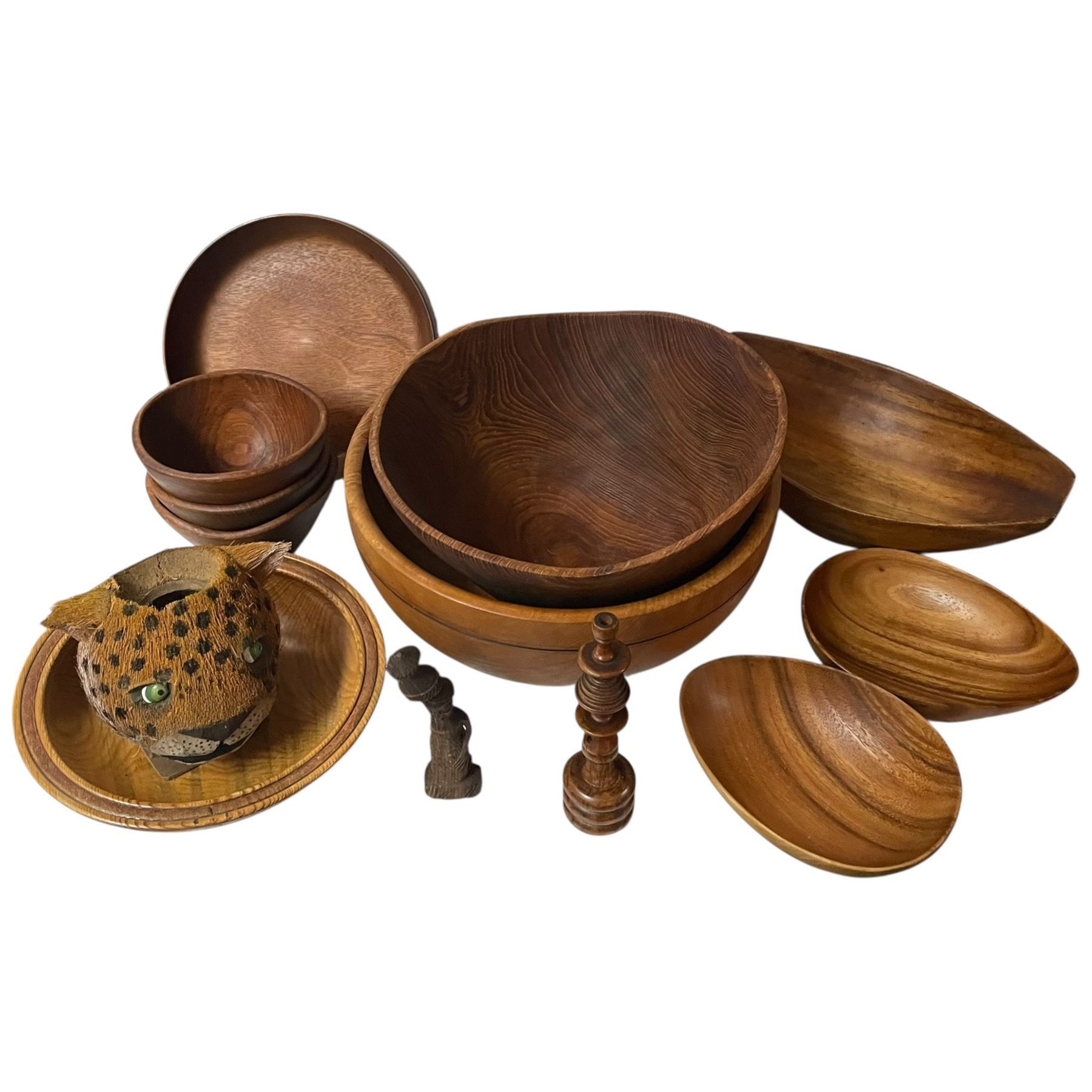 Shelf of Carved Wood Bowls, Figurines and a Coconut Head Leopard