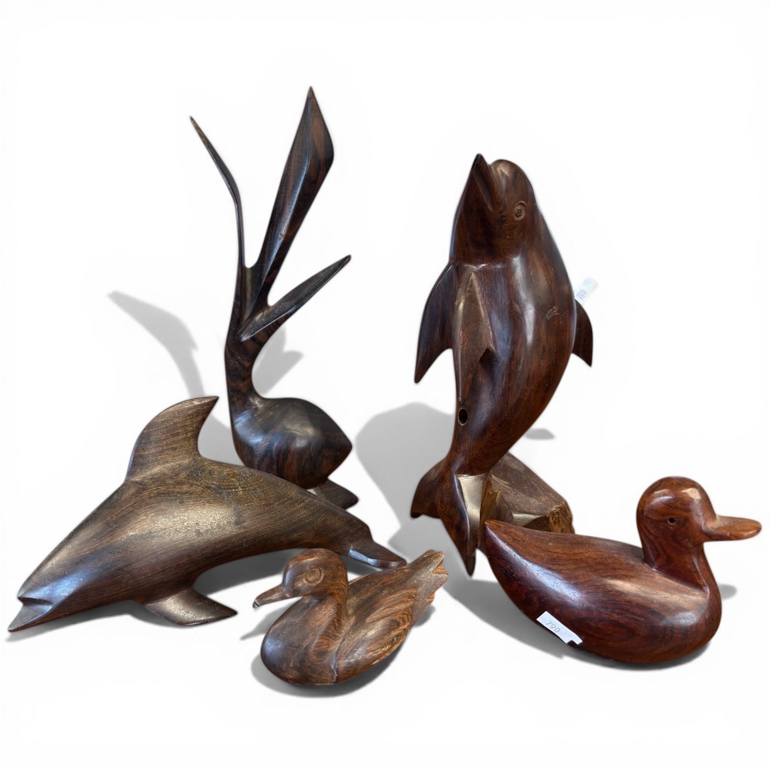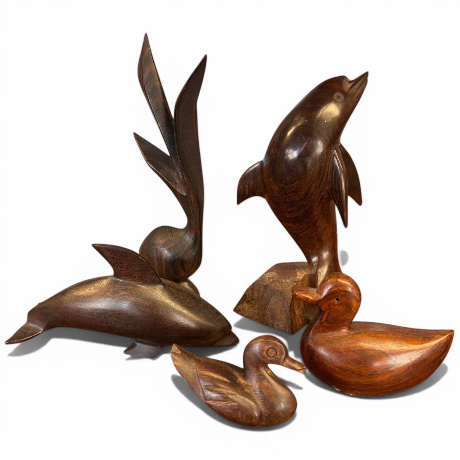 5 Carved Wood Fish & Duck Carvings * Largest is the 4" x 4" x 8" tall dolphin