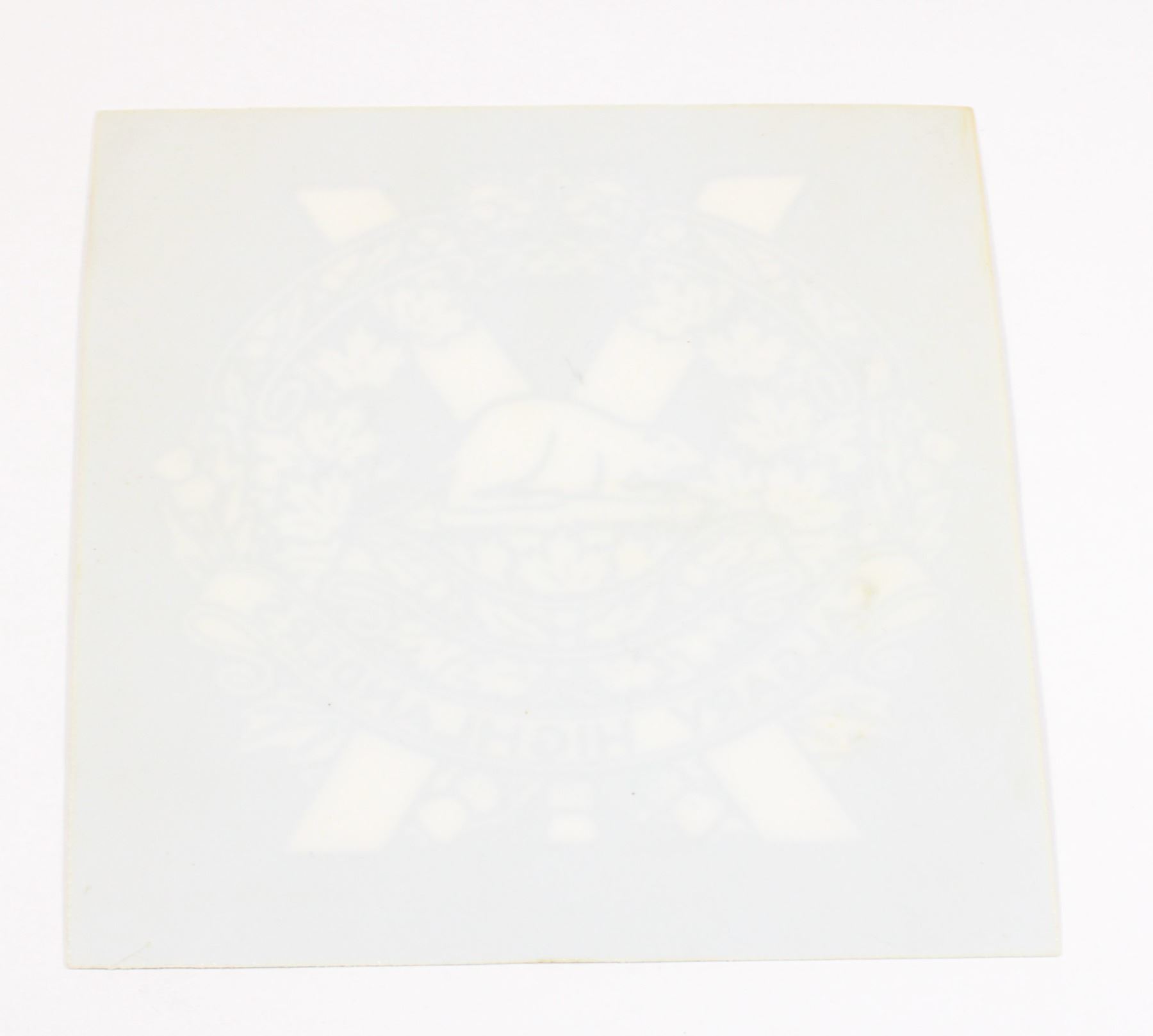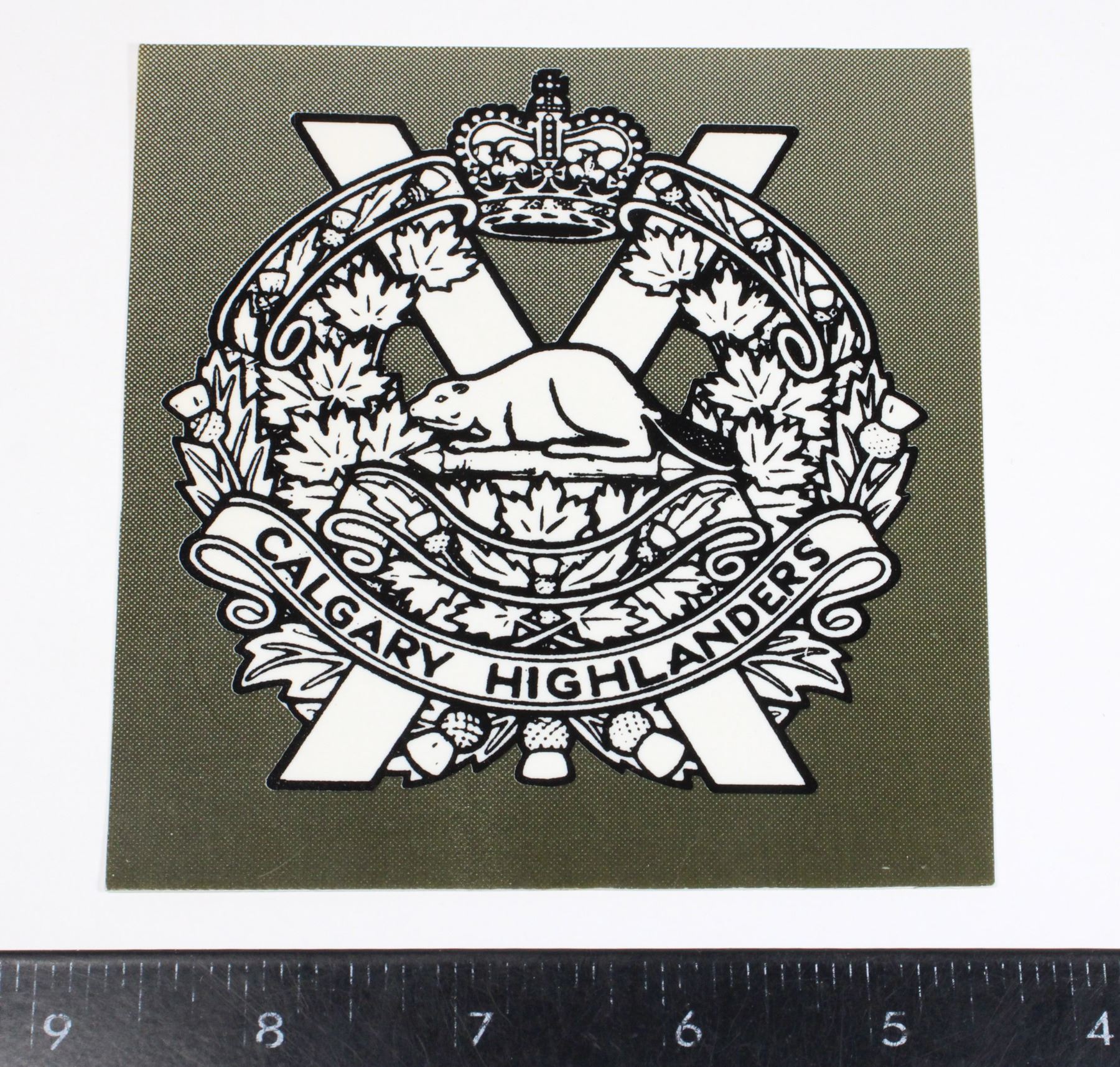 Small flexible plastic sign measures 4.5 x 4.5 inches in size, appears cut from larger thin plastic display- depicts Calgary Highlanders Queen's Crown Cap Badge- Canadian Allied Forces Insignia